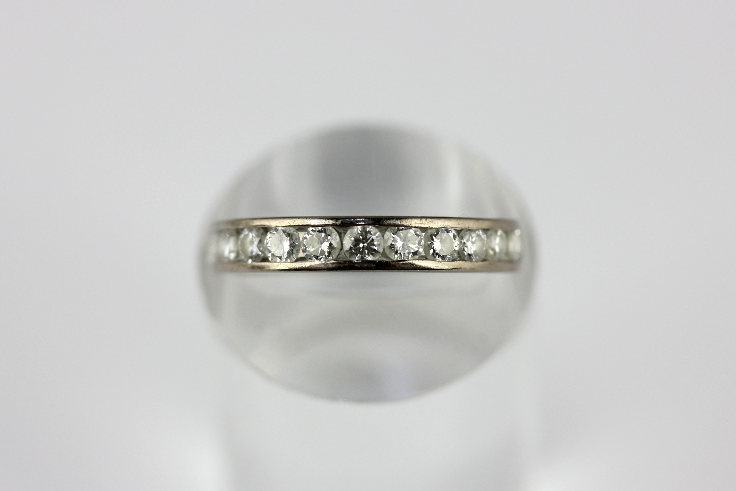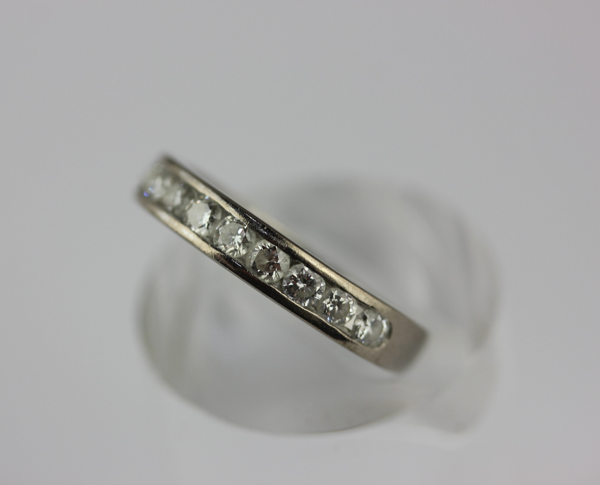 An 18ct white gold and diamond half hooped ring mounted with a row of twelve brilliant cut diamonds, size P and a half, gross weight 4.4g, with a certificate card and insurance valuation.