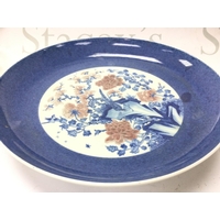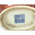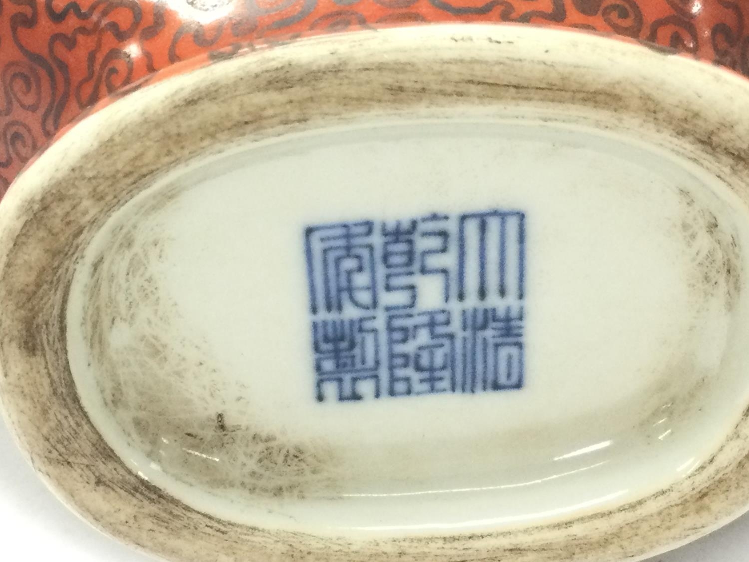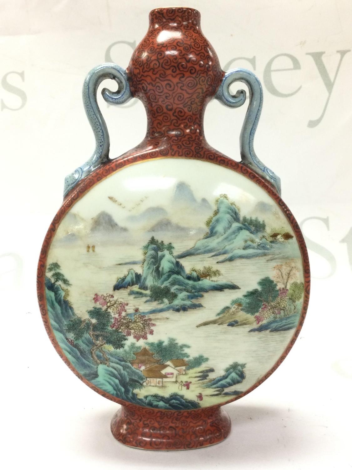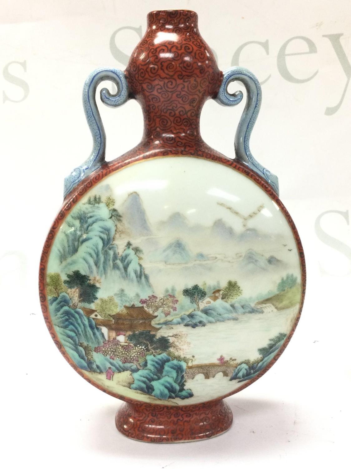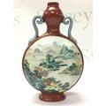A Chinese moon flask vase with painted panel landscape scene design , 21cm tall. This lot cannot be posted