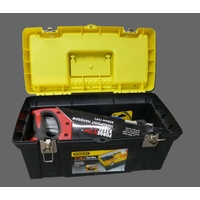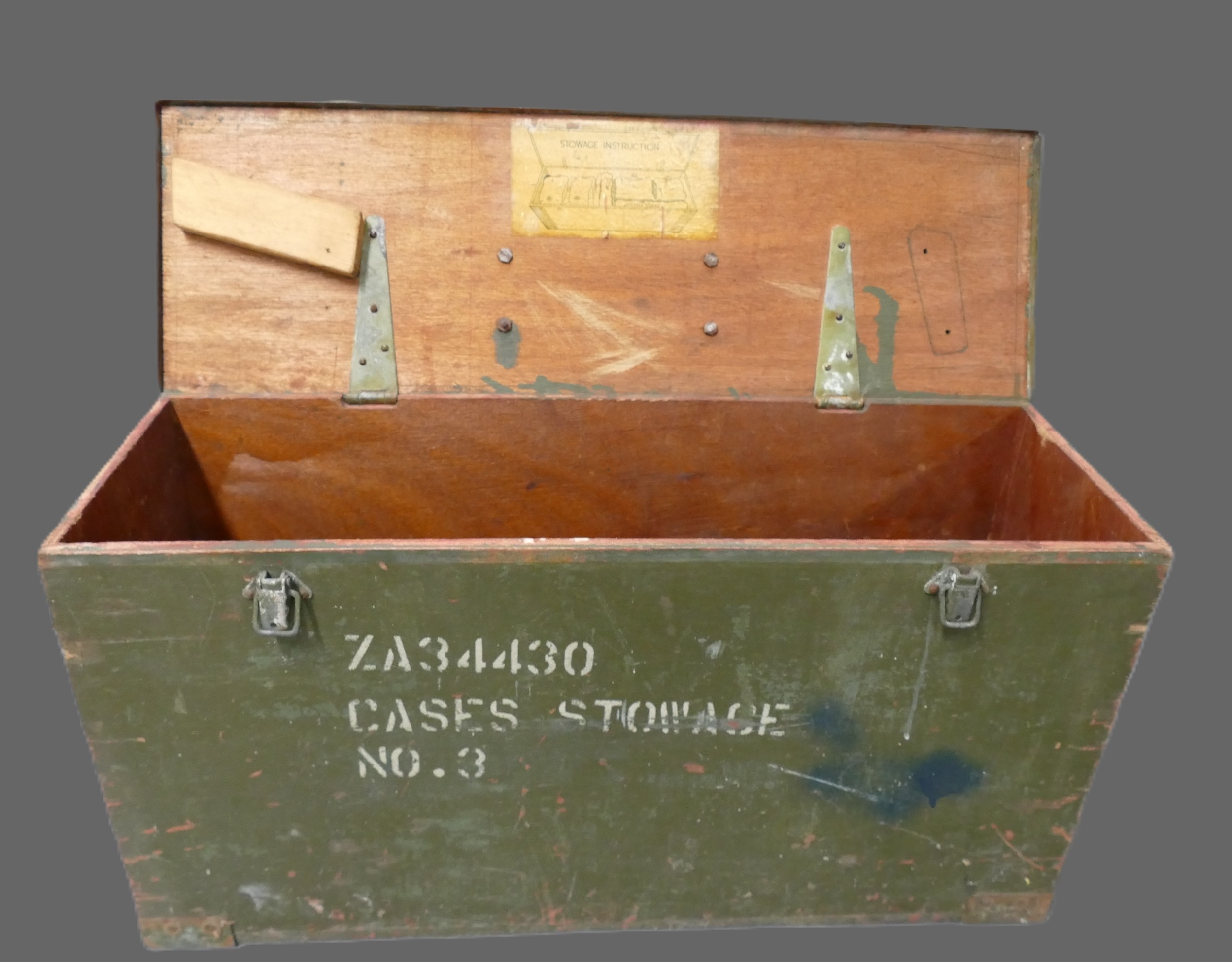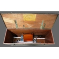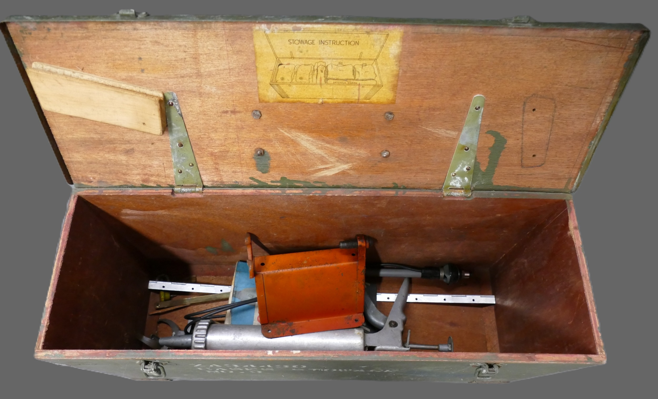Vintage British wooden ammunition box used as a toolbox, containing a small amount of tools, measuring 65cm wide, 22cm deep, 33cm high.