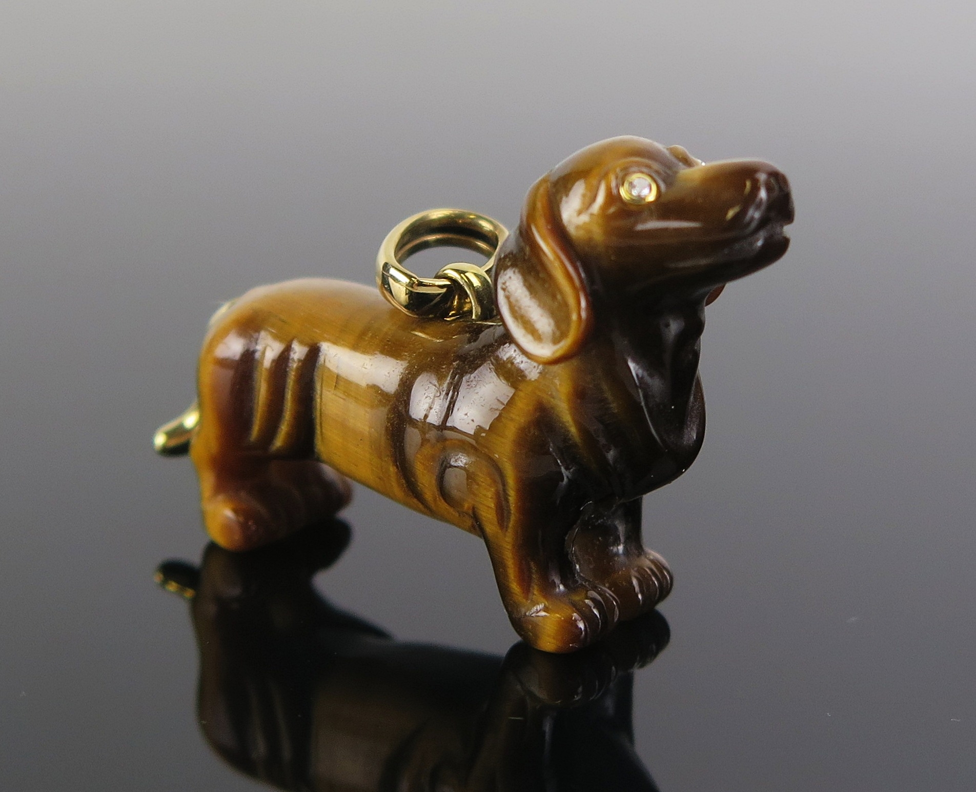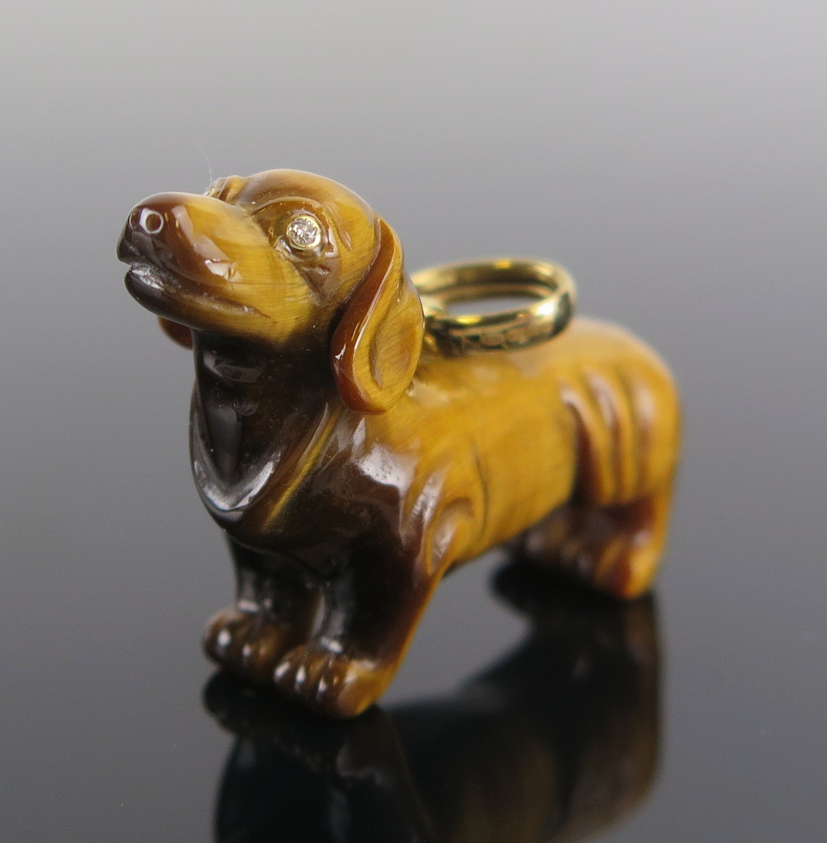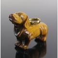 A Braybrook & Britten tiger's eye dachshund pendant with diamond set eyes and 18ct gold tail and mounts, 35mm long, 7.1g. In original box