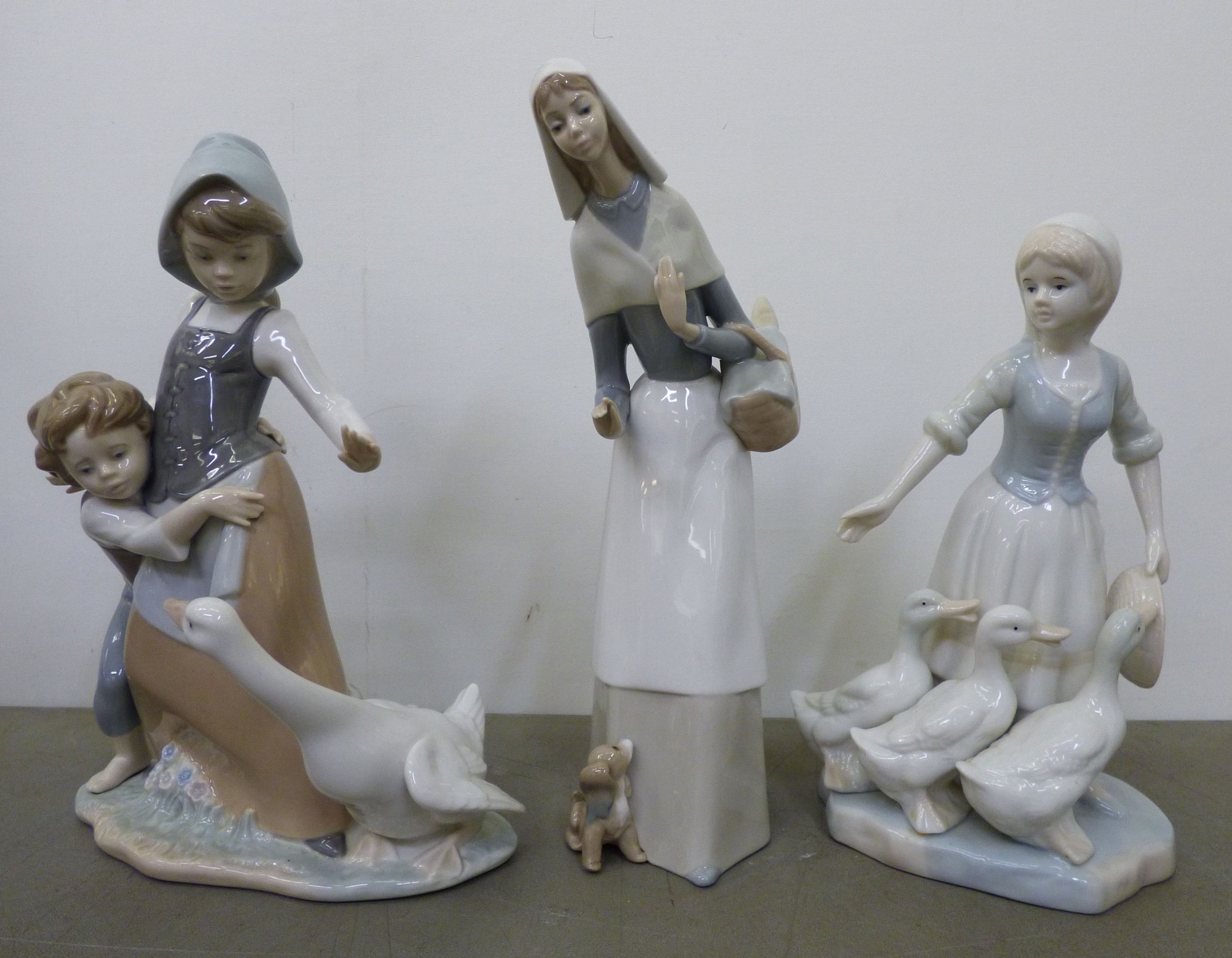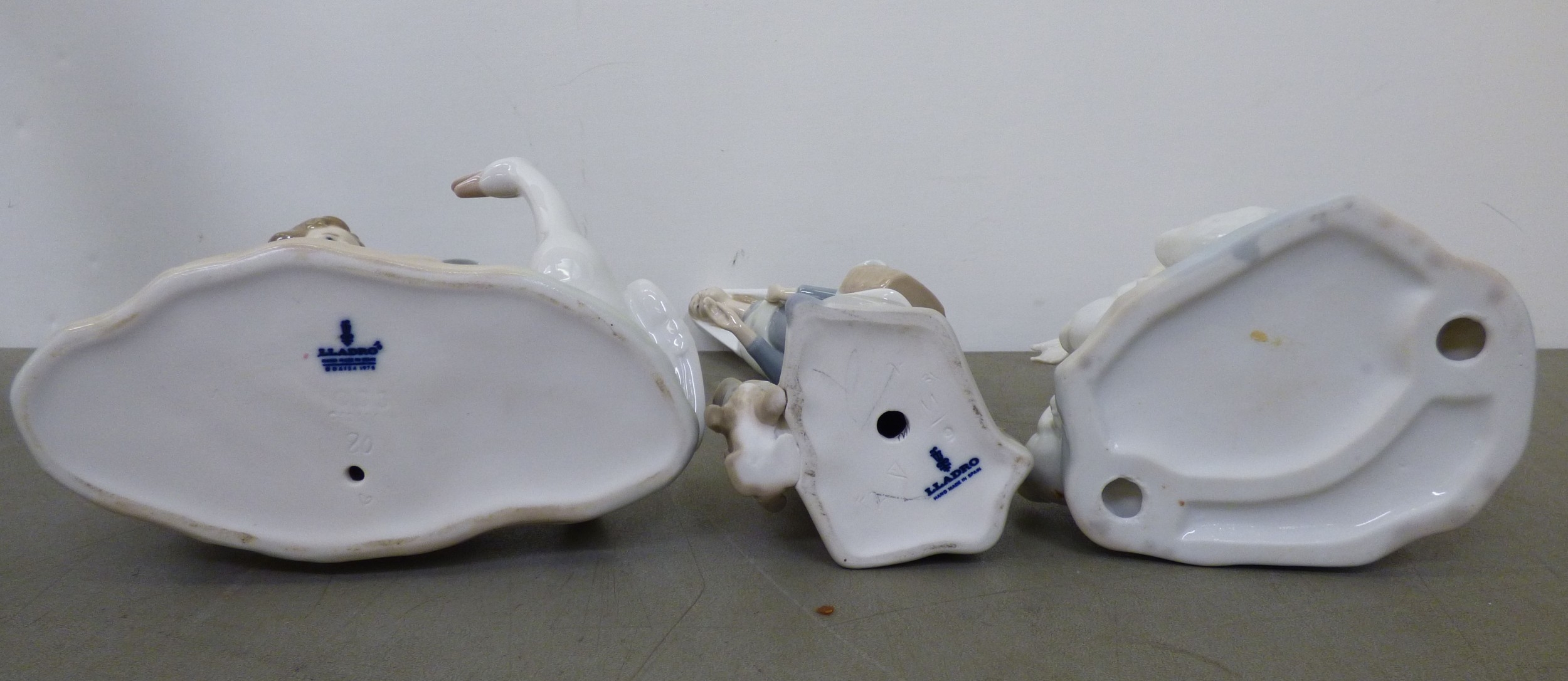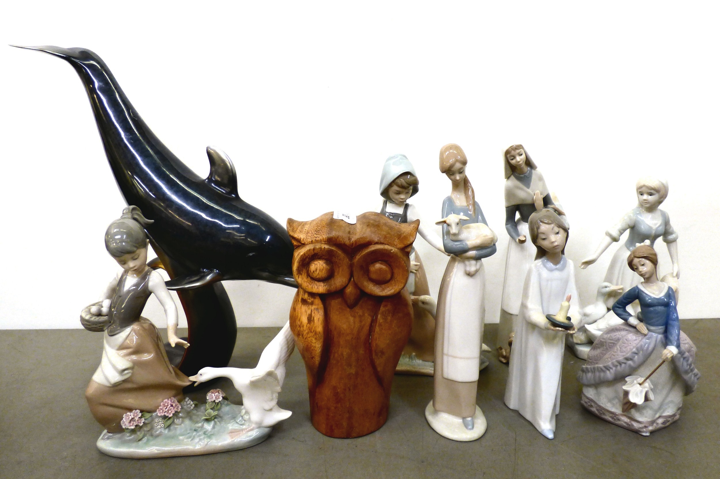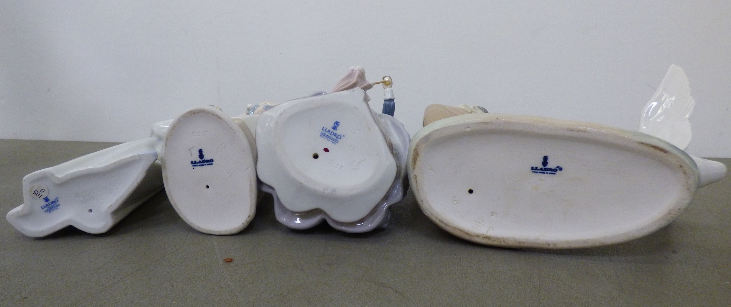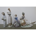 Decorative items: to include six Lladro porcelain figures, featuring a girl being chased by a swan 7"h