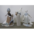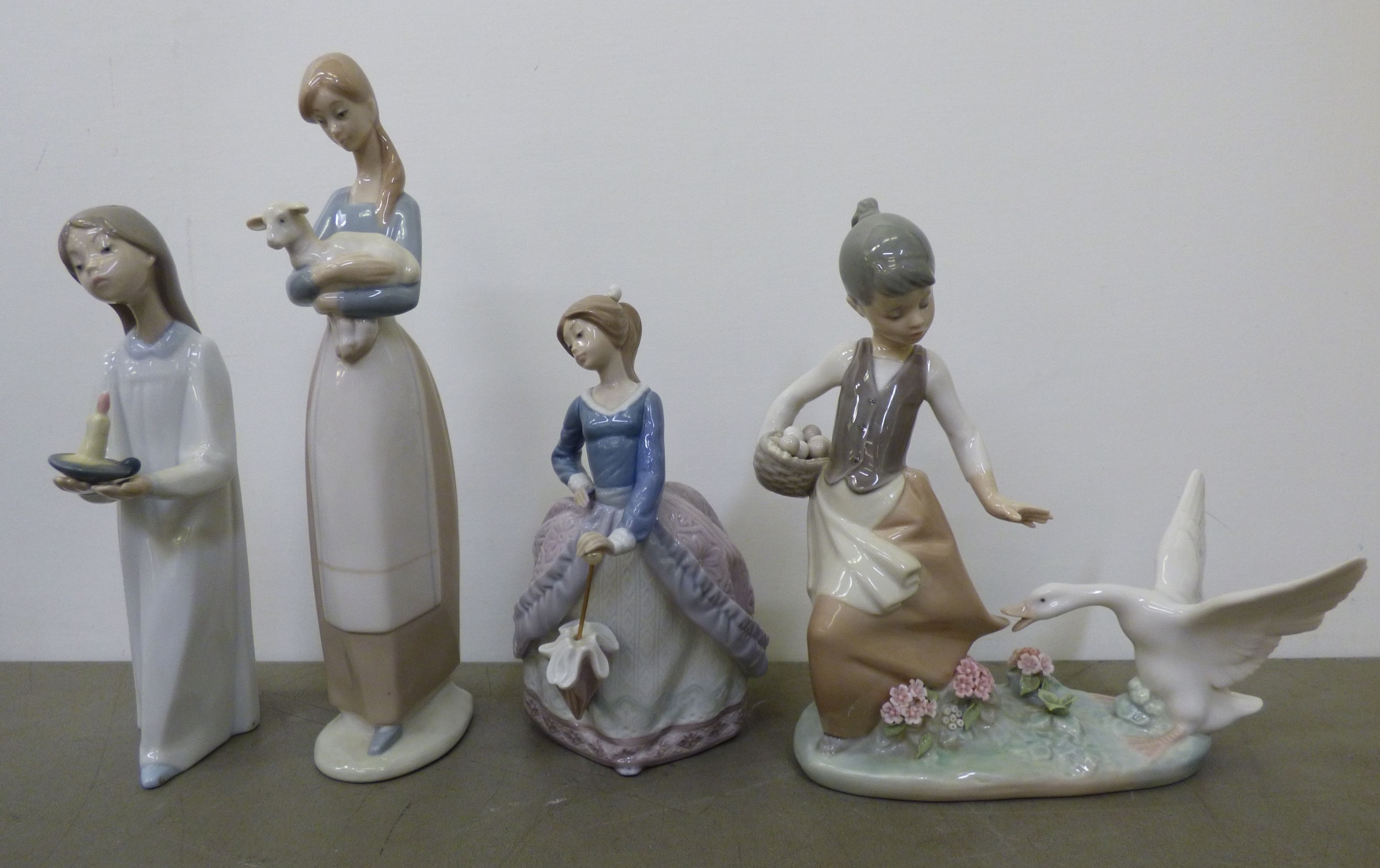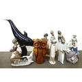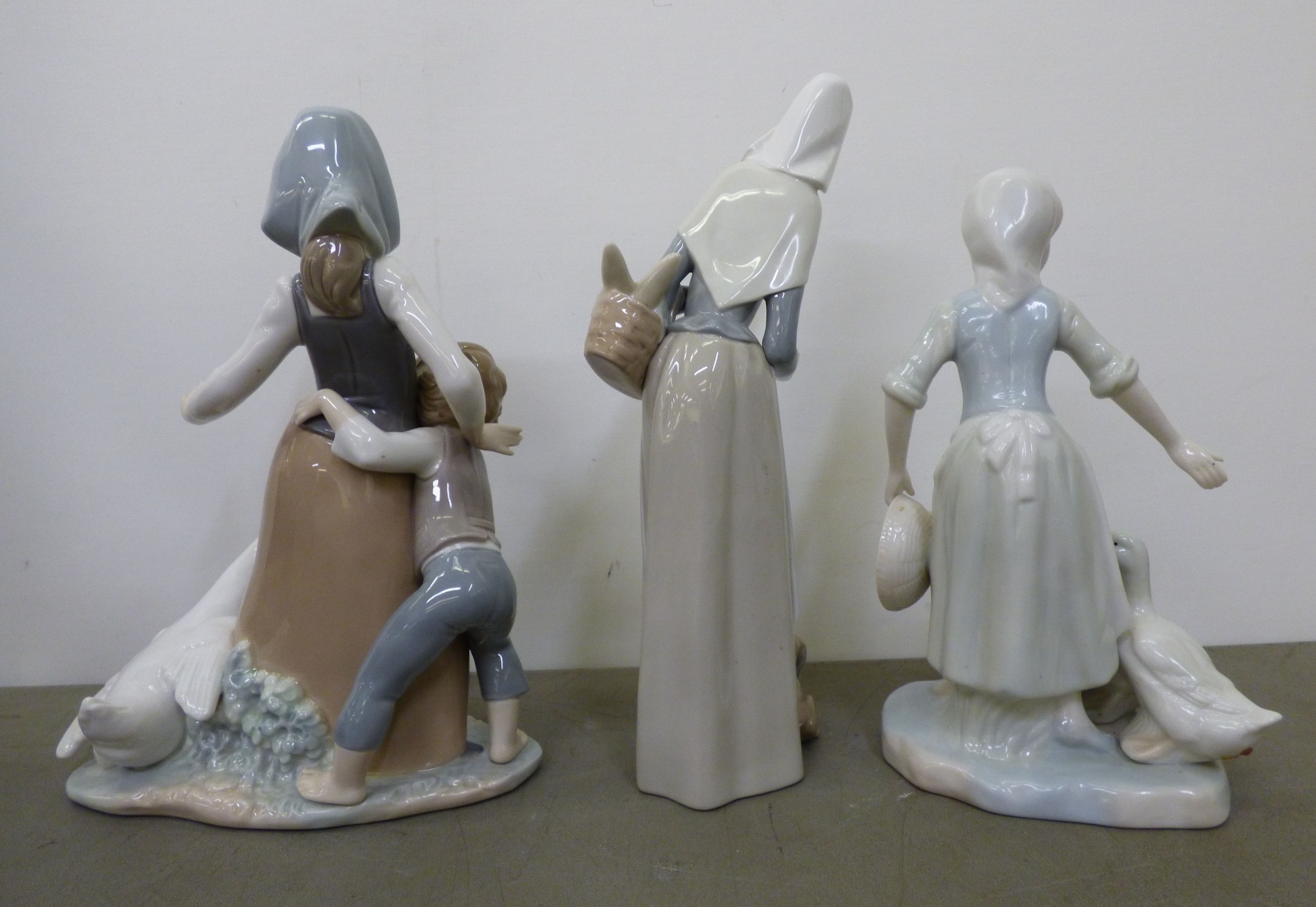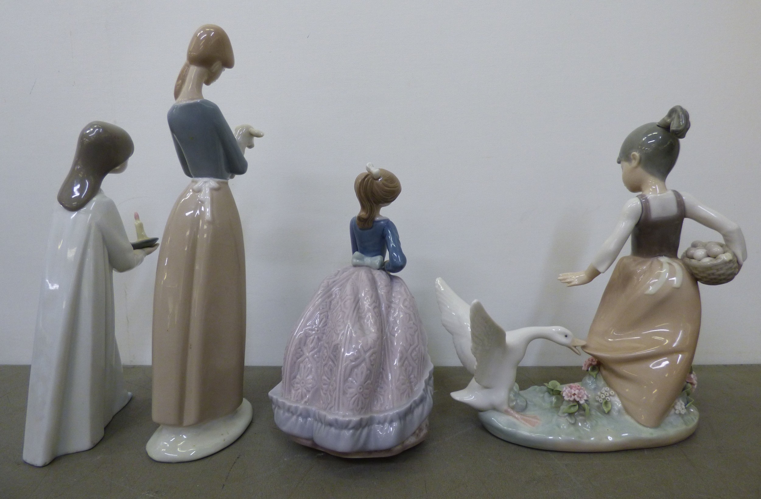 Decorative items: to include six Lladro porcelain figures, featuring a girl being chased by a swan 7"h