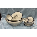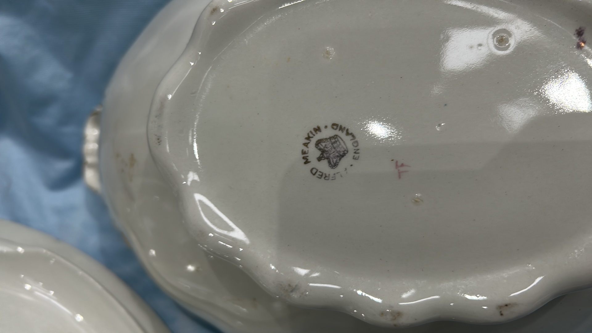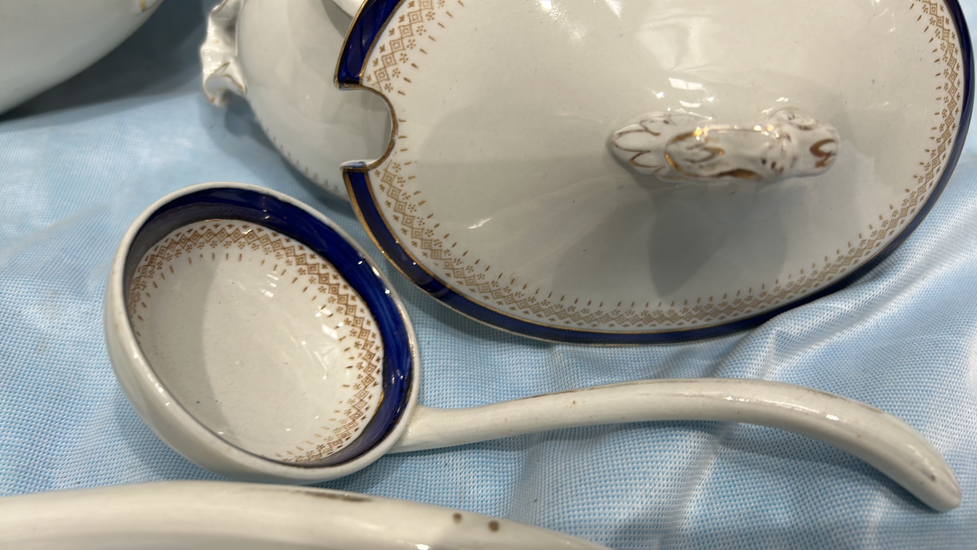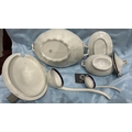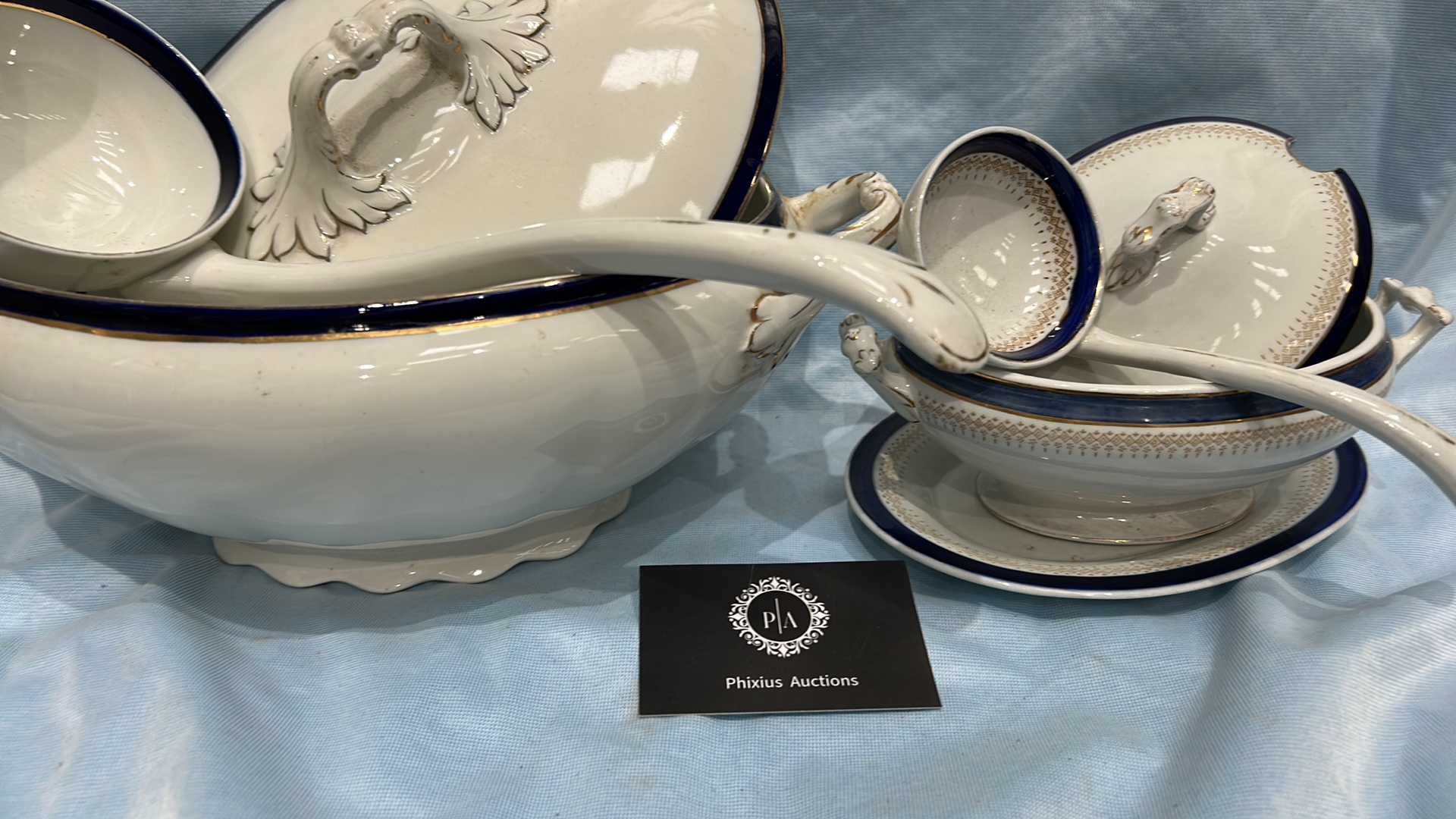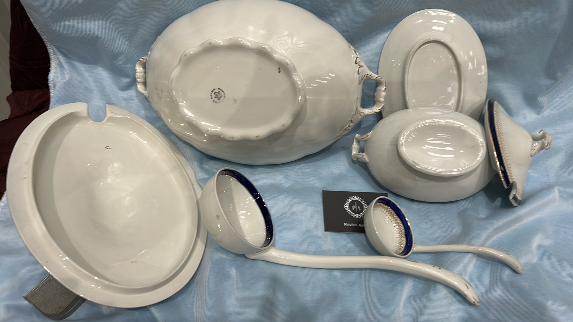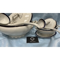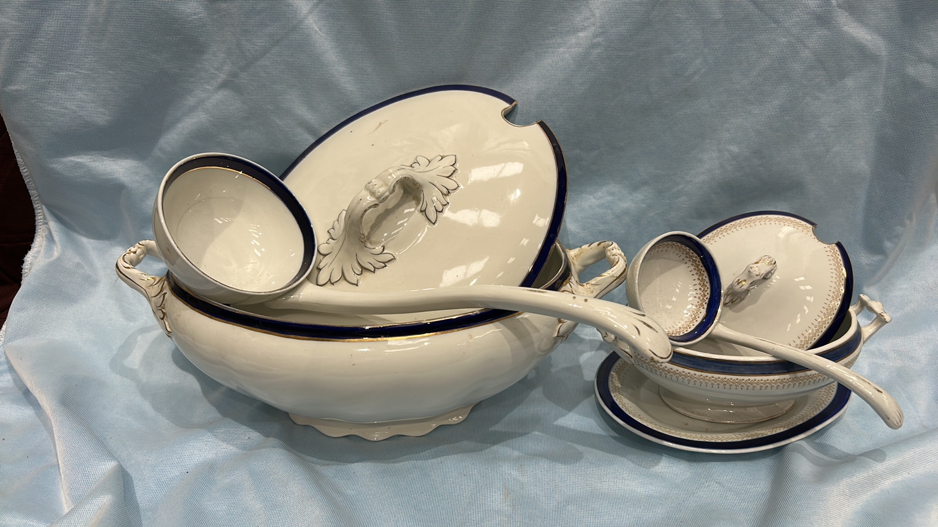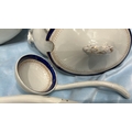 Set of 2 white ironstone tureens with lids, matching ladles and underplate, cobalt-blue and gilt banded, J & G Meakin, England, early 20th century.
