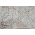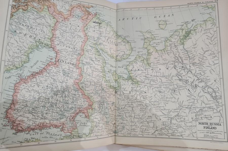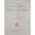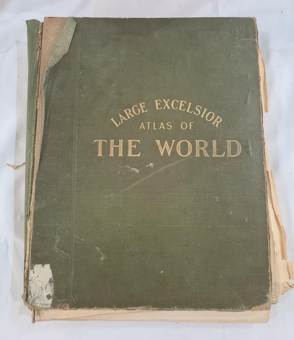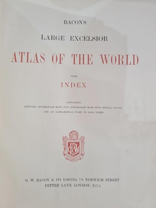 "Bacon's Large Excelsior Atlas of the World with index ...", G W Bacon & Co, Fetter Lane, quantity of double-paged colour maps, binding loose, index loose, front board detached, backstrip missing, folio