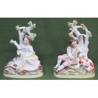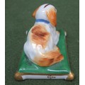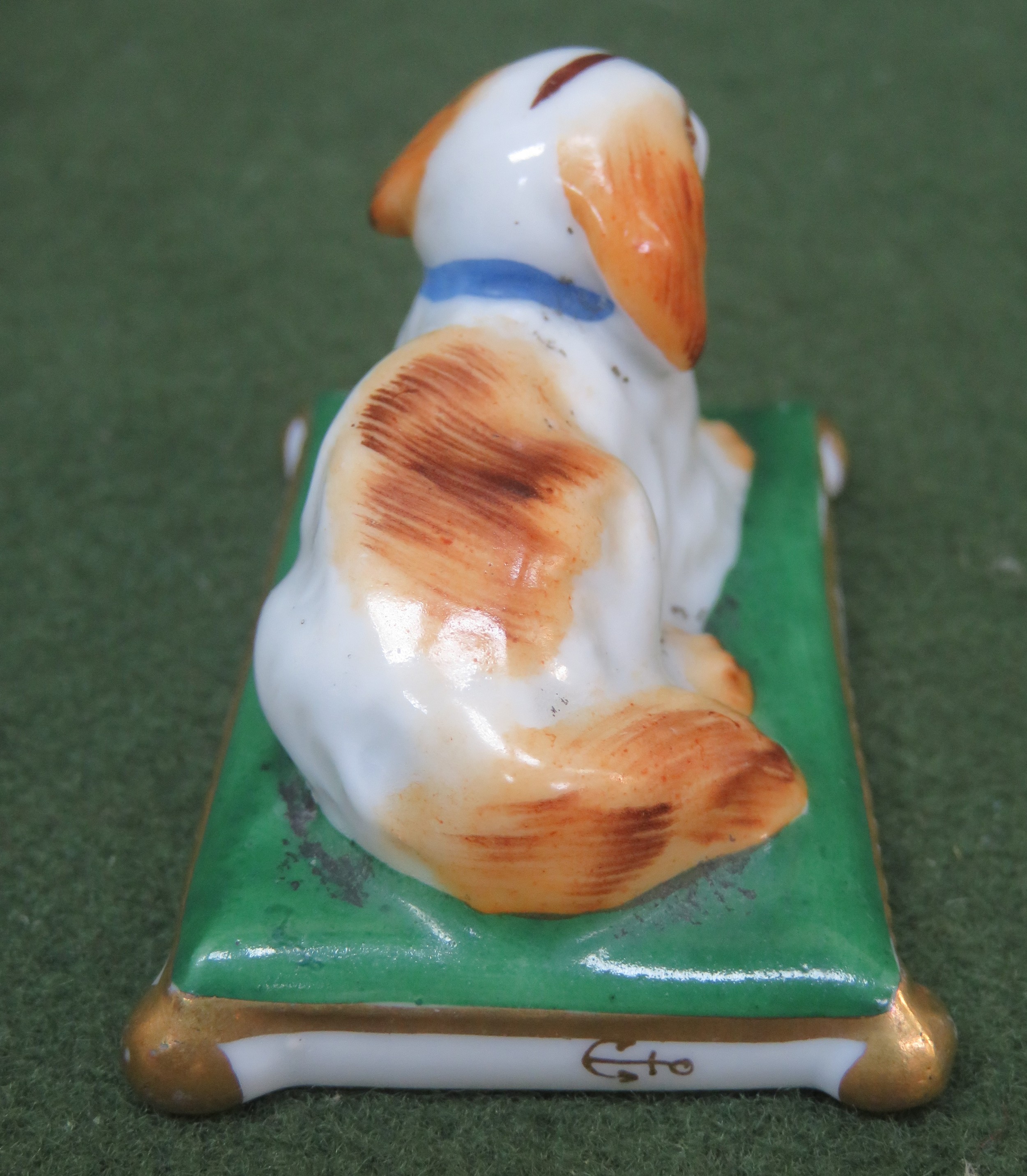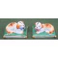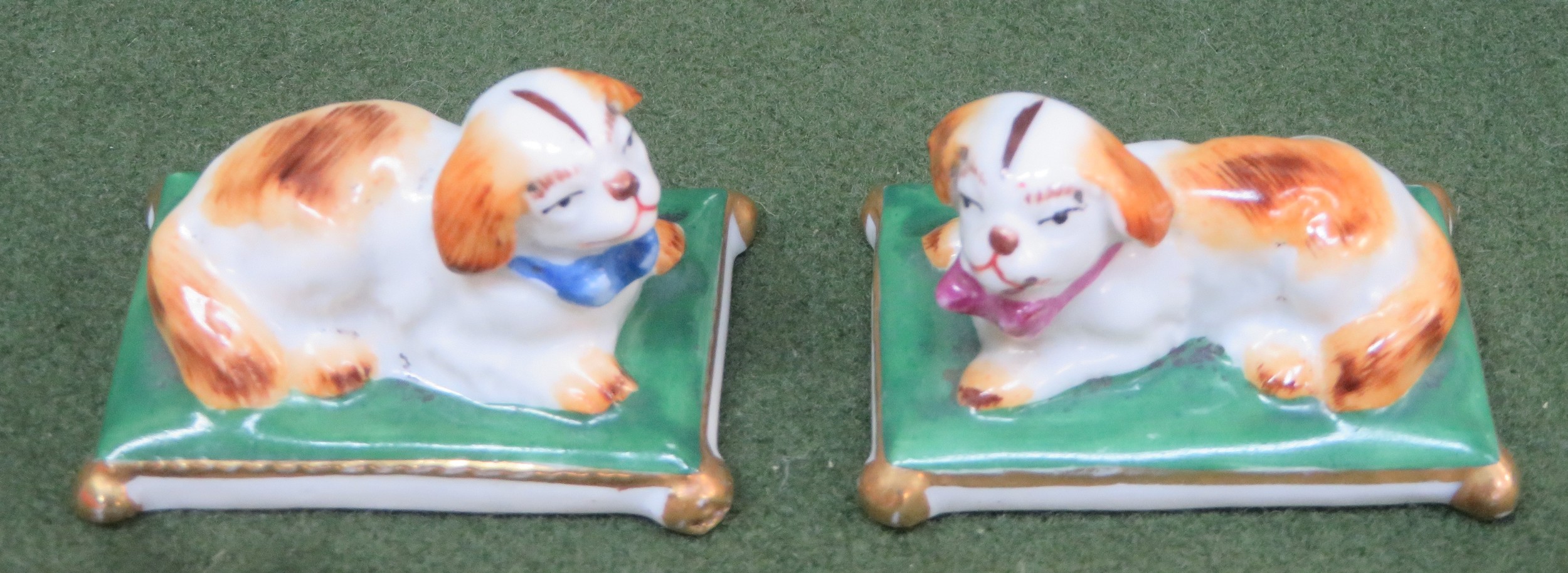 Pair of small late 19th/ early 20th century ceramic figures, depicting recumbent dogs on cushions, stamped with gold Chelsea pottery anchor, possibly by Sampson of Paris. Approx. 4cms High