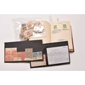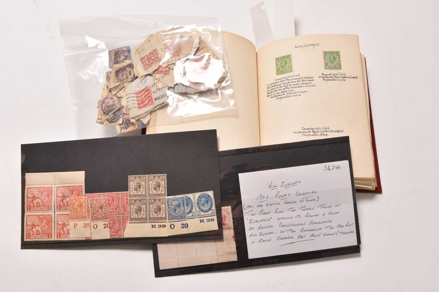 An accumulation of stamp albums as follows: a small SG Minor Album of GB including a no-margin 1d Black, fu; 1841 1d Red mint (SG08), part original gum, Cat £600; 1d Red Plate 169 mounted mint; 2d Blue 1841, 3 margin; 1915 2/6 Seahorse and 1918 2/6 Seahorse used; mint Geo V in stock card. New Zealand 1901 1d (SG288) lower marginal block of 8 mint. Some loose in 2 bags, 2 QV envelopes.