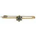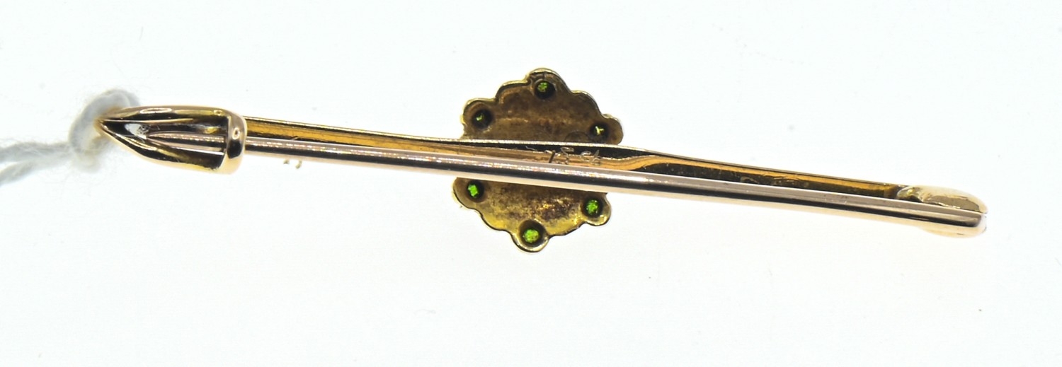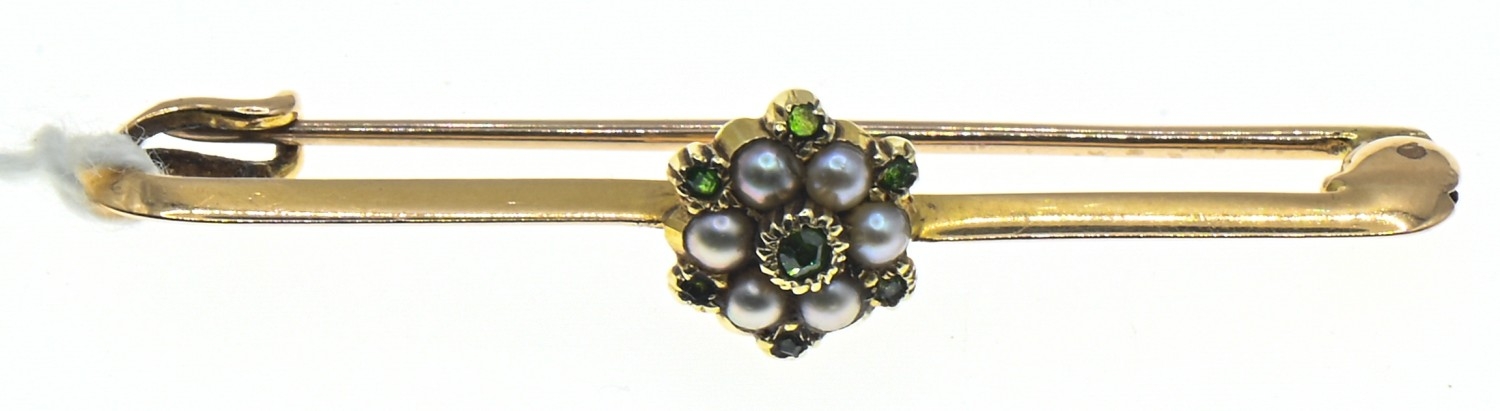 Yellow metal mounted seed pearl and green stone cluster bar brooch, scratch marked '15CT', length 42mm, gross weight 2.2 grams