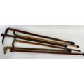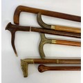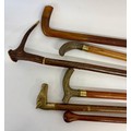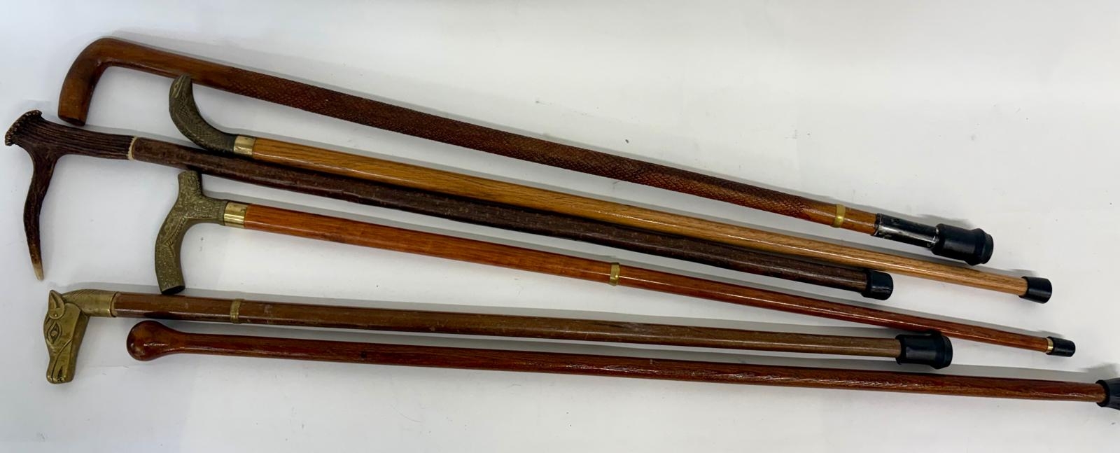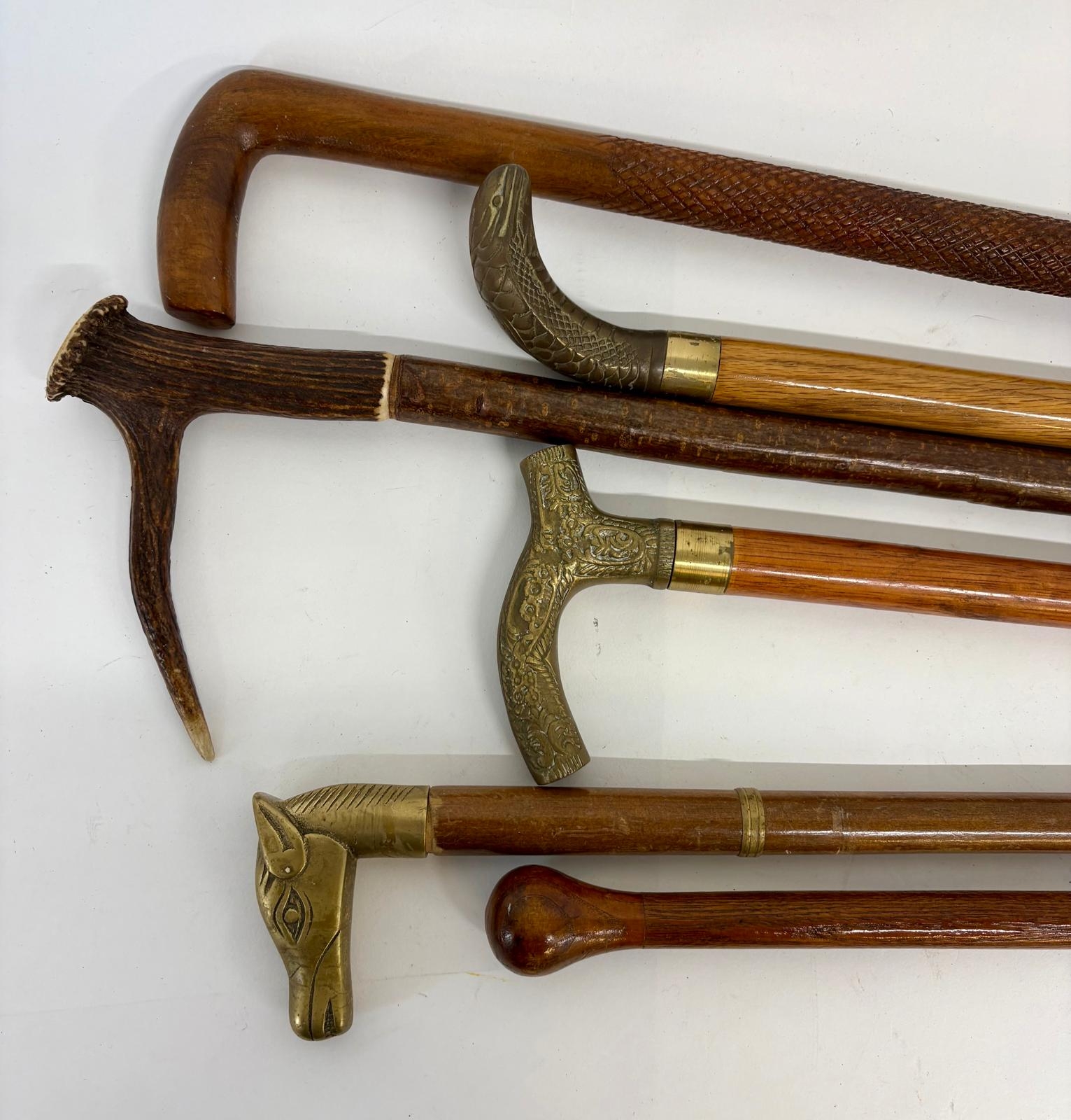 Six collectors walking canes, mostly early 20th century. To include a bronze Cobra head, brass horses head, floral decorated brass head, deer antler head, a turned knop head and a traditional carved handle.