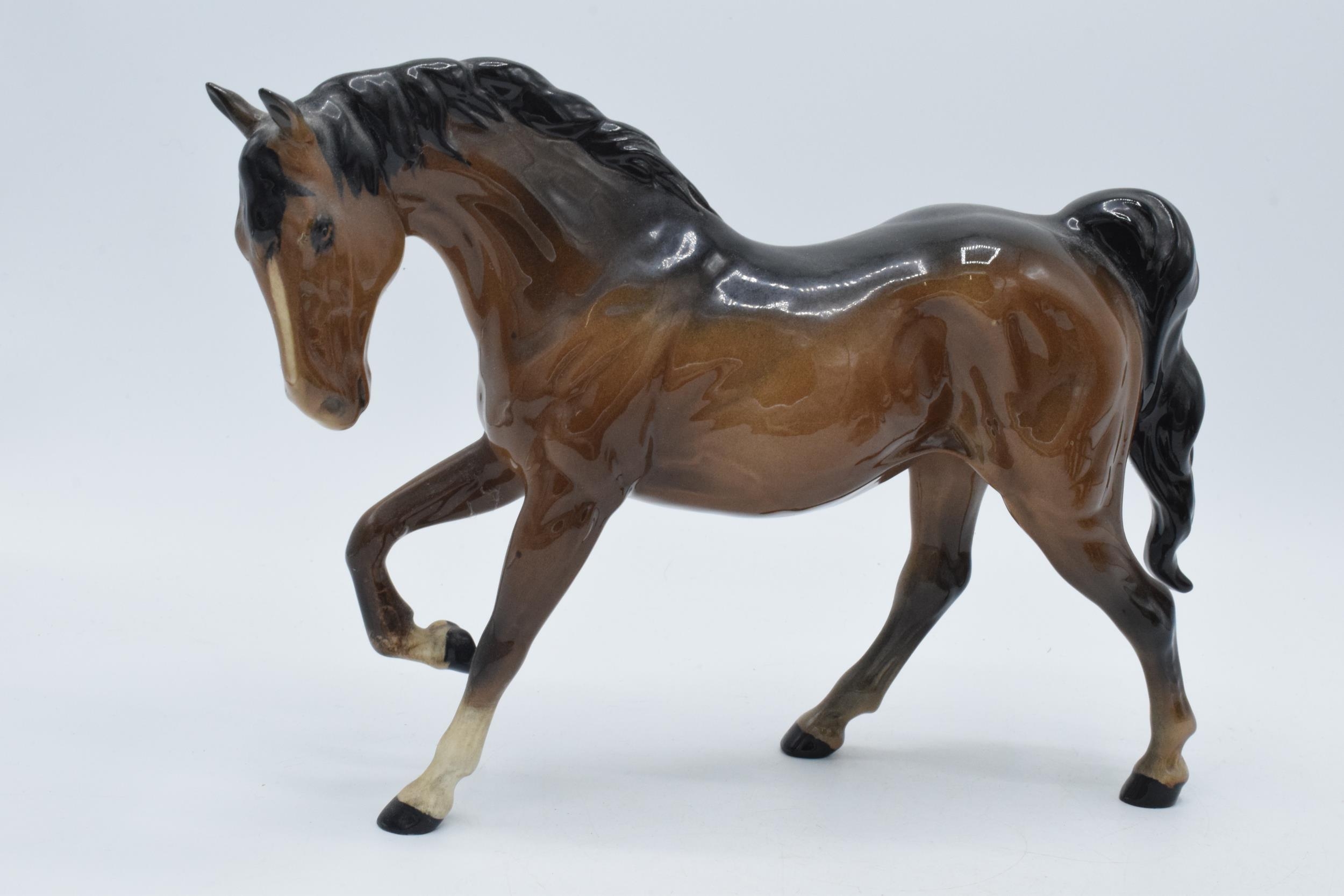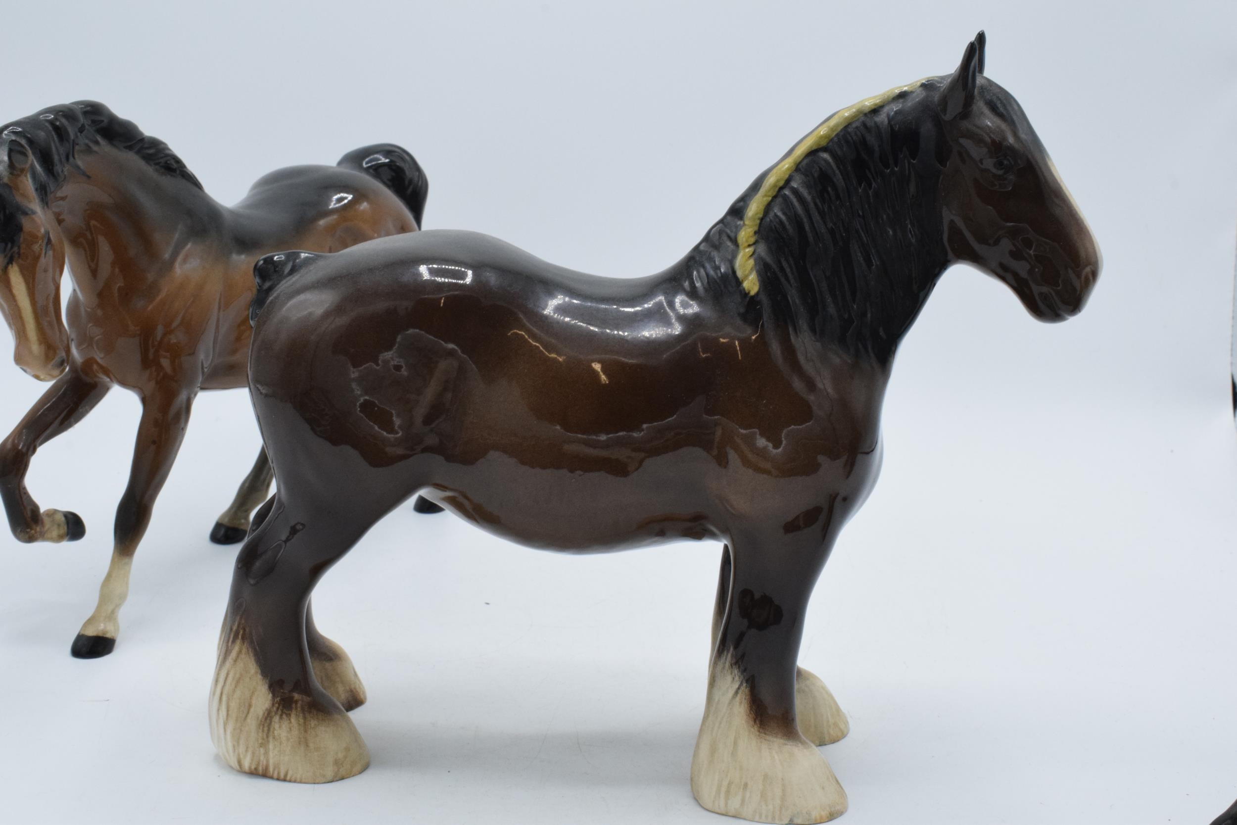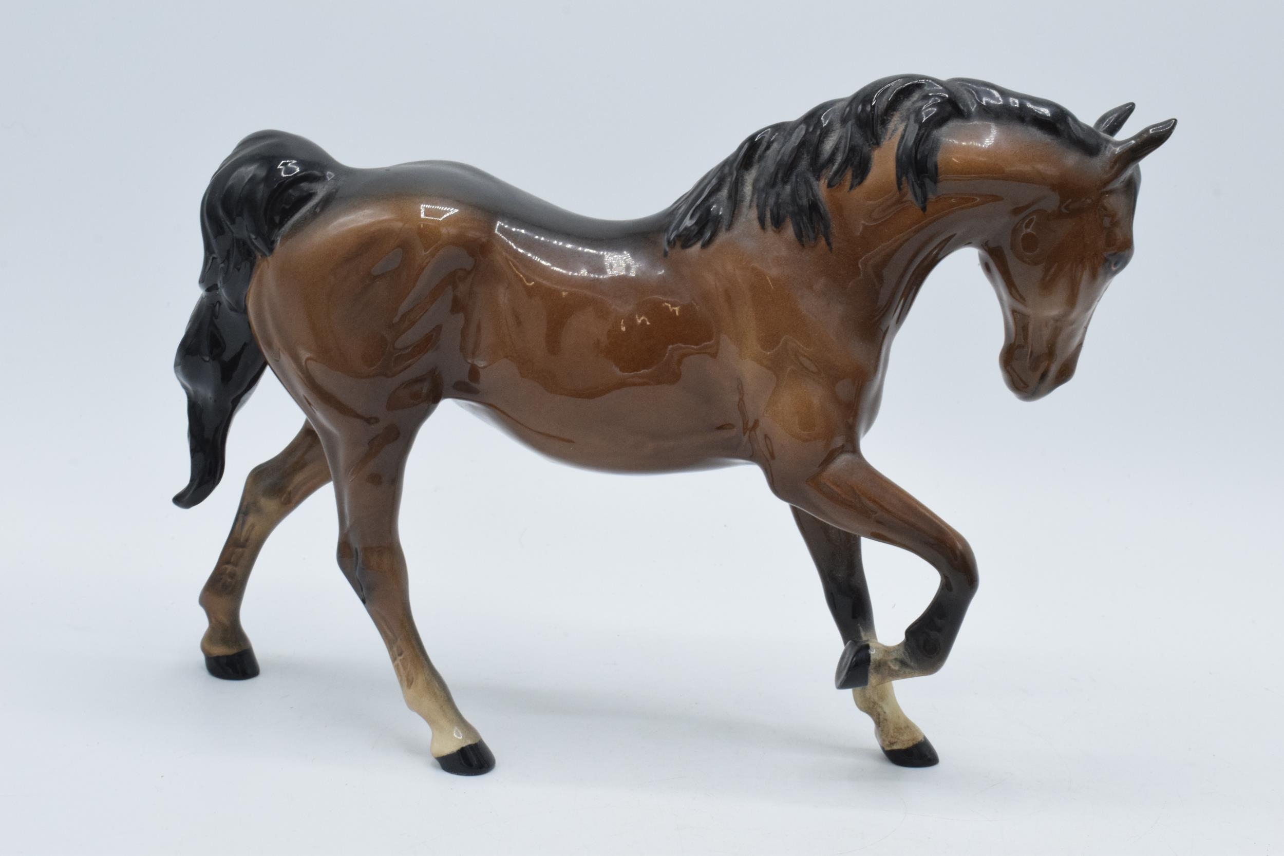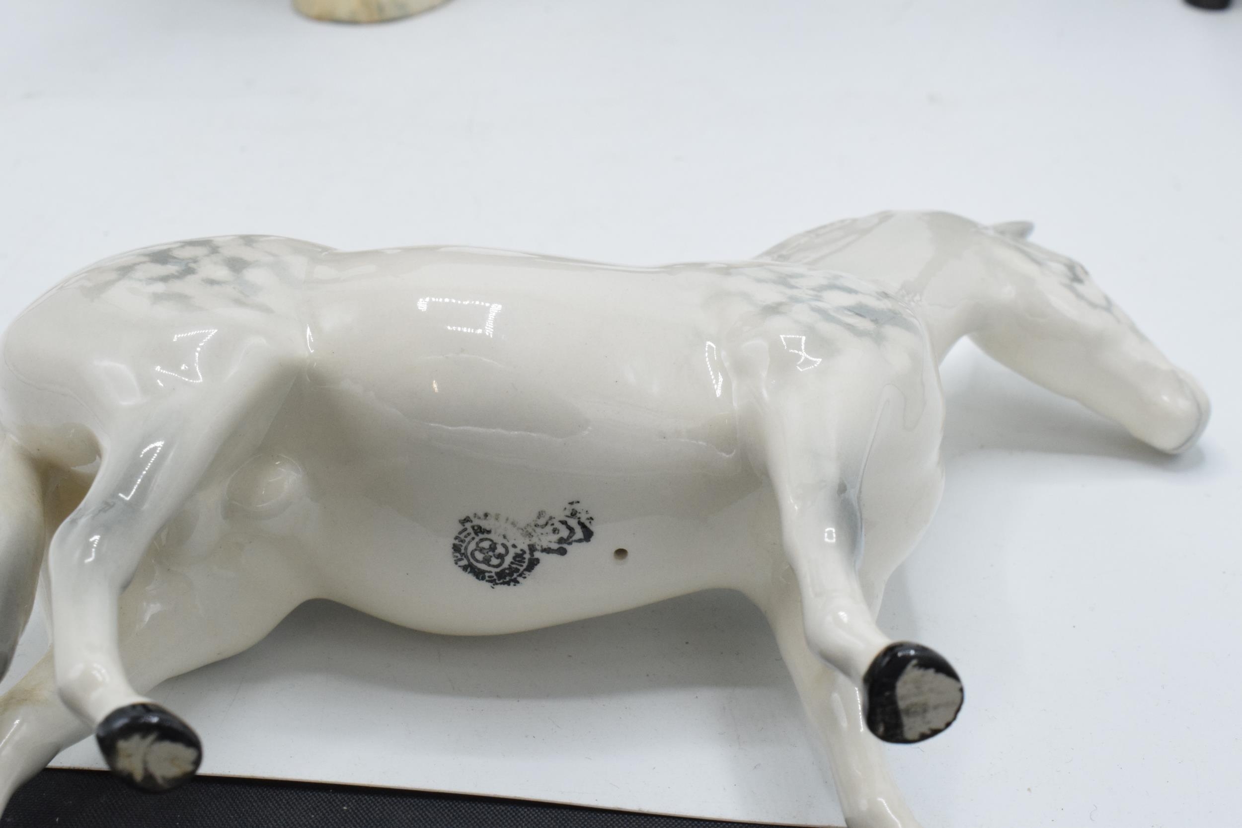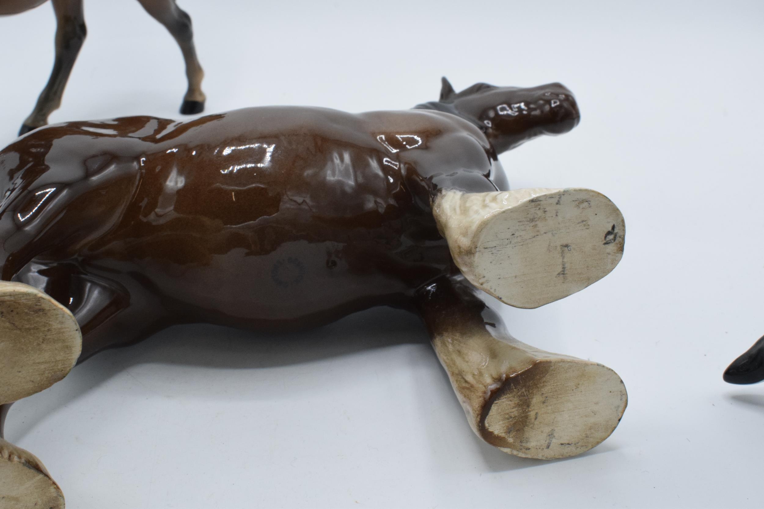 Beswick horses to include brown shire 818, grey thoroughbred (13cm tall), a brown Shetland (ear af) and brown gloss Spirit of Freedom (4).