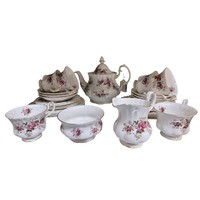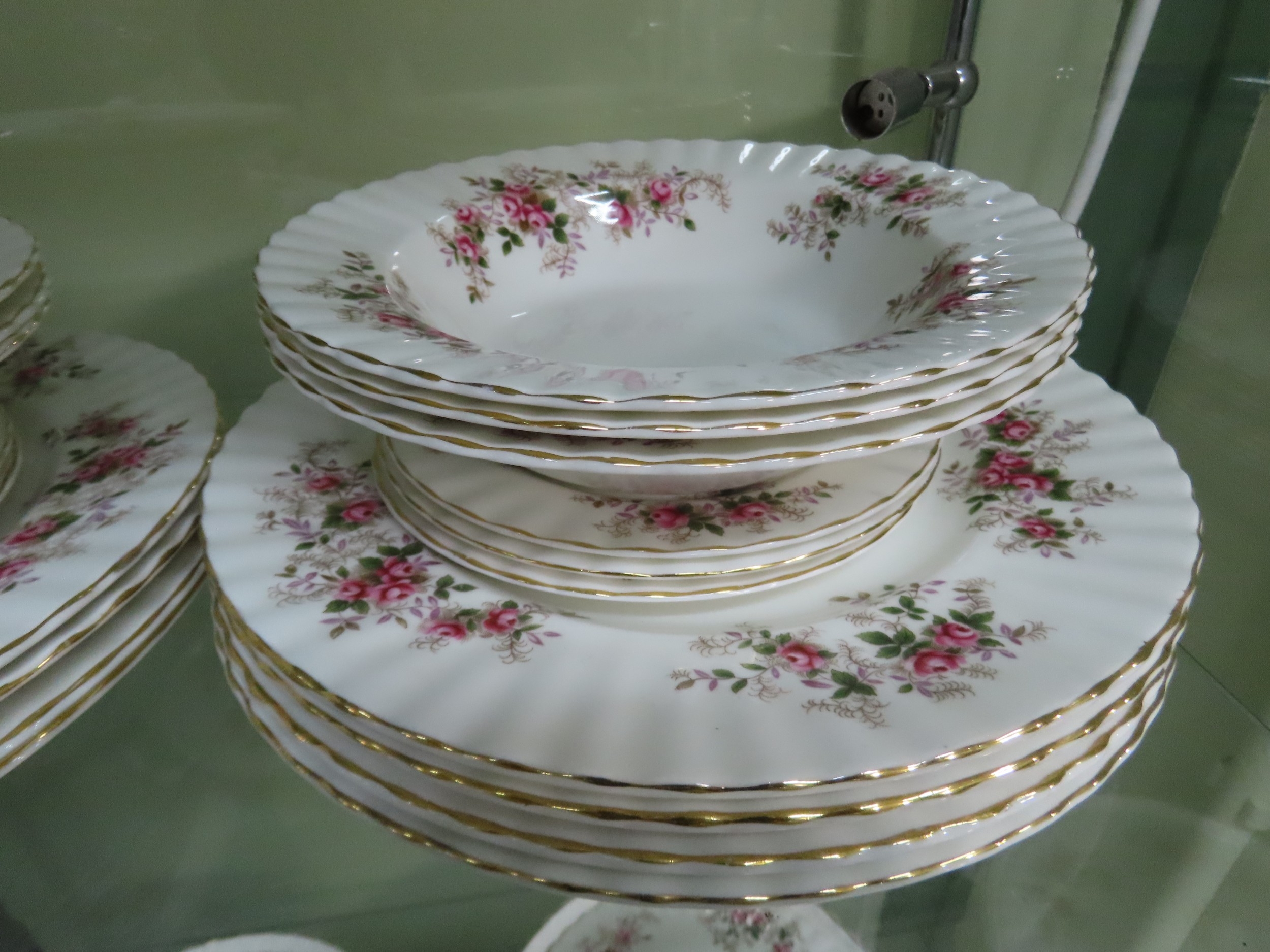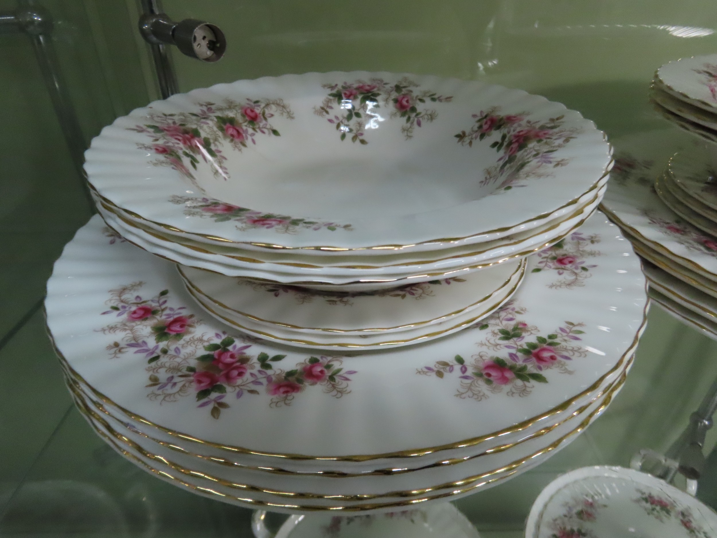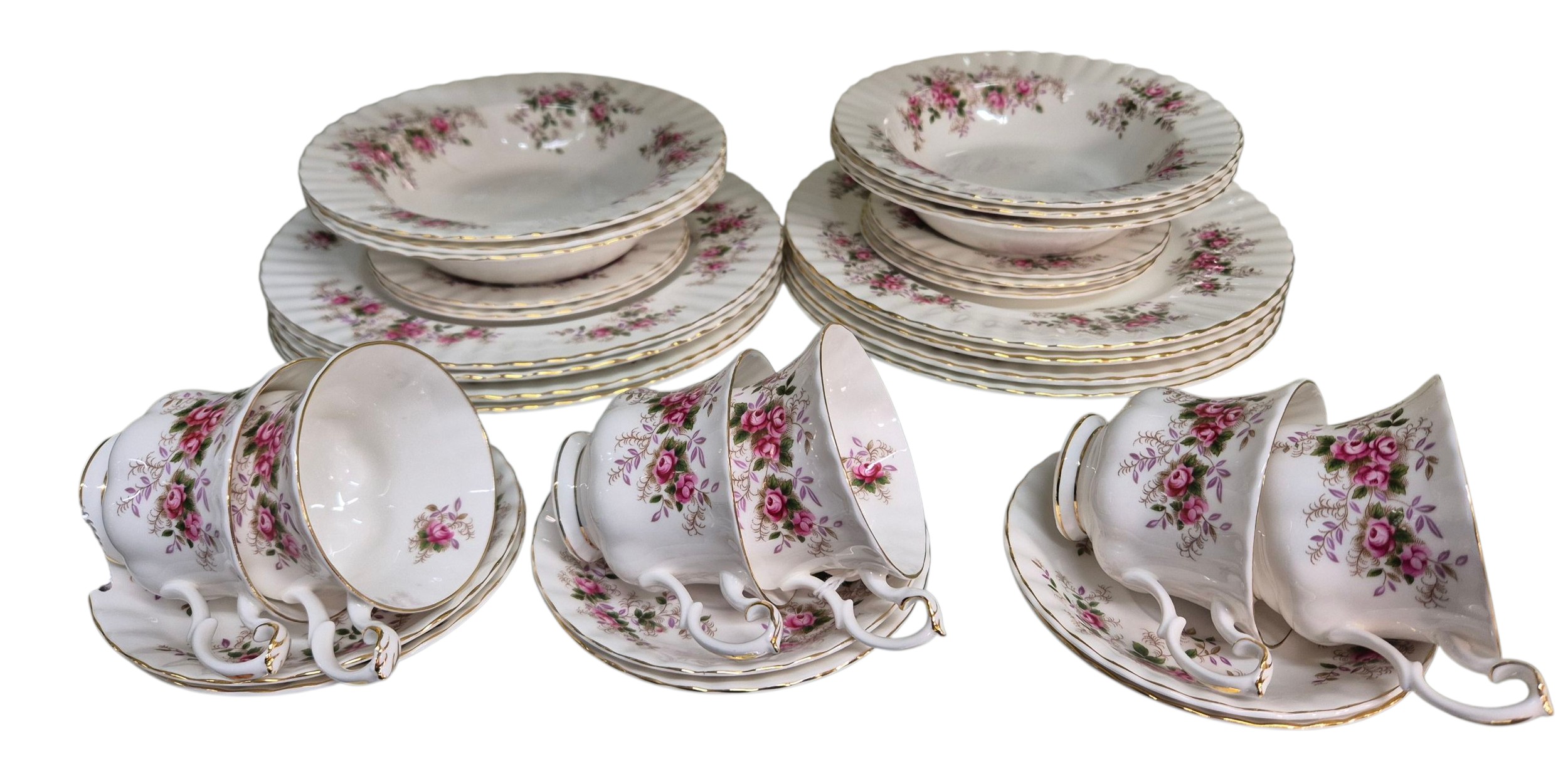 Royal Albert Lavender Rose dinner and tea ware comprising approximately thirty one pieces, the service decorated with clusters of lavender tinted roses and gilded rims, including cups saucers bowls and plates of various sizes.