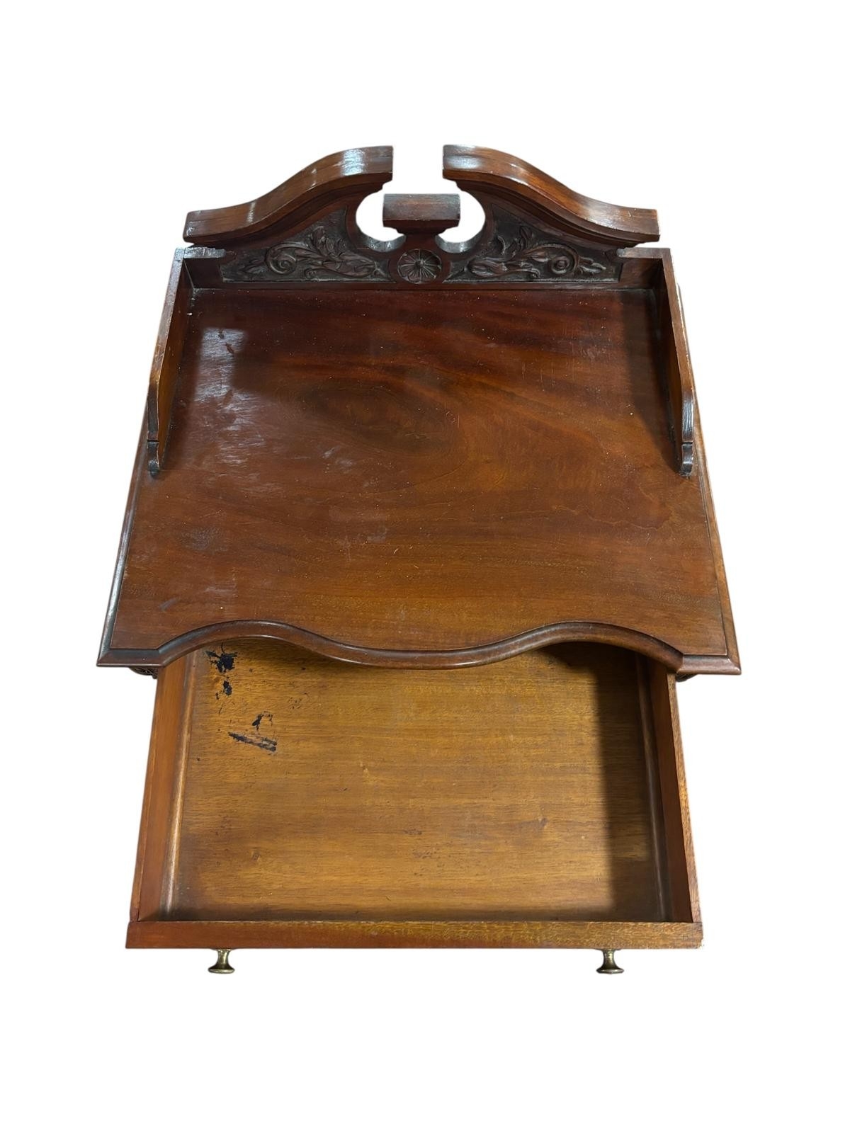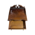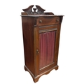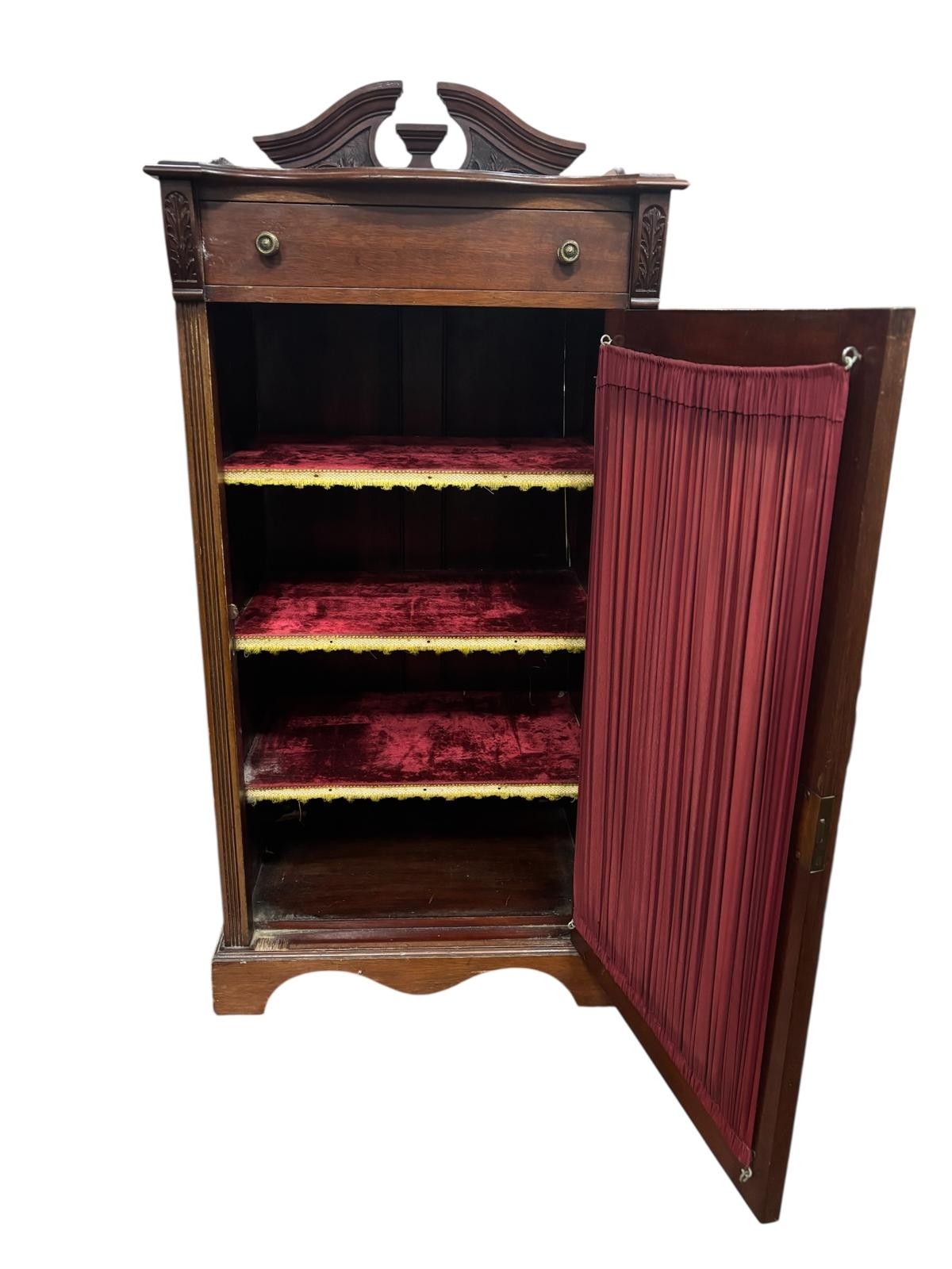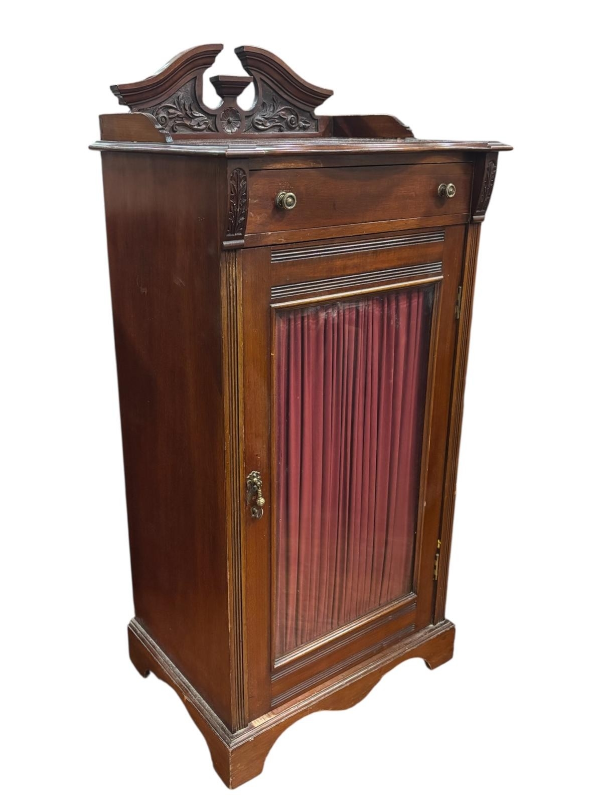 AN EDWARDIAN MAHOGANY MUSIC STAND of serpentine outline the shaped top with carved and moulded three quarter gallery above a frieze drawer with glazed cupboards containing upholstered shelves on bracket feet 111cm (h) x 51cm (w) x 40cm (d)