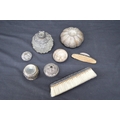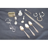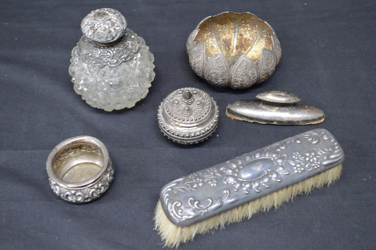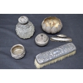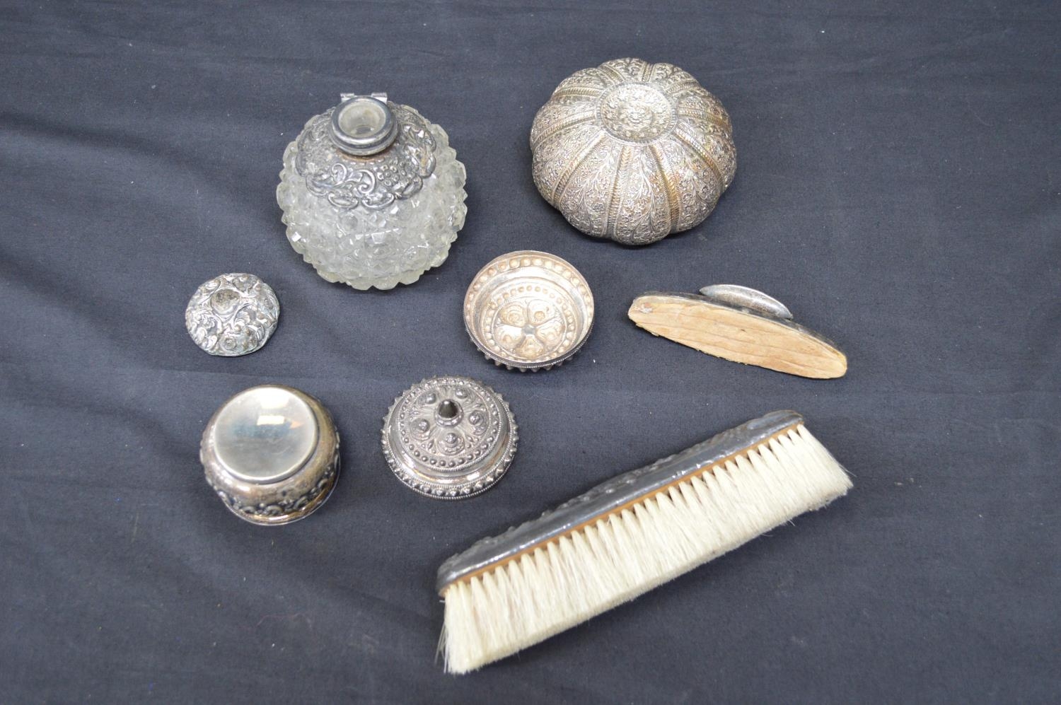 Group of silver and white metal items to include: scent bottles, clothes brush, nail buffer, lidded pot and bowl etc