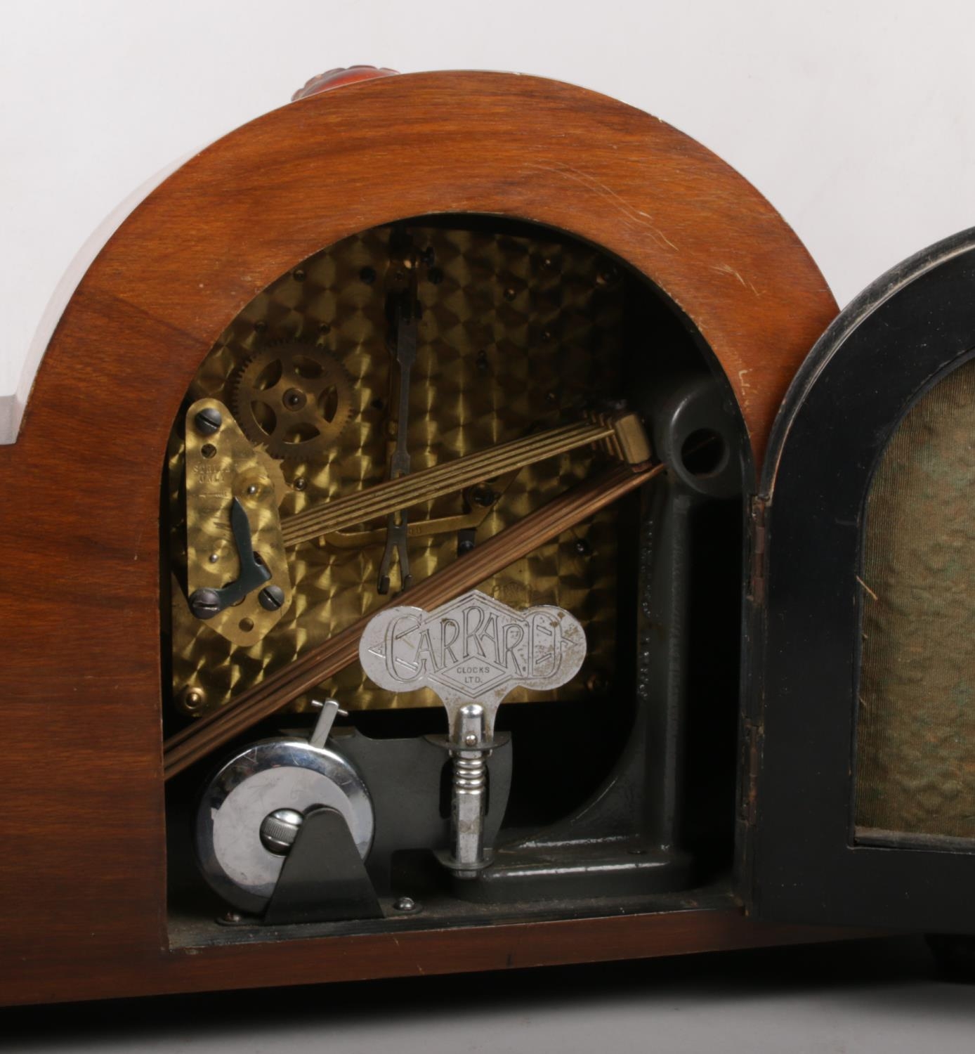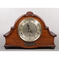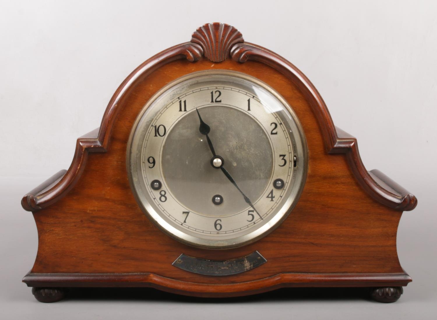 A George V walnut cased Garrard presentation 8 day Westminster chiming mantel clock. With carved mouldings, shell motif and raised on bun feet, 35cm wide.