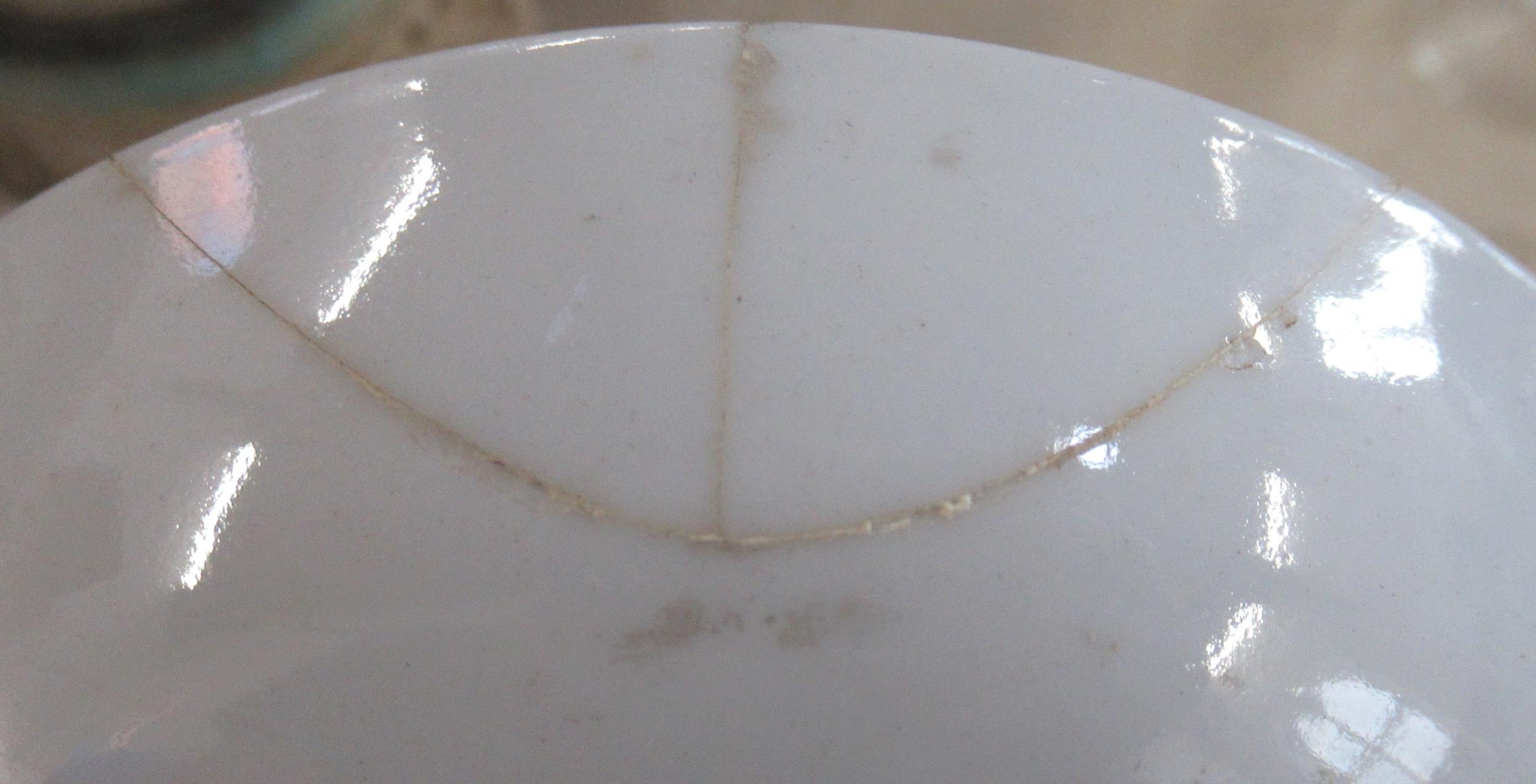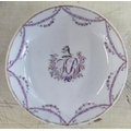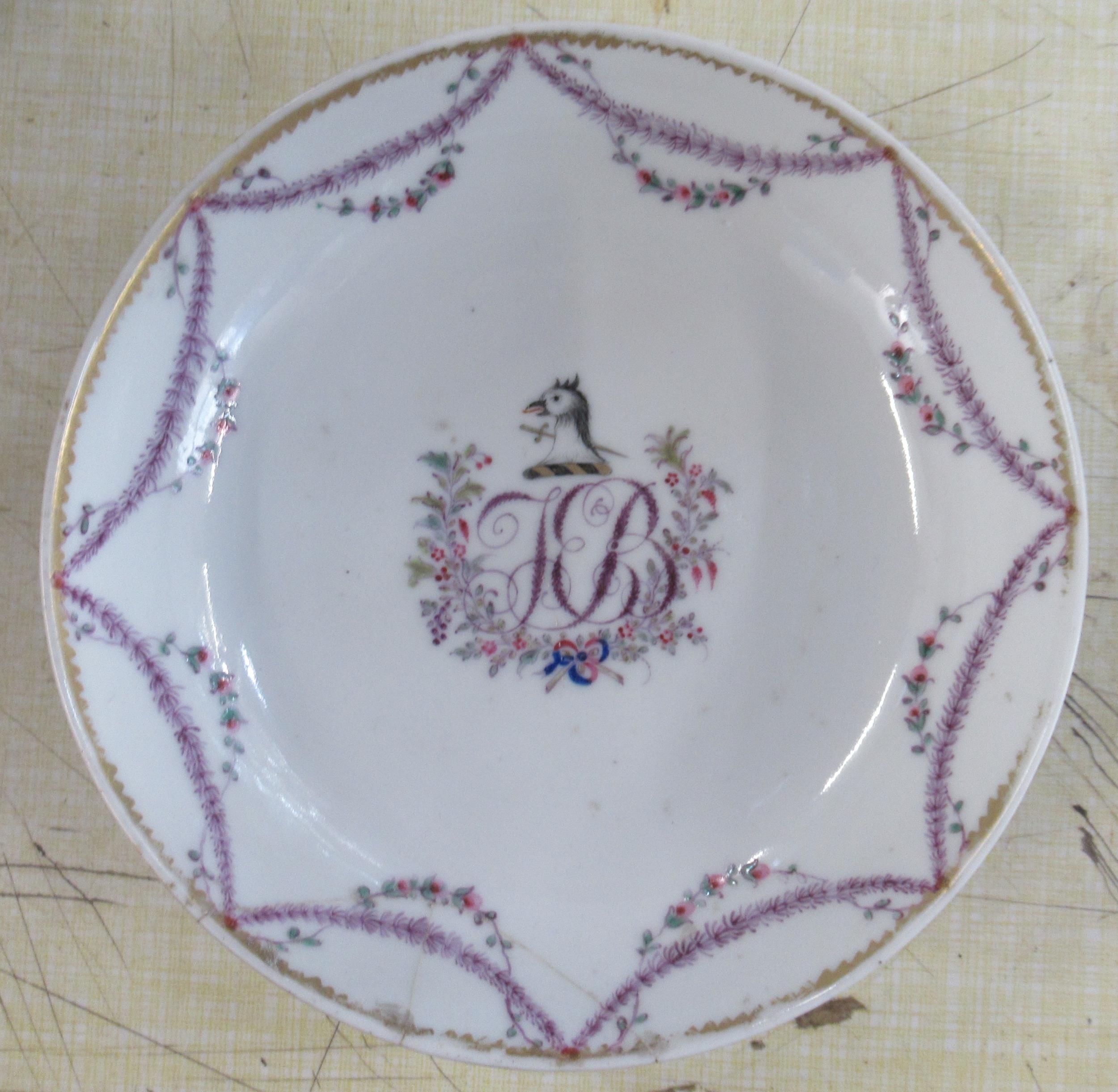A 19th century English porcelain saucer, decorated with initials and a crest, with garland border, af