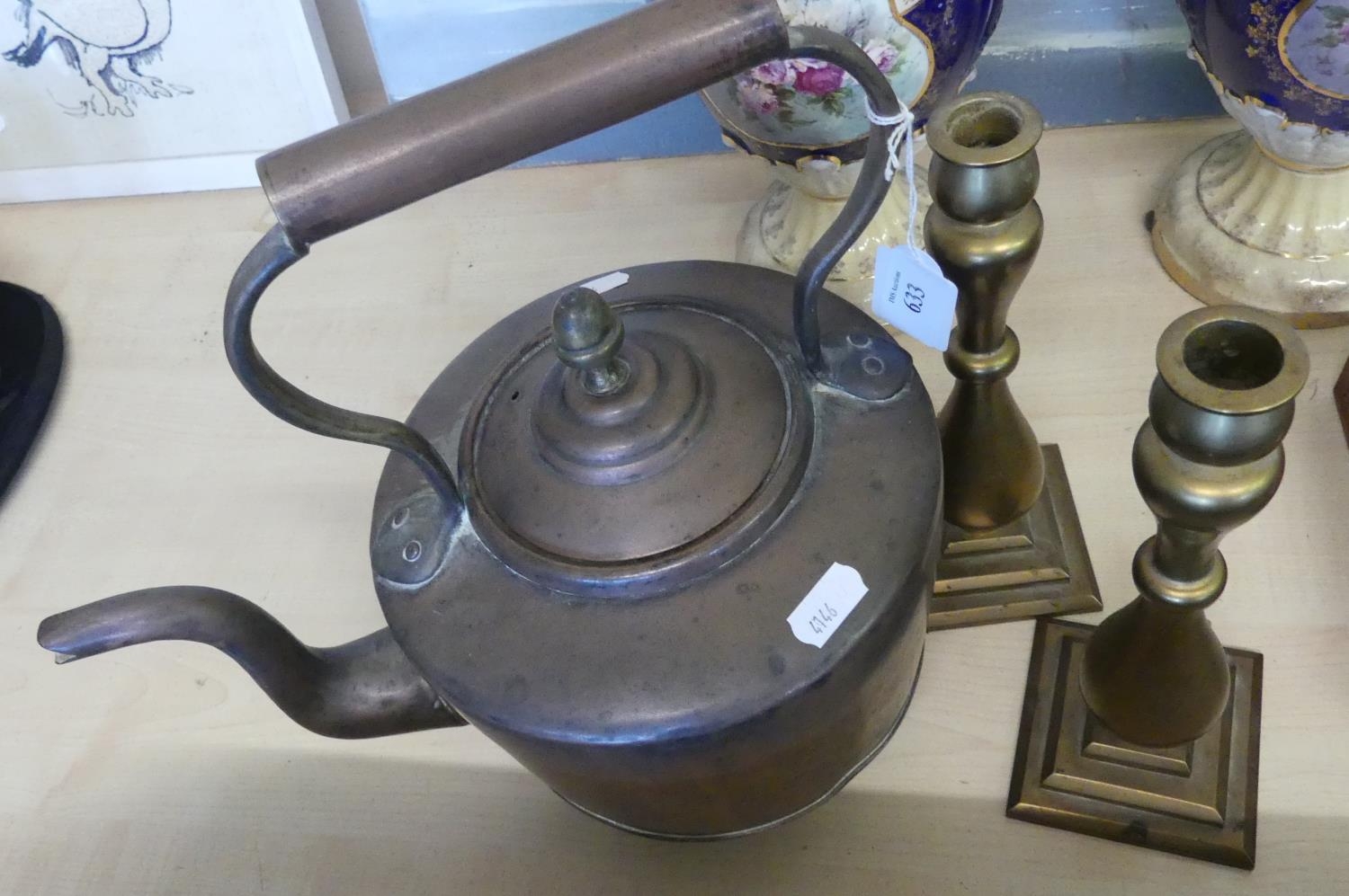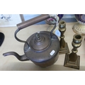 Copper Kettle & Pair of Brass Candlesticks.