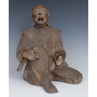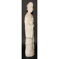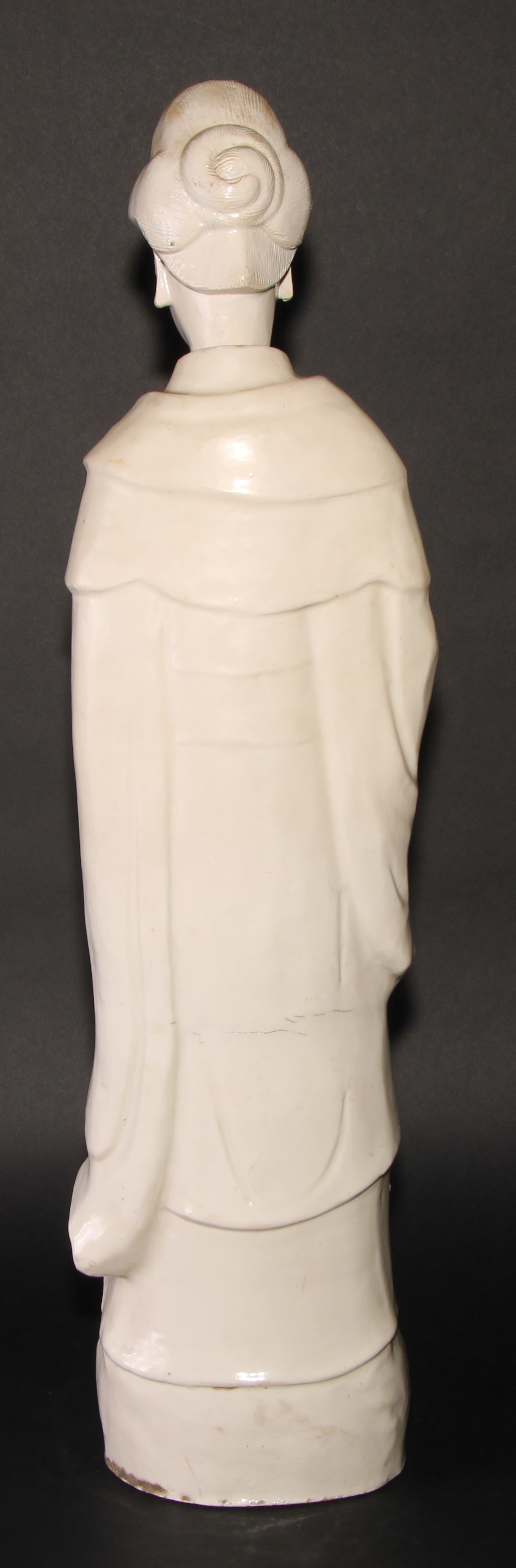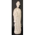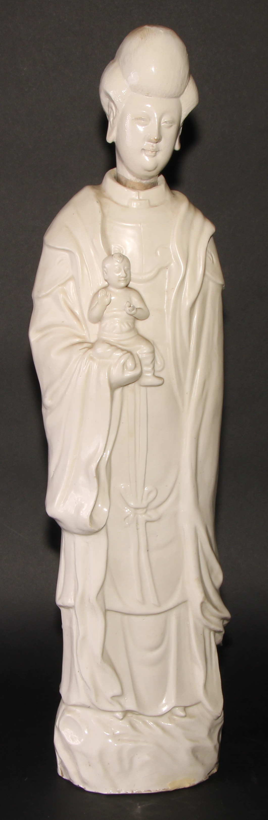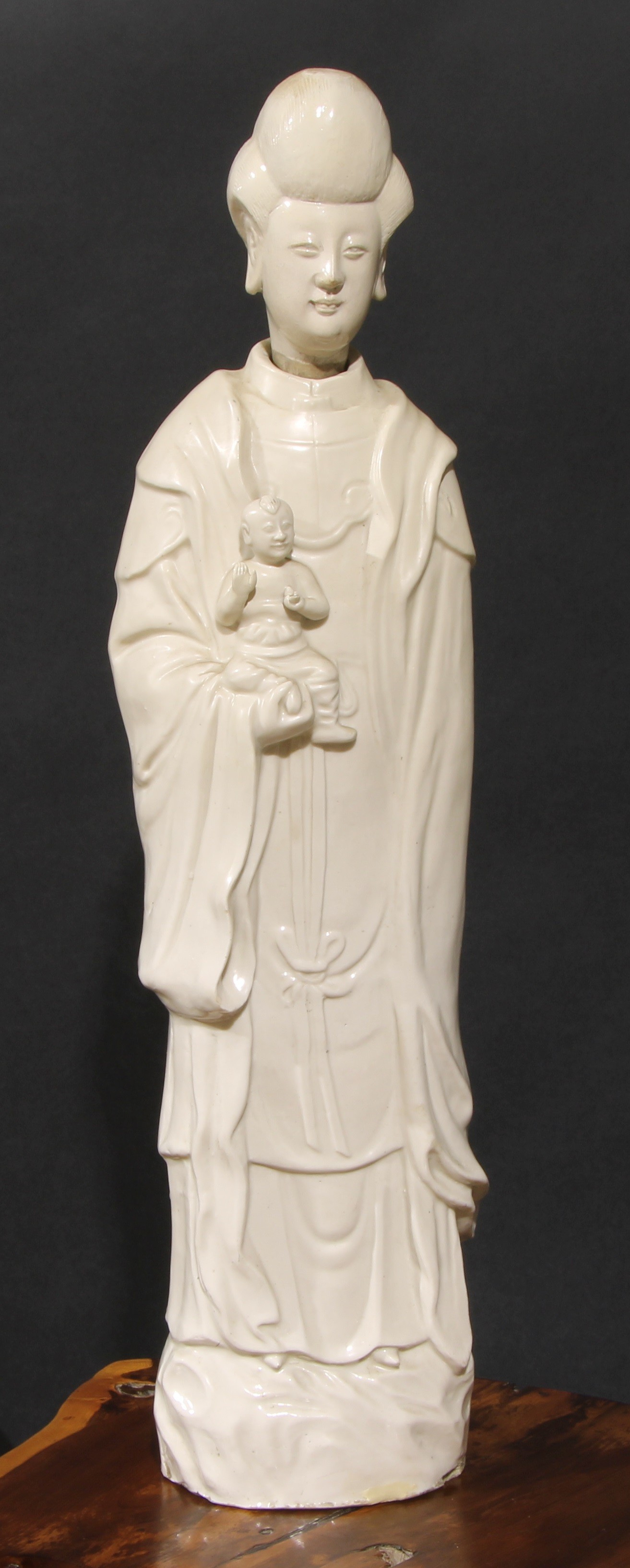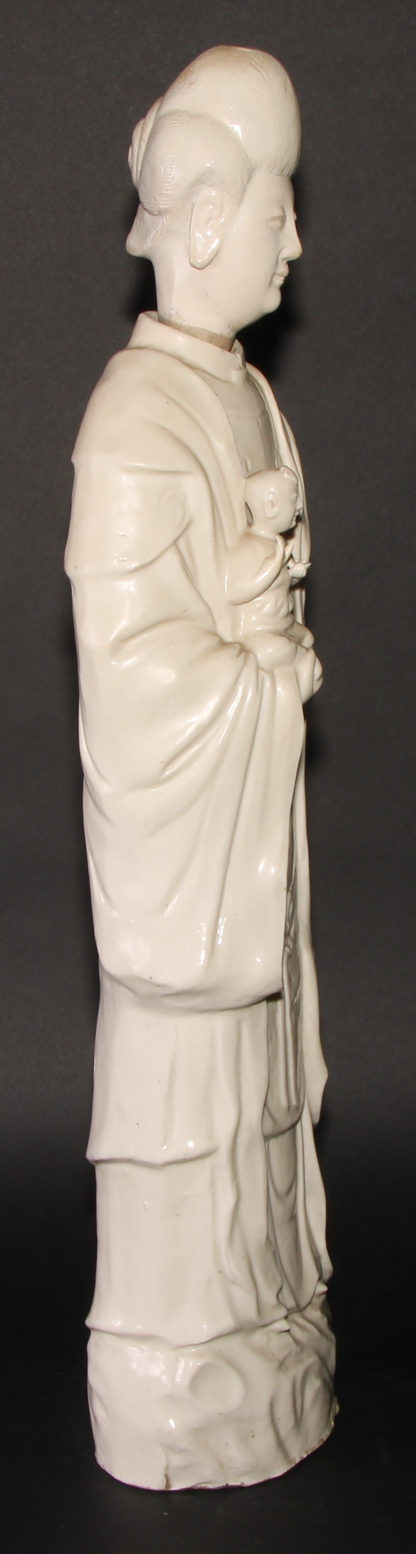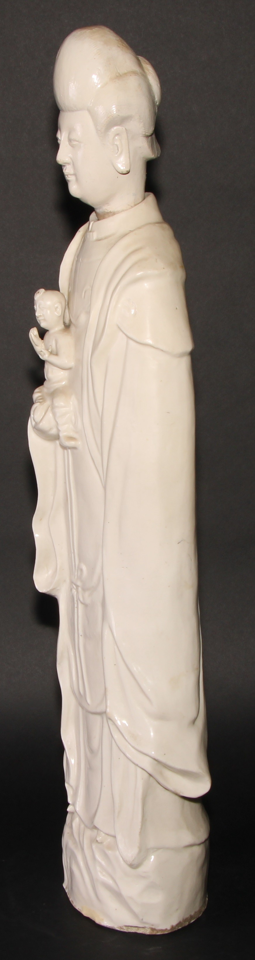 A large Chinese blanc de chine figure, of Guanyin, depicting as Goddess of Mercy, holding a child, her head of separate construction, 65.5cm high, 19th century
