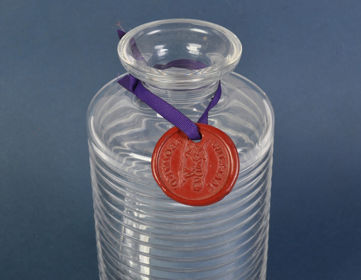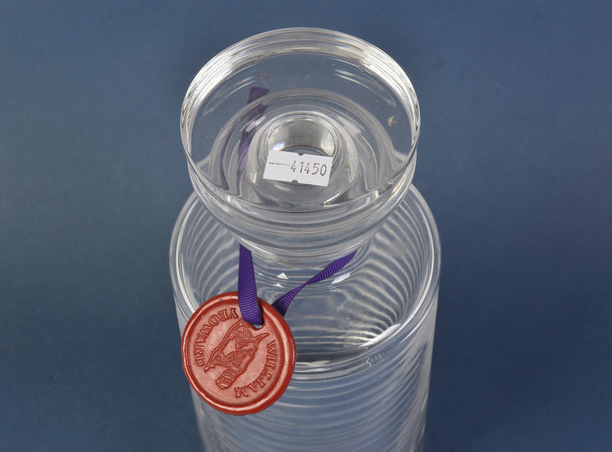 A "William Yeoward" ribbed Cut Glass Decanter & Stopper with a wax medallion & signed bottom. Measuring: 24cms High.