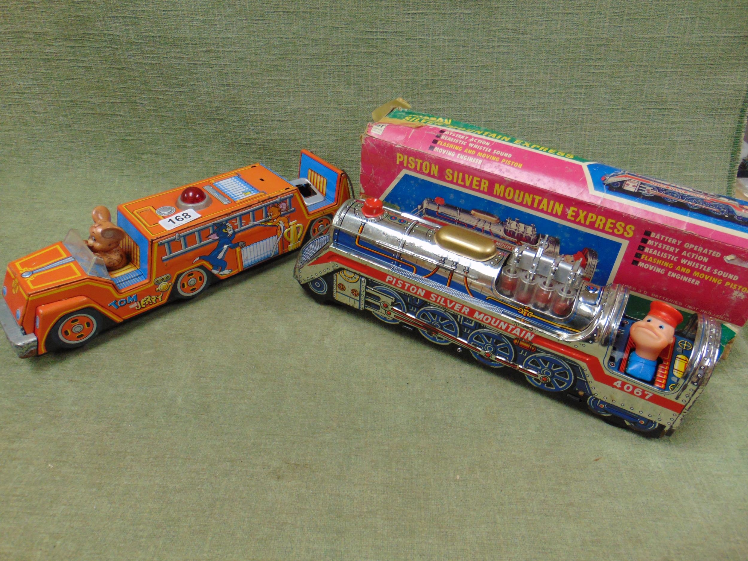 Tinplate battery Piston Silver Mountain Express, with box, and a Tom and Jerry fire engine.