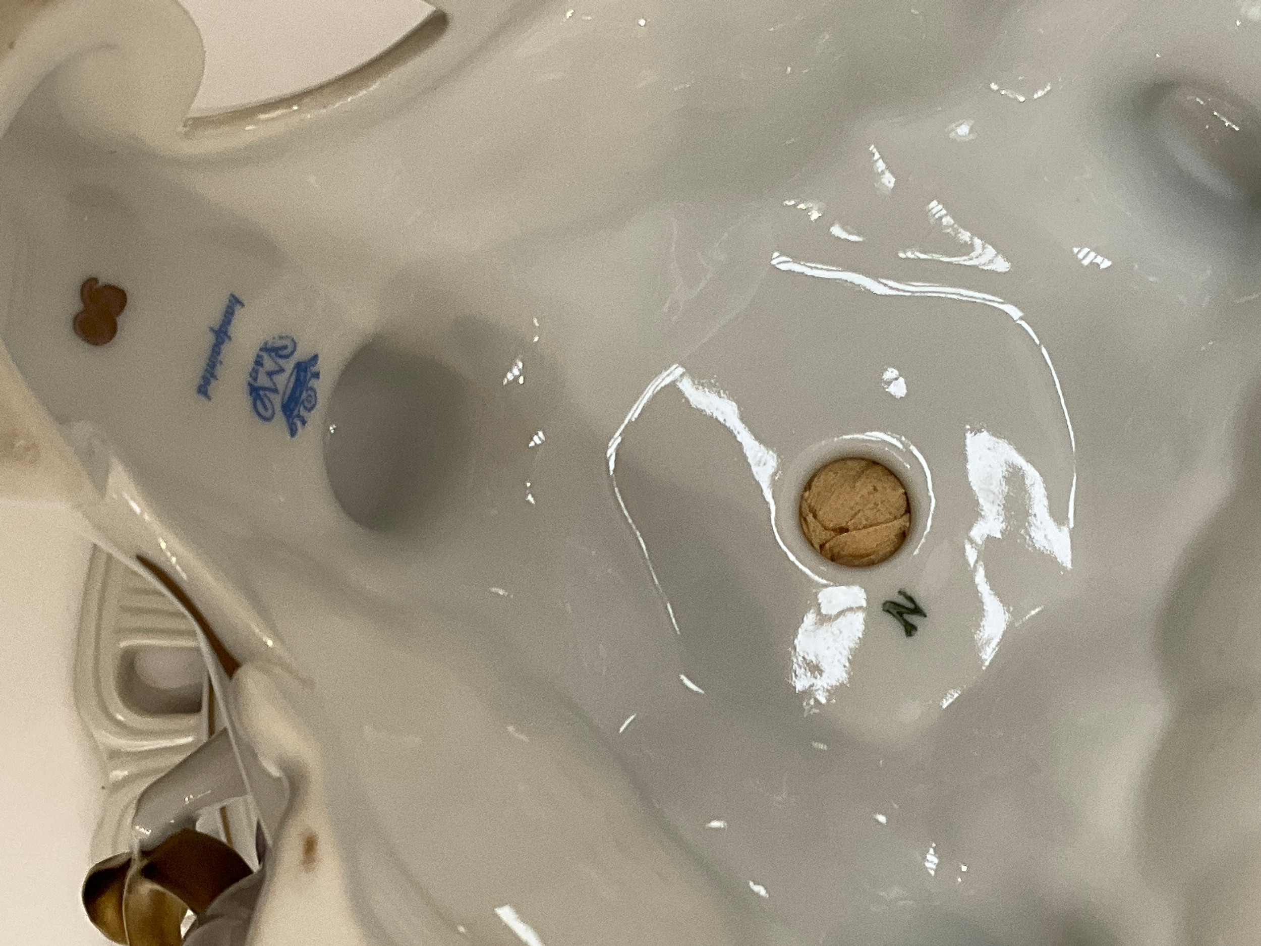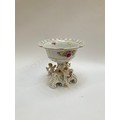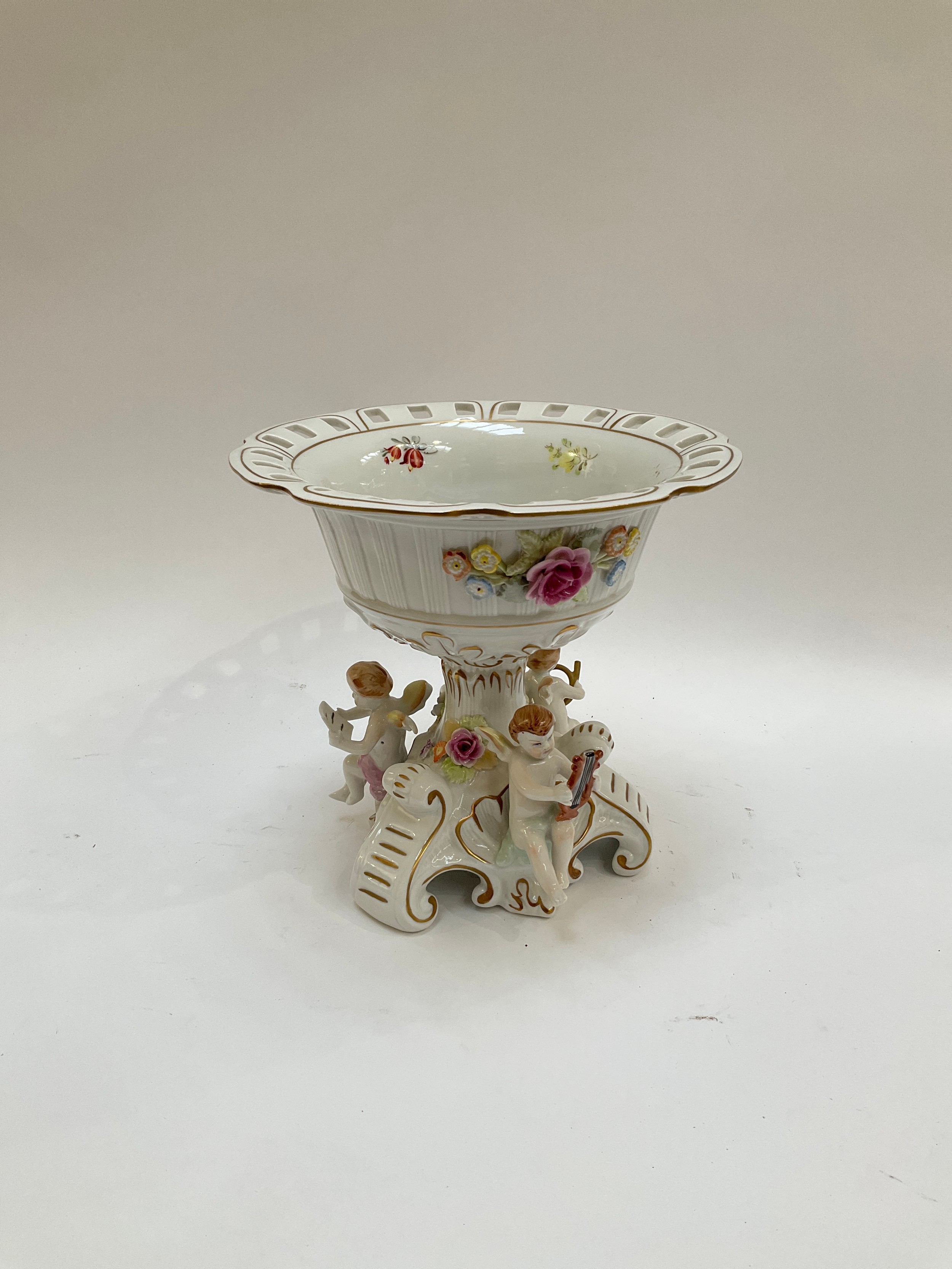 A 20th Century Dresden centre bowl held aloft by cherubs reading and playing musical instruments, painted and applied floral detail, 20cm tall (C)