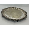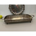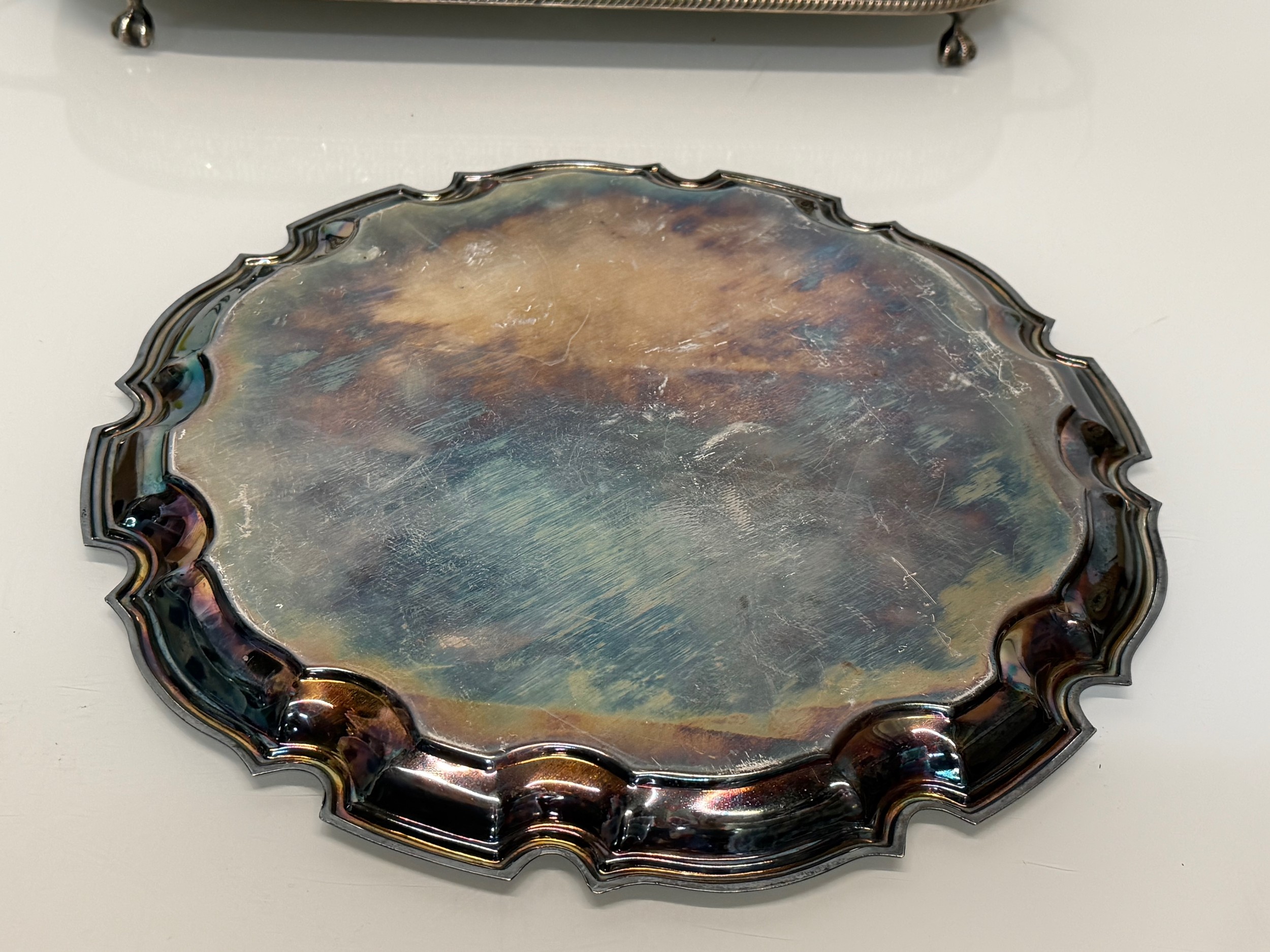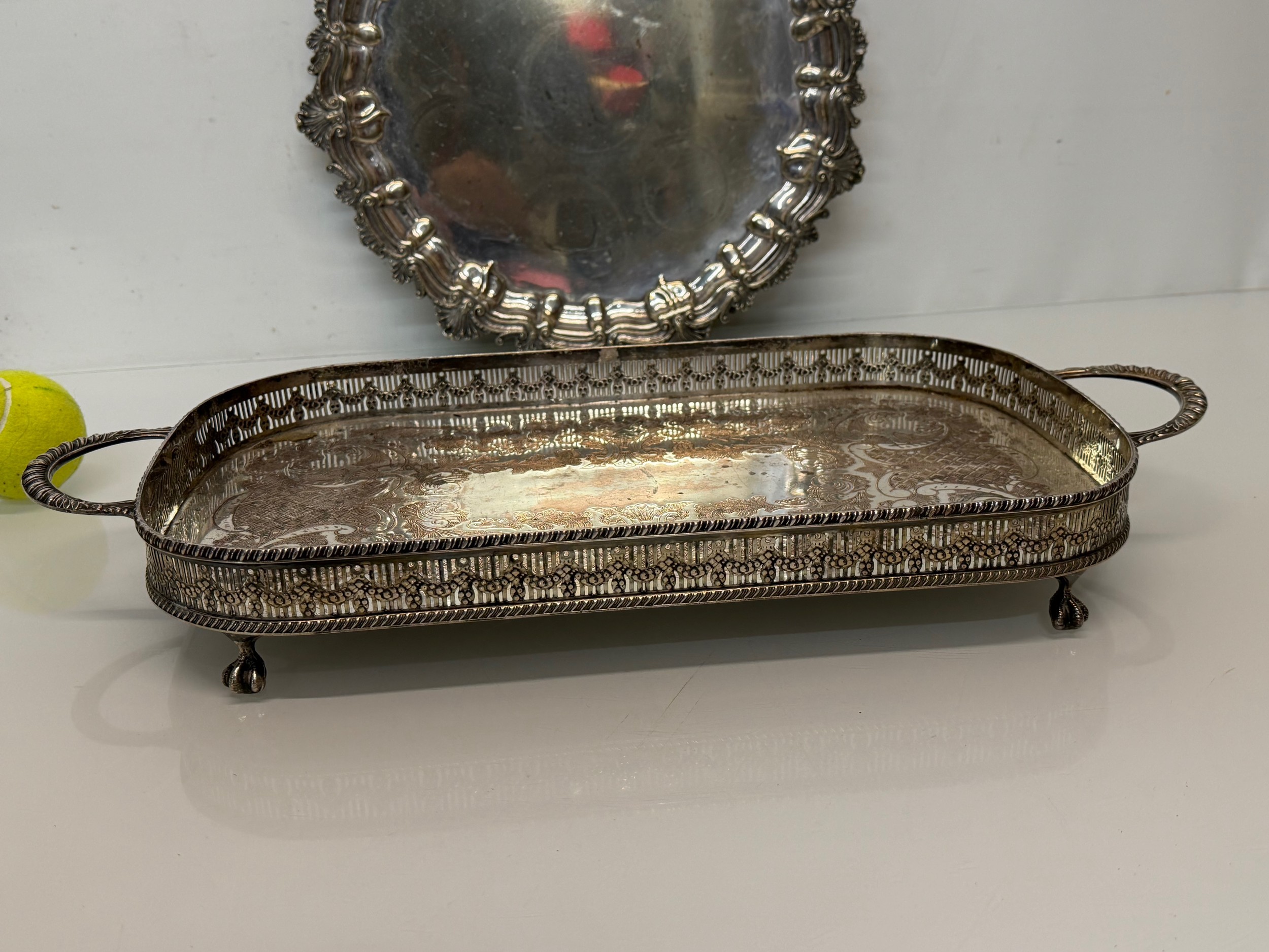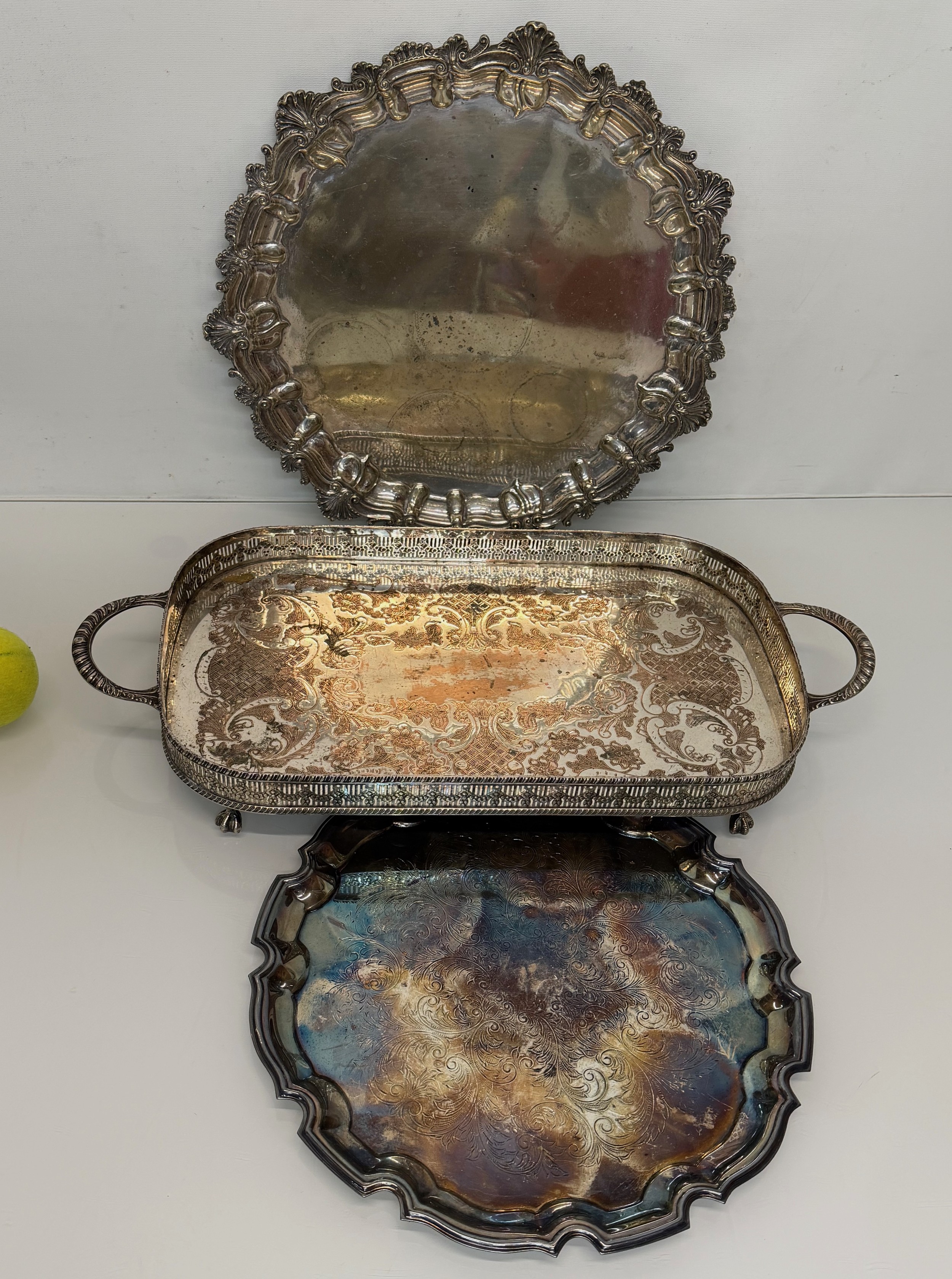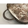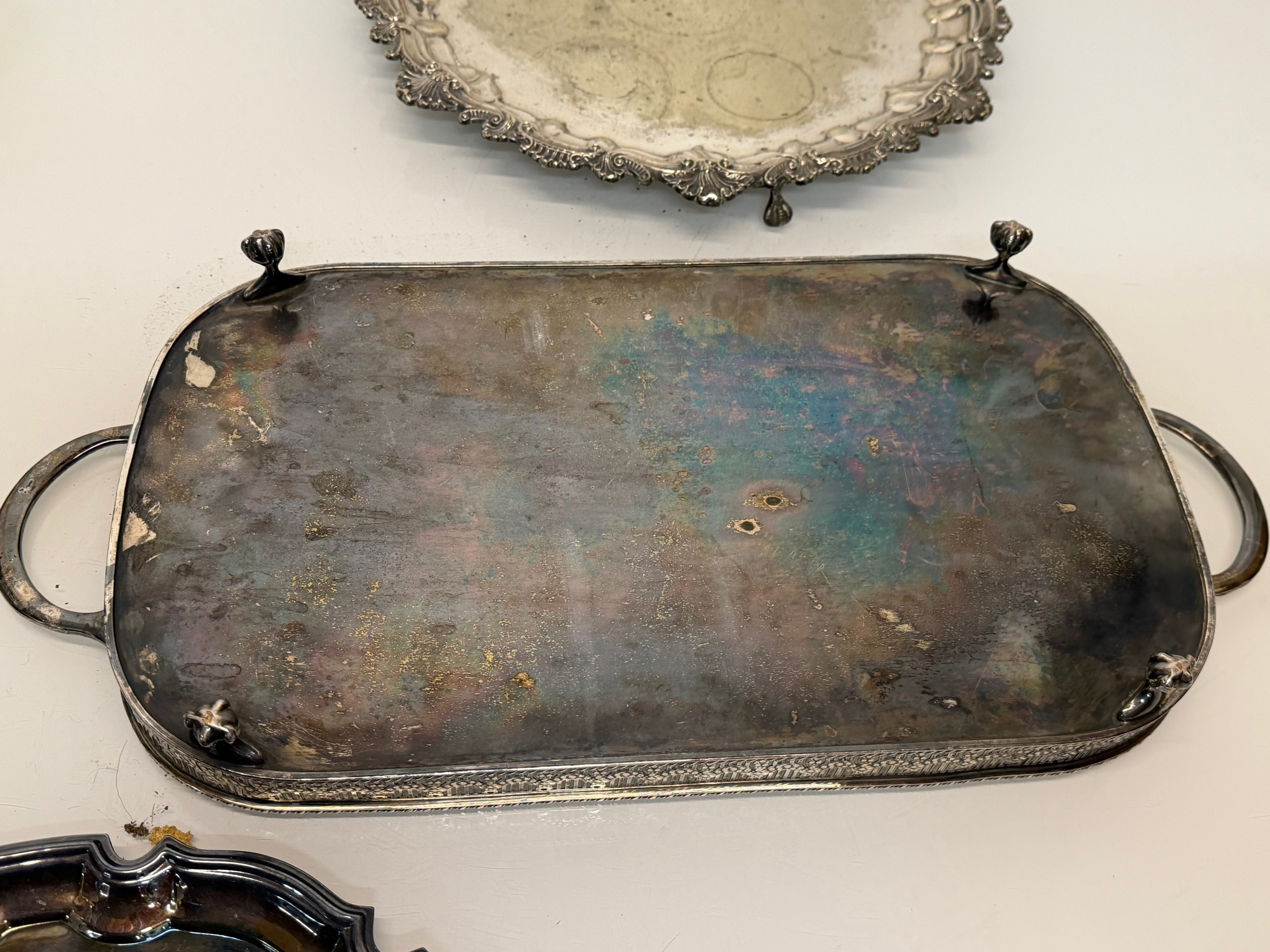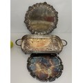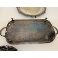 Silver plated table wares, two salvers 32 cm and 37 cm in diameter and a tray, 42 cm x 25 cm plus handles.