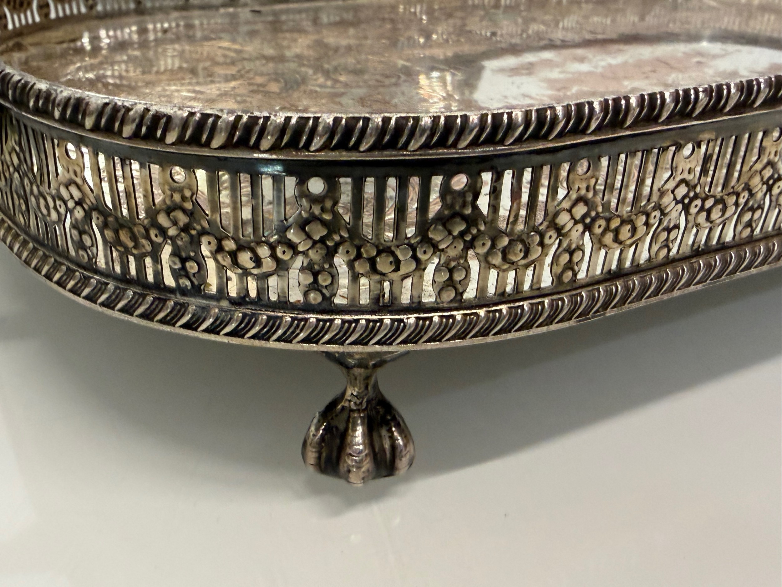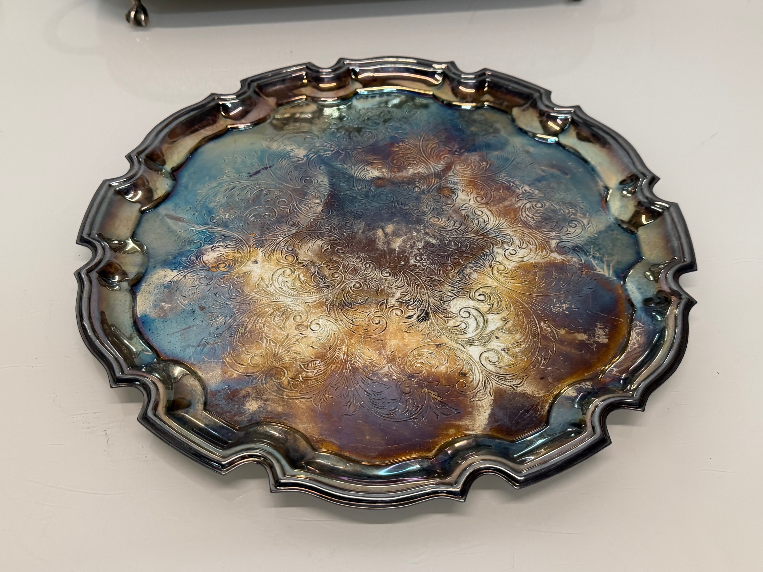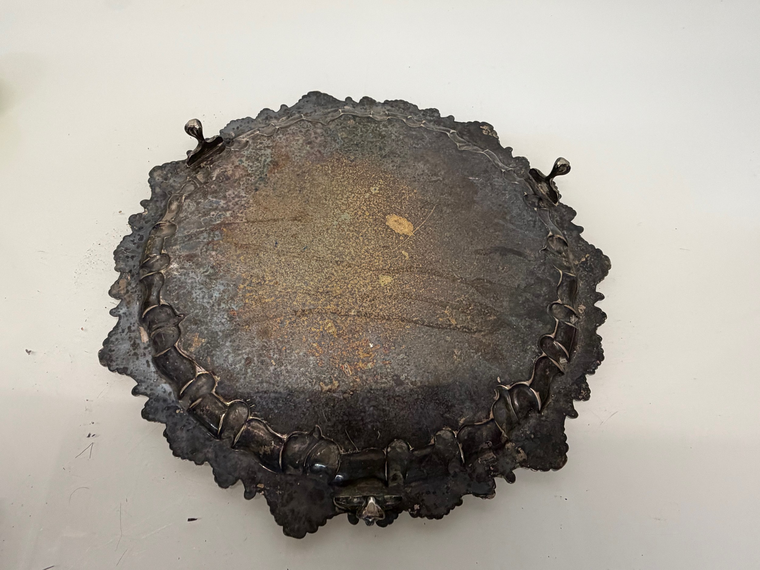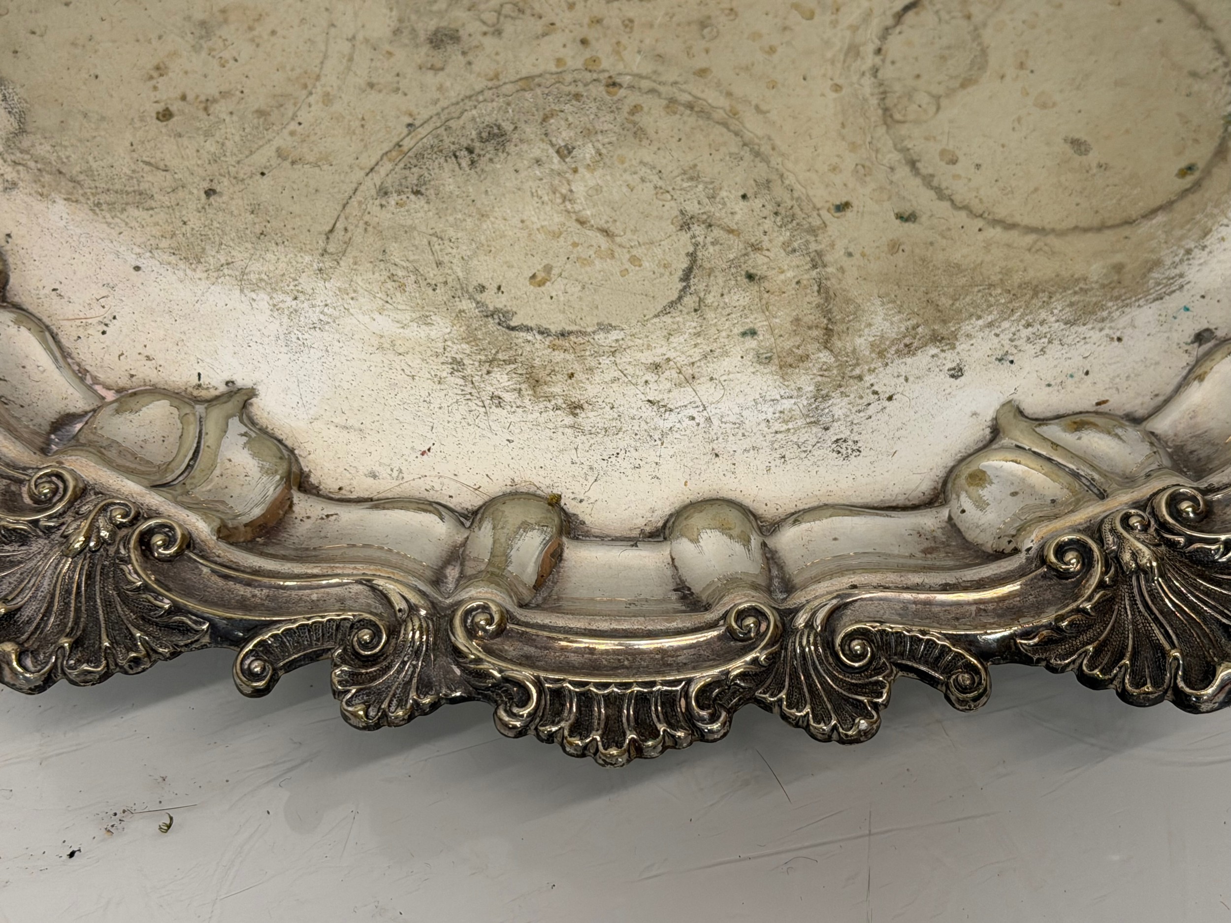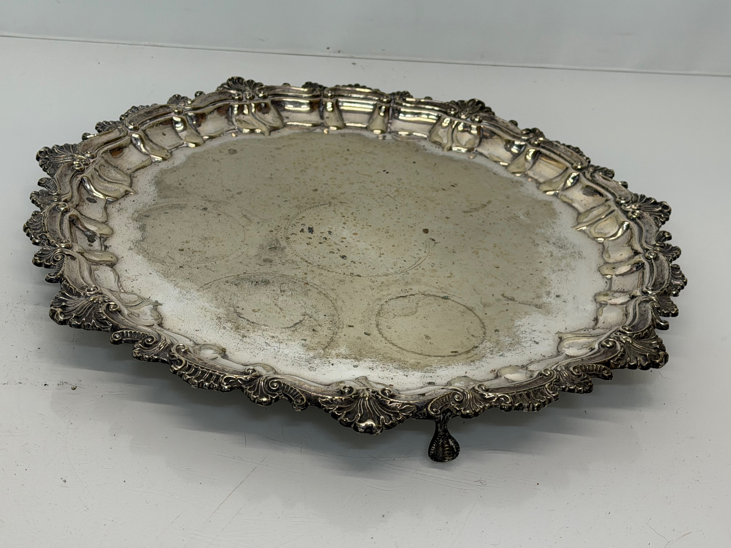 Silver plated table wares, two salvers 32 cm and 37 cm in diameter and a tray, 42 cm x 25 cm plus handles.