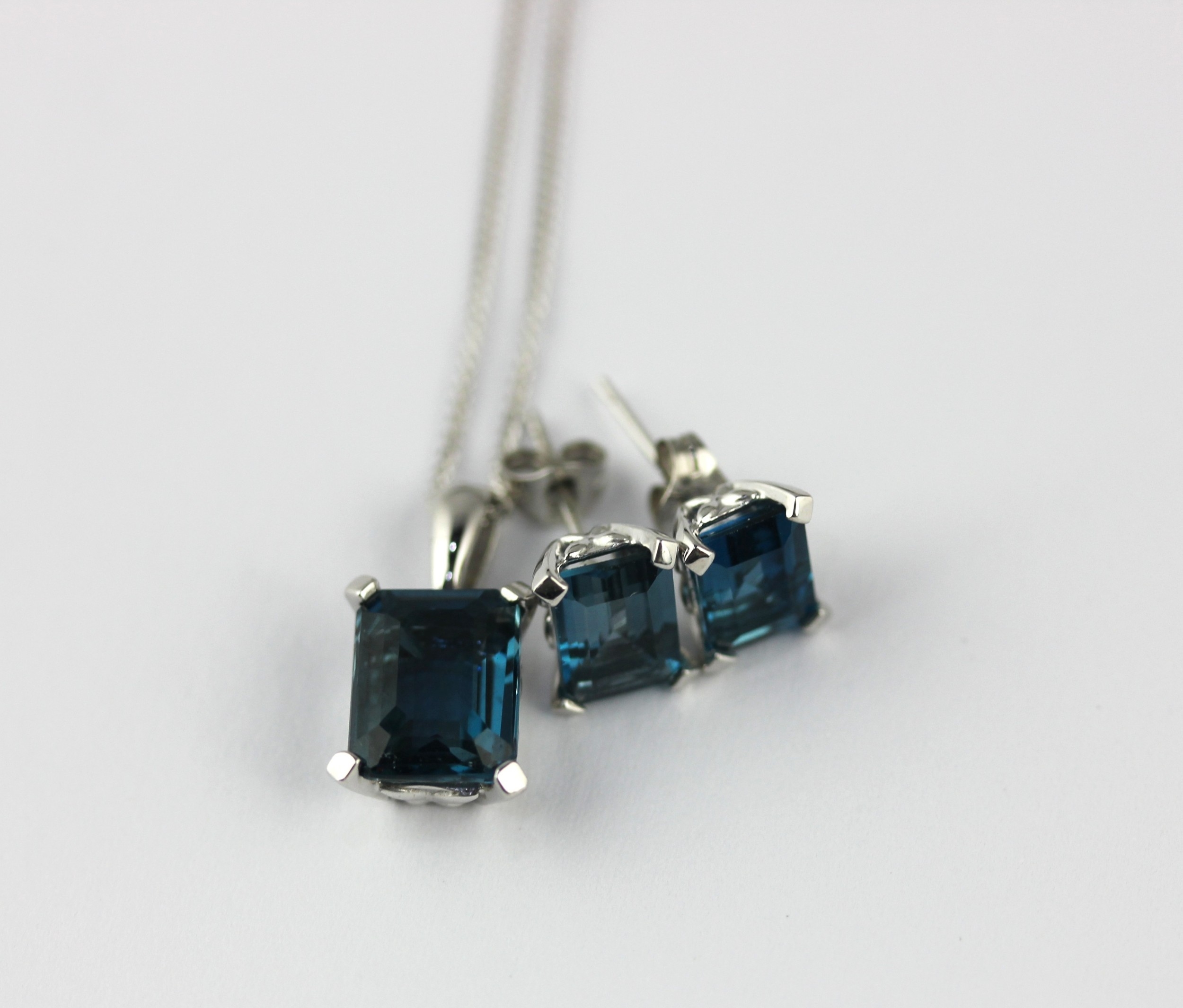 A 9ct white gold and London blue topaz single stone pendant with a 9ct white gold neck chain and a pair of matching ear studs with post and butterfly fittings, combined gross weight 3.8g with a box