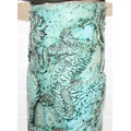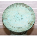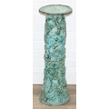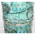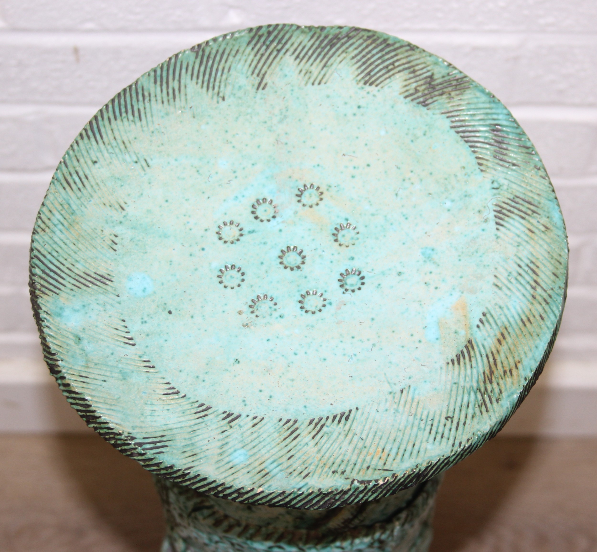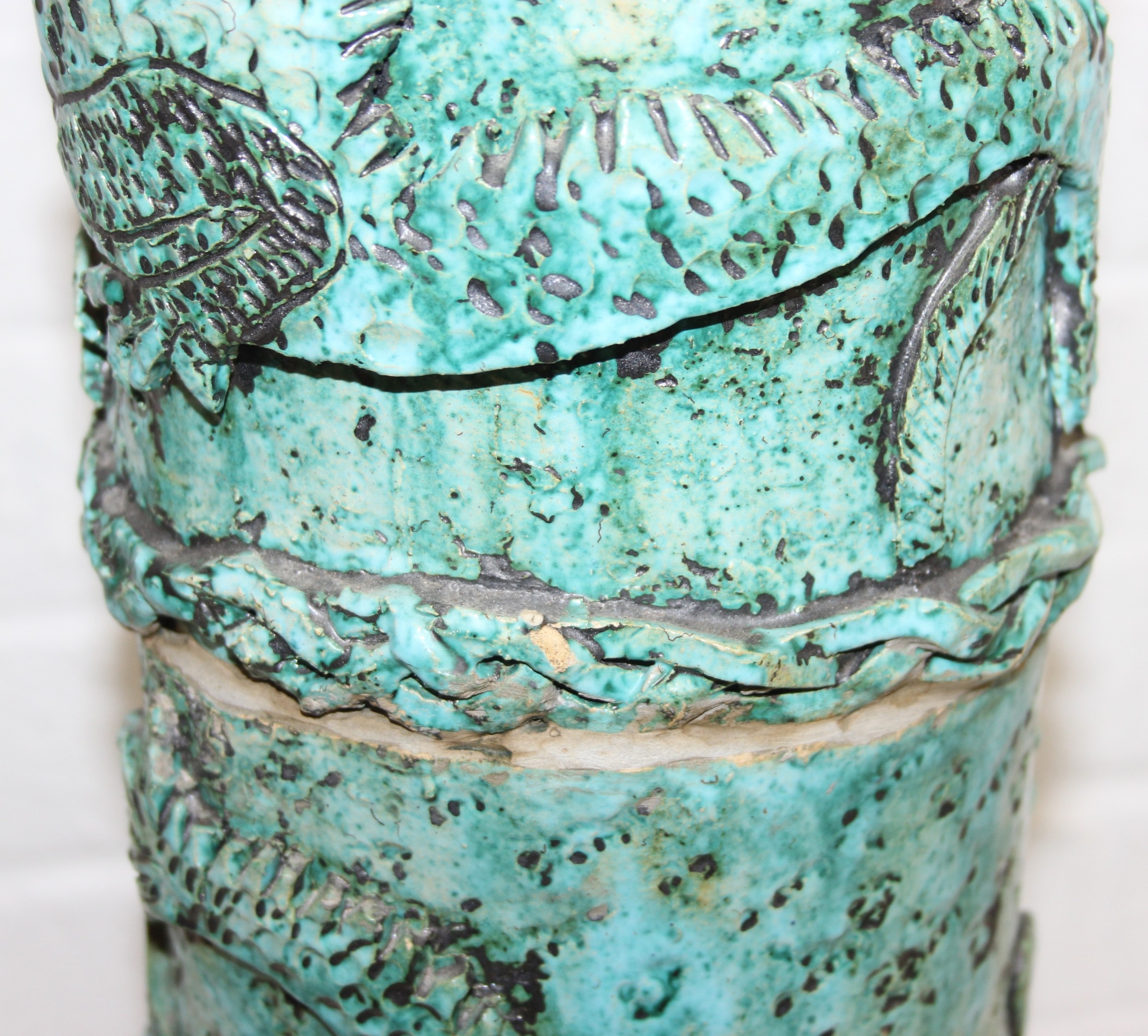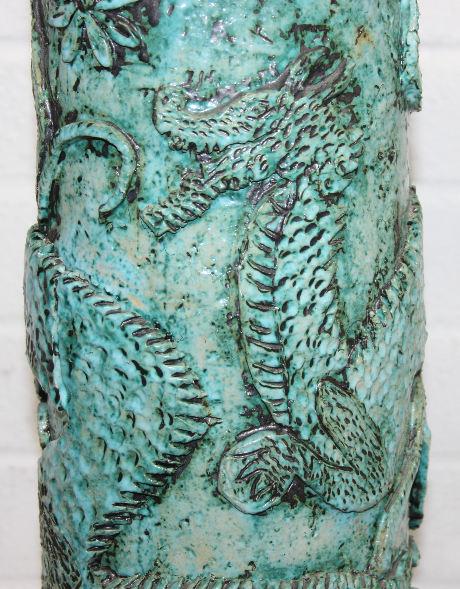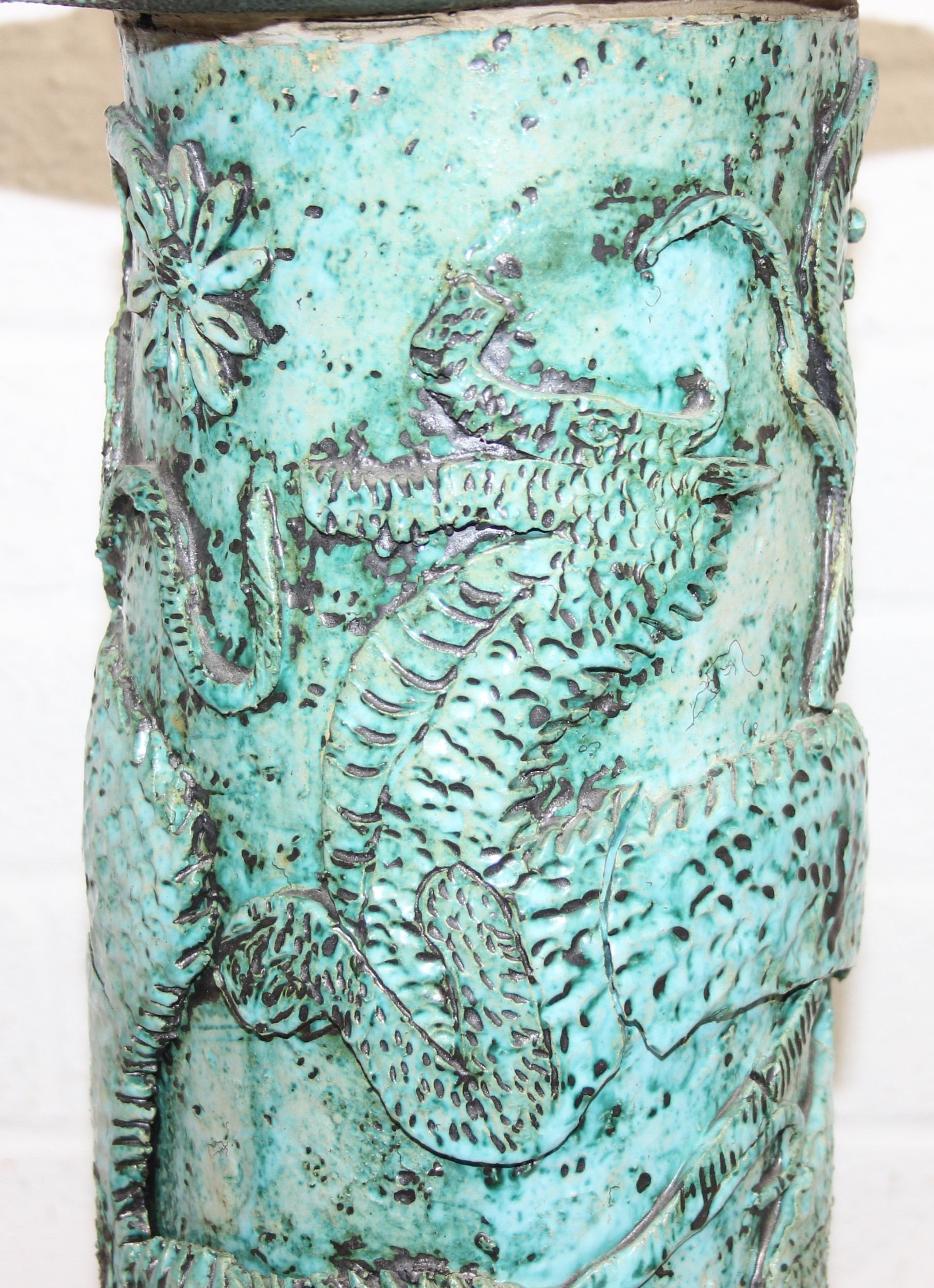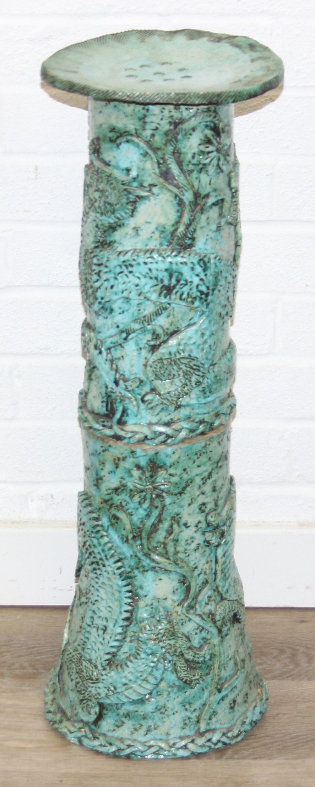 An unusual studio pottery jardinière stand, decorated with dragon and flowers with turquoise glaze, seemingly unmarked, 22cm diameter x 69cm tall