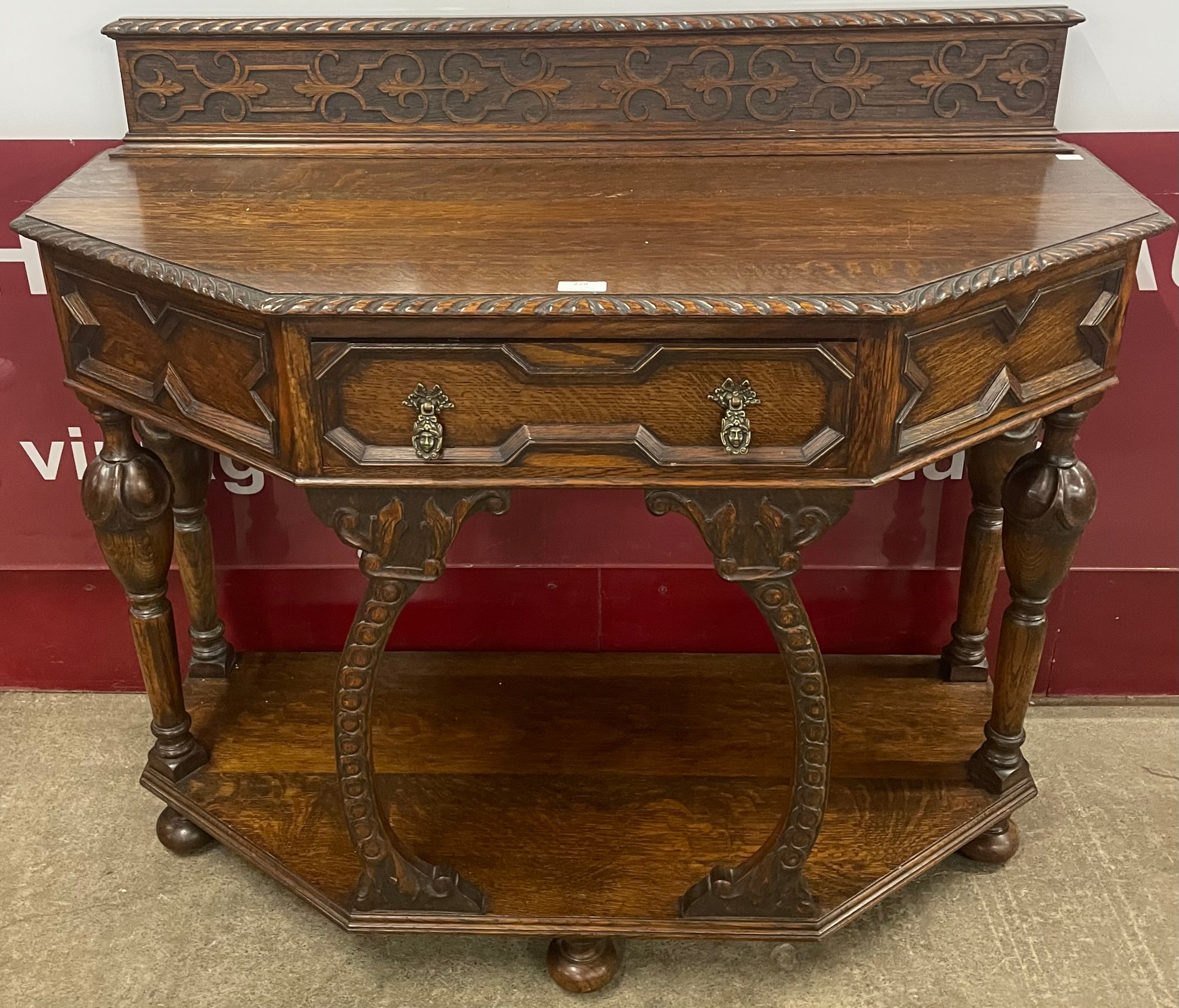 A 17th Century style carved oak single drawer console table