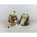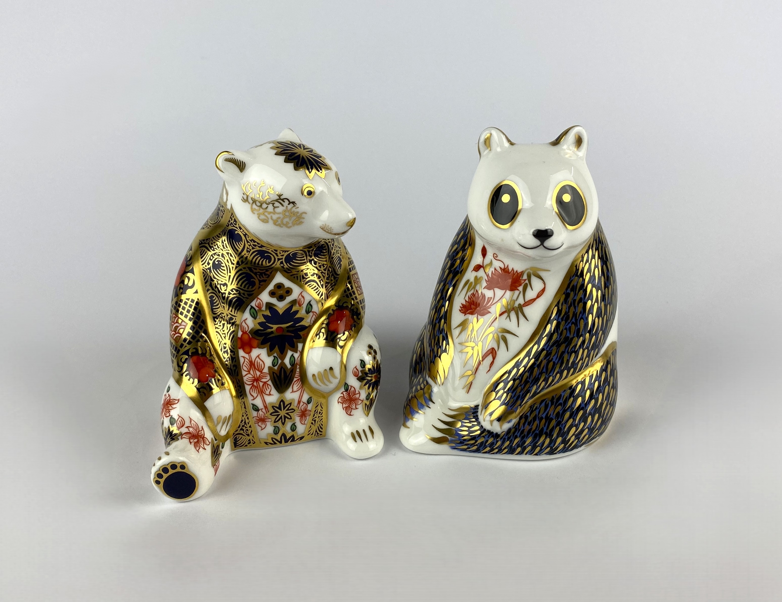A Royal Crown Derby 'Panda' paperweight, decorated in typical Imari colours, with gold stopper and red mark to base, height 10.5cm, together with a Royal Worcester porcelain 'Old Imari Honey Bear' paperweight, with silver stopper and red mark to base, height 10.5cm (2)