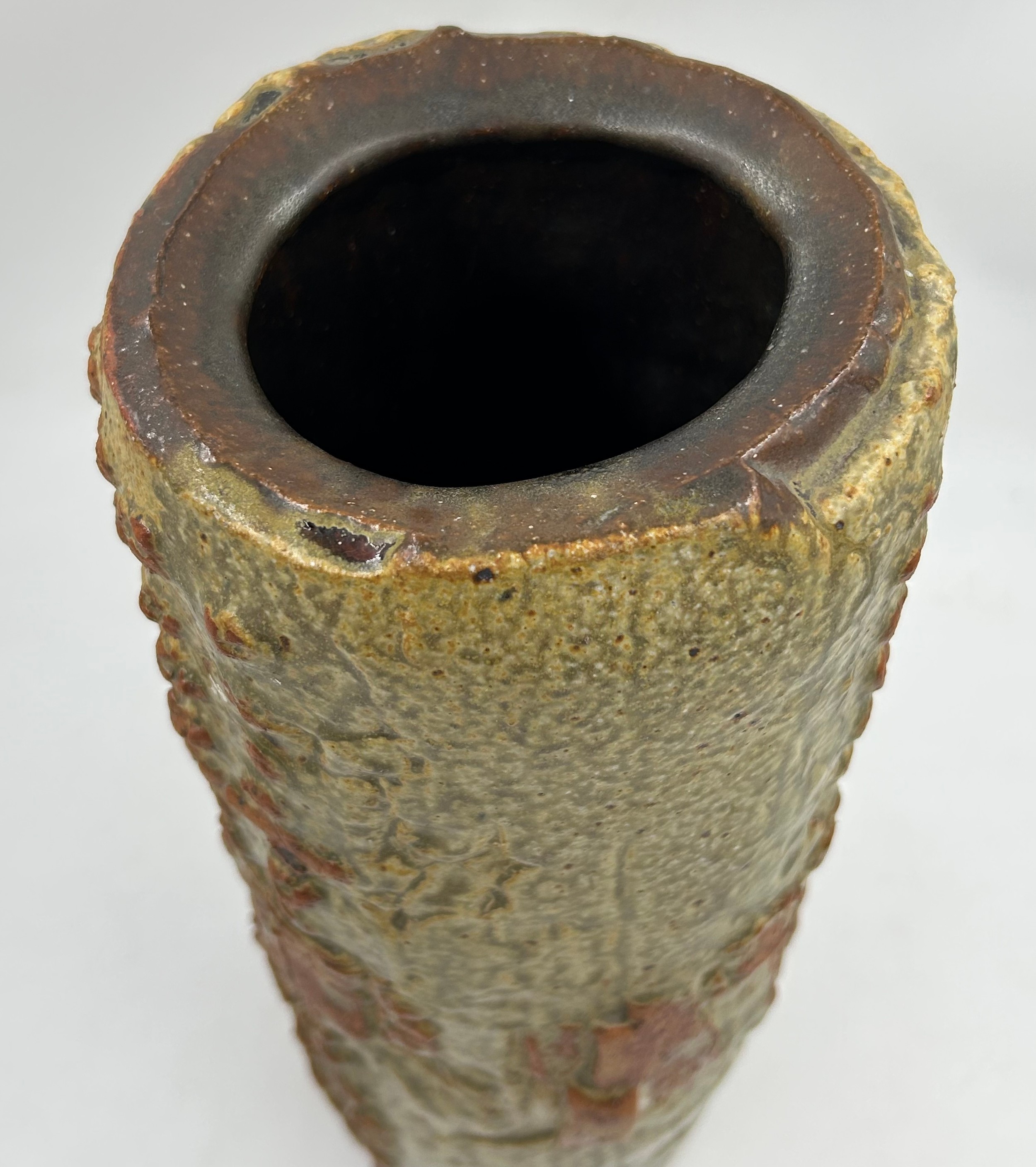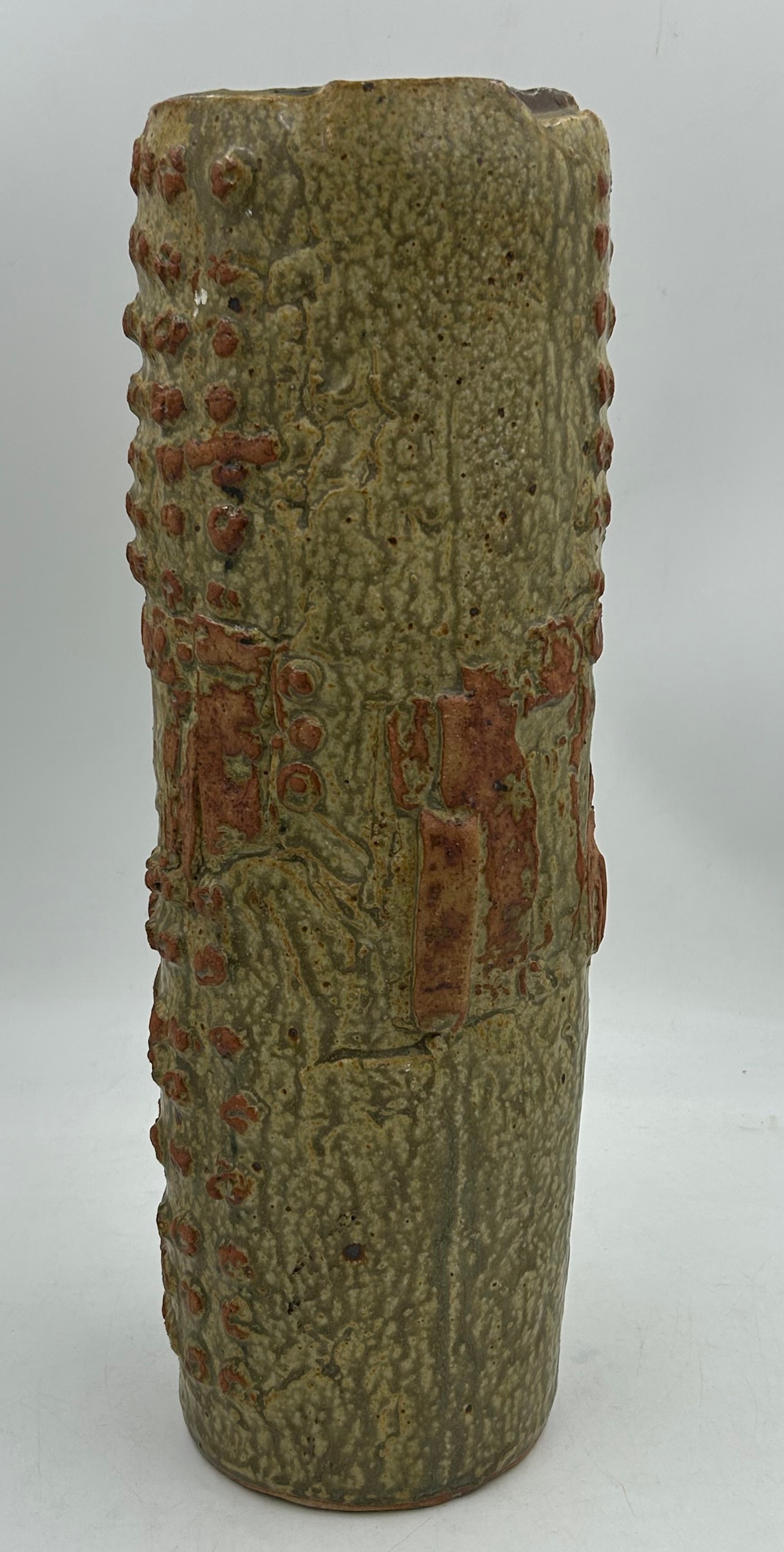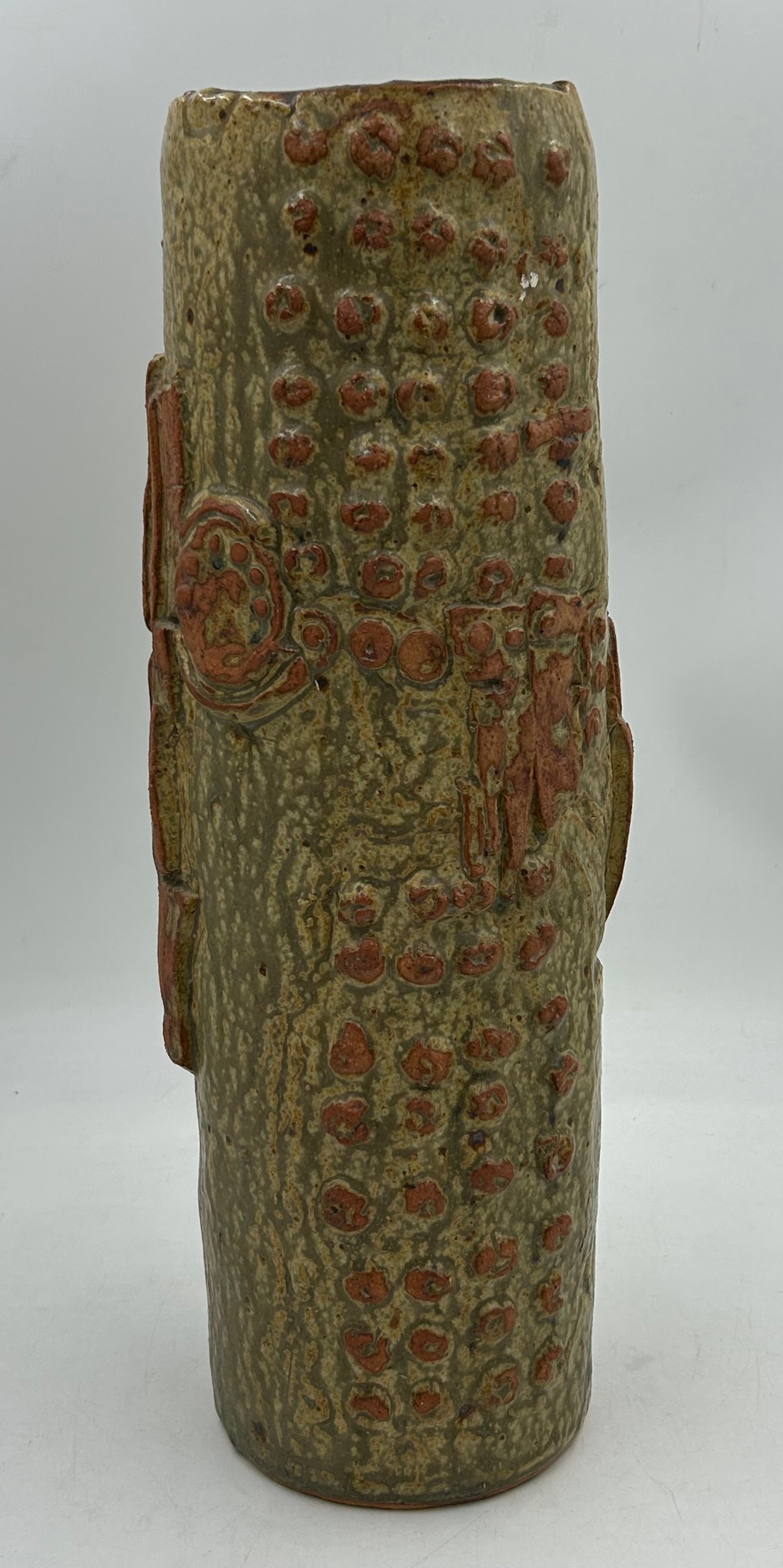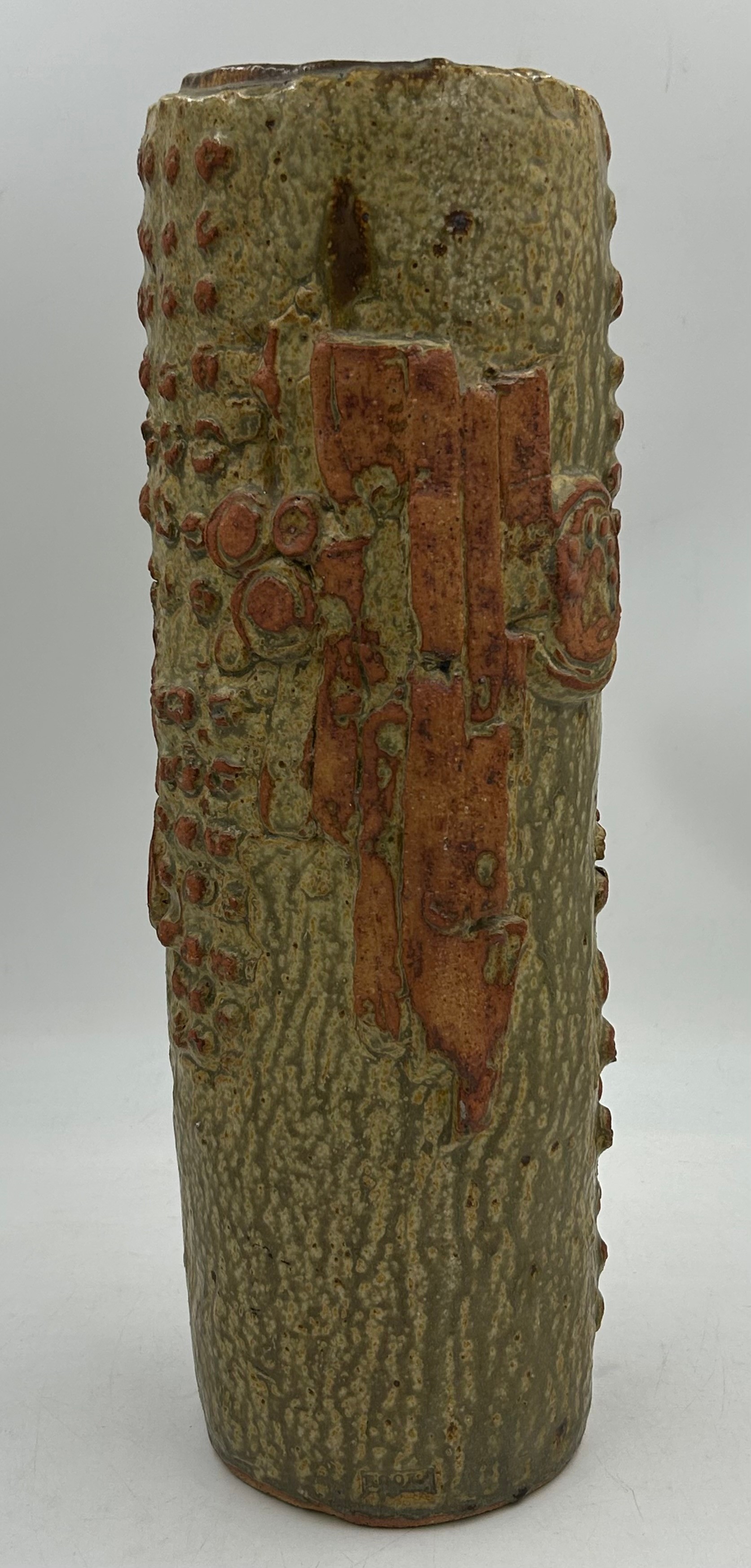 Bernard Rooke (British 1938-): A studio pottery vase with relief pattern, makers mark 'Rooke' stamped to the lower edge 47cm h x 14cm d.