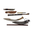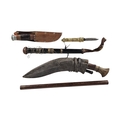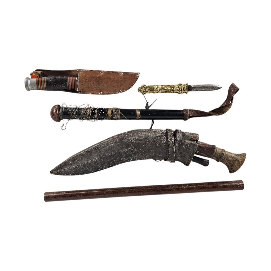 Comprising a Nepalese Kukri with karda and chakmak in leather scabbard, a mid Century hunting knife with stacked leather grip and original sheath, a wire bound weighted trench club with leather wrist strap, a small brass hilted decorative dagger; a turned mahogany baton; and assorted military ephemera.
