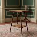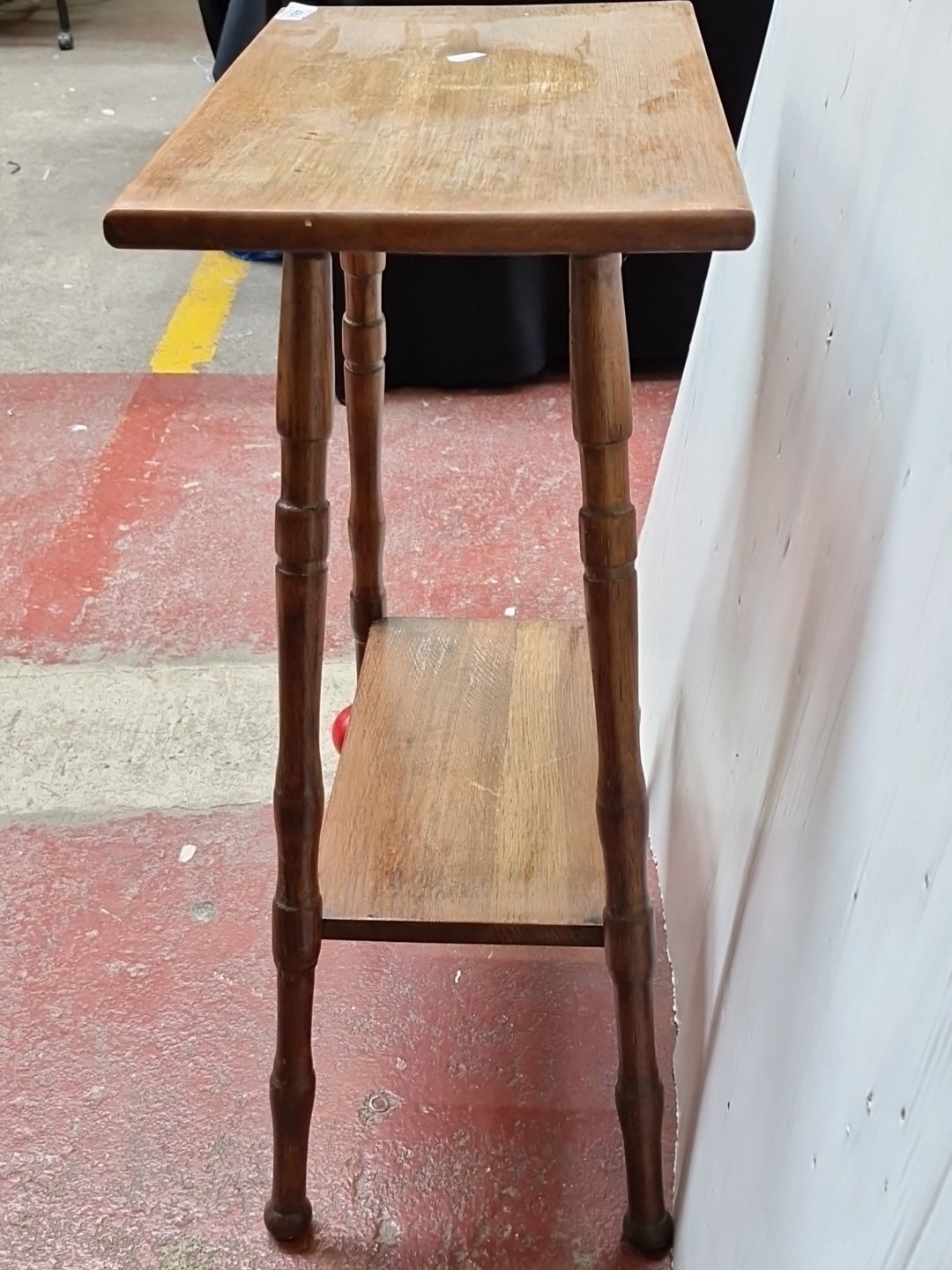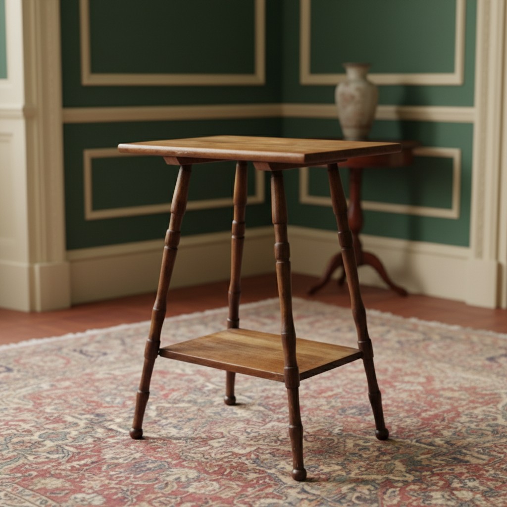 A small oak occasional table, the rectangular top with rounded corners raised on turned tapering legs with an undertier. Please note, the image of the modelled item was created by a new imaging/ staging software called showiton.ai. Upload a simple image of a piece of jewellery and the software stages it on a model for you. Paste the URL (showiton.ai) into your browser and try it for free. It’s a very simple, user-friendly platform.