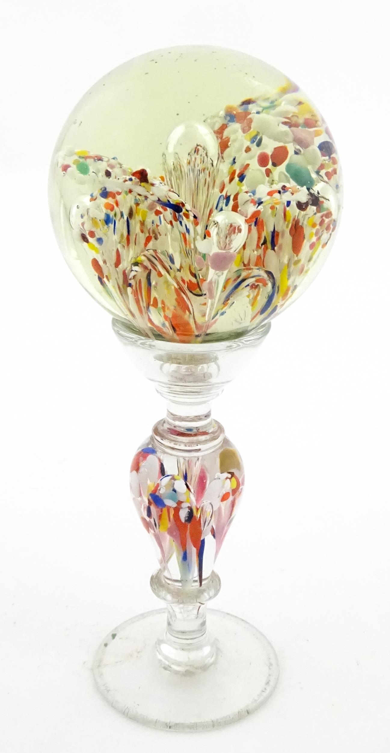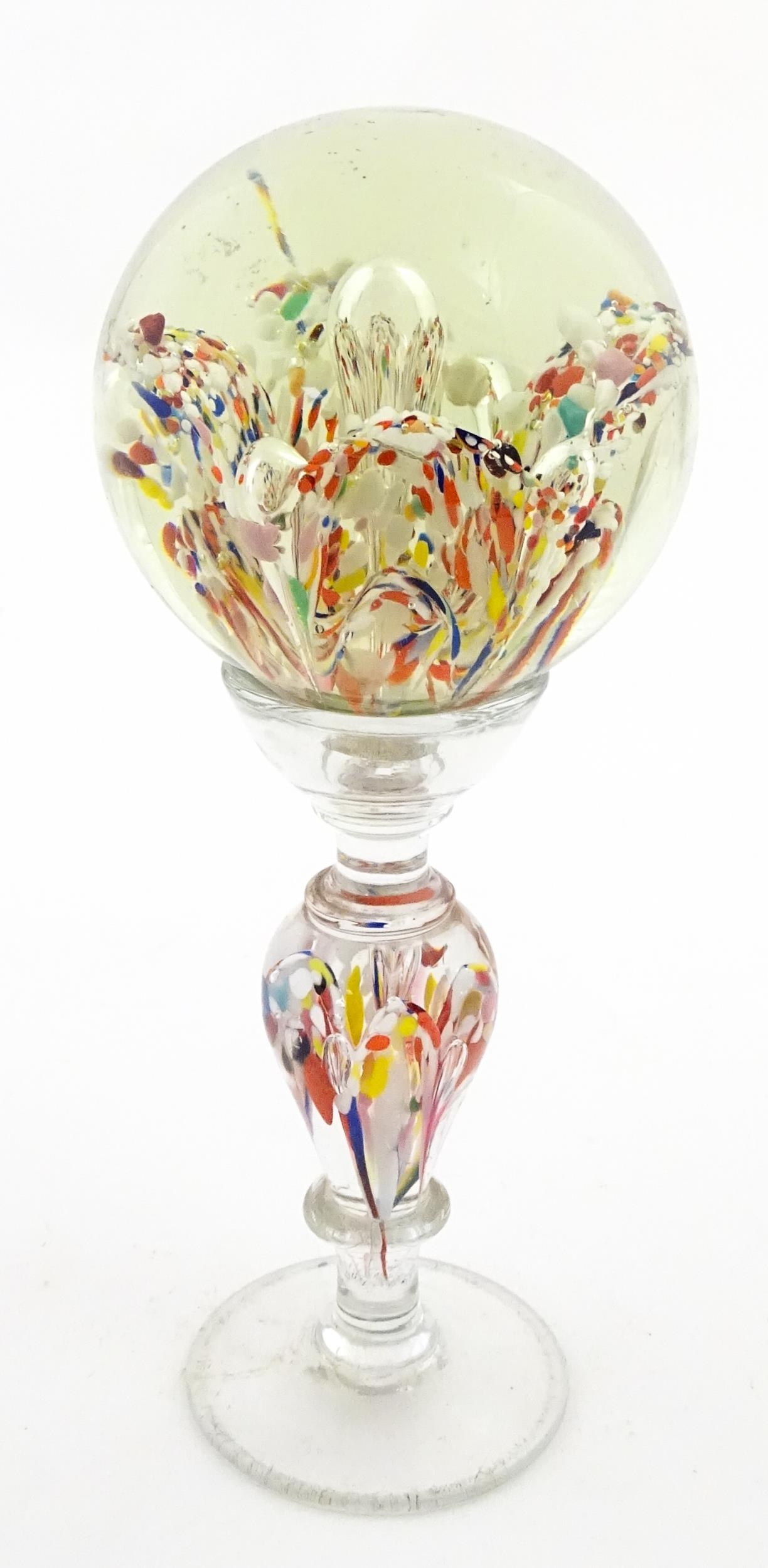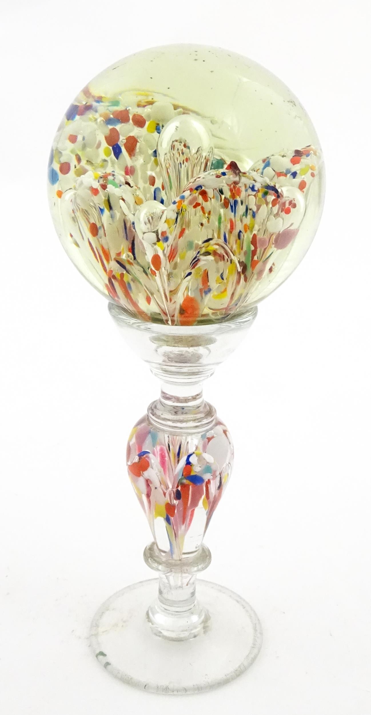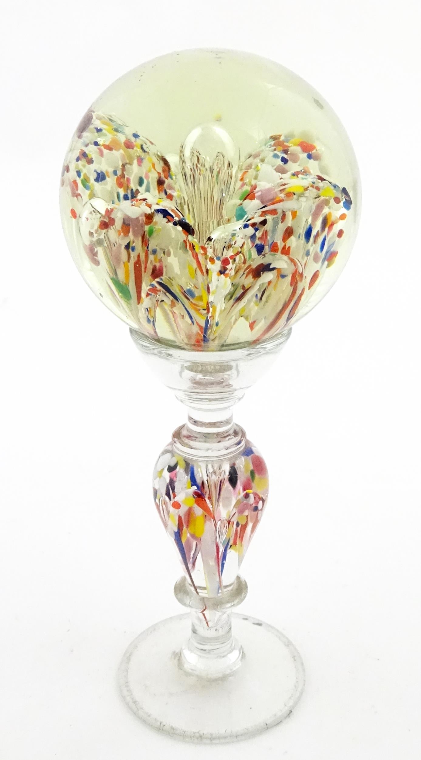 A glass pedestal paperweight / wig stand. Approx. 9 1/2" high overall