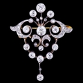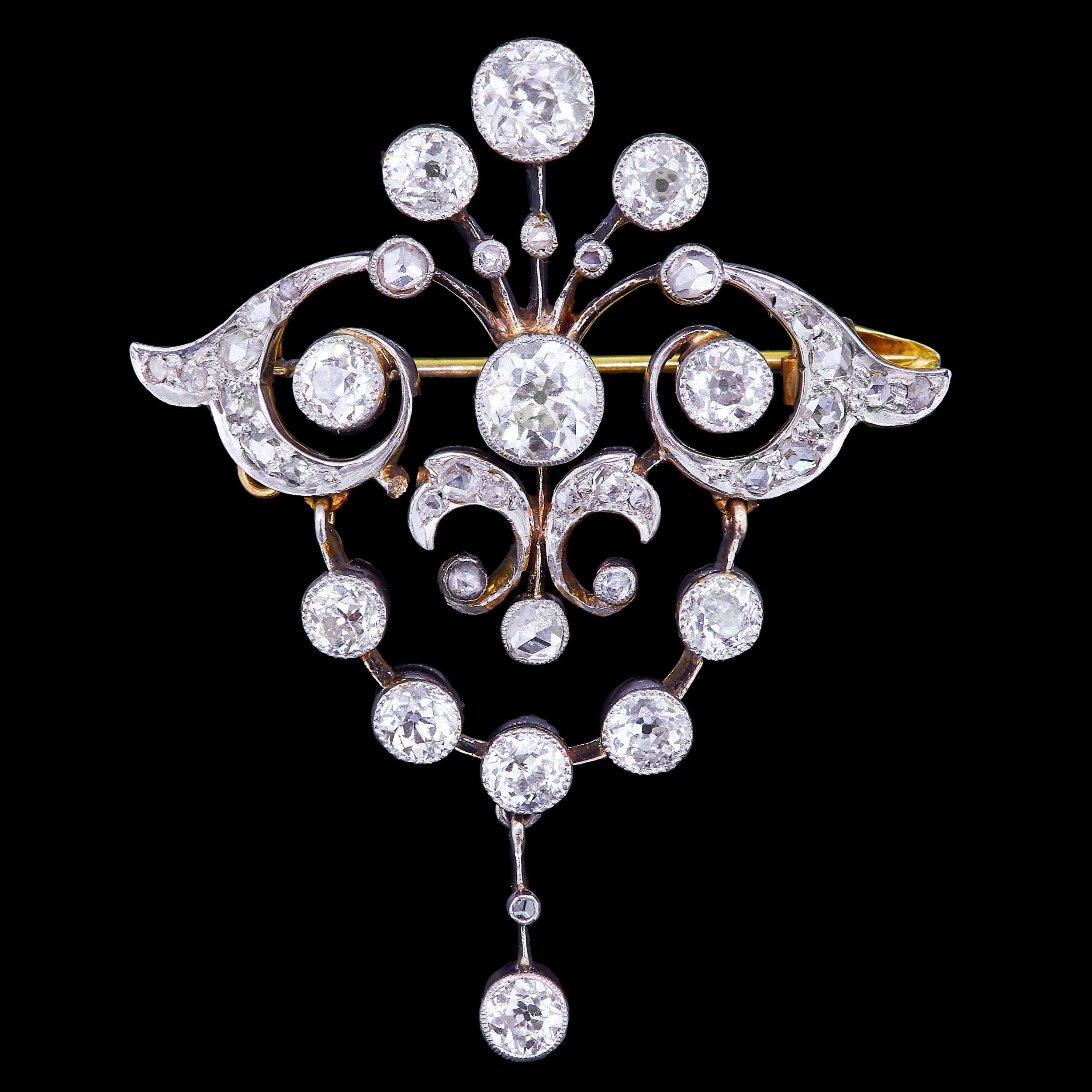 ANTIQUE BELLE-EPOQUE DIAMOND DROP BROOCH, of openwork part scrolling dsign, set with diamonds and suspending a diamond guirland drop totalling approx. 2.30 ct. L. 4.4 cm. 8 grams. With a fitted box.