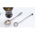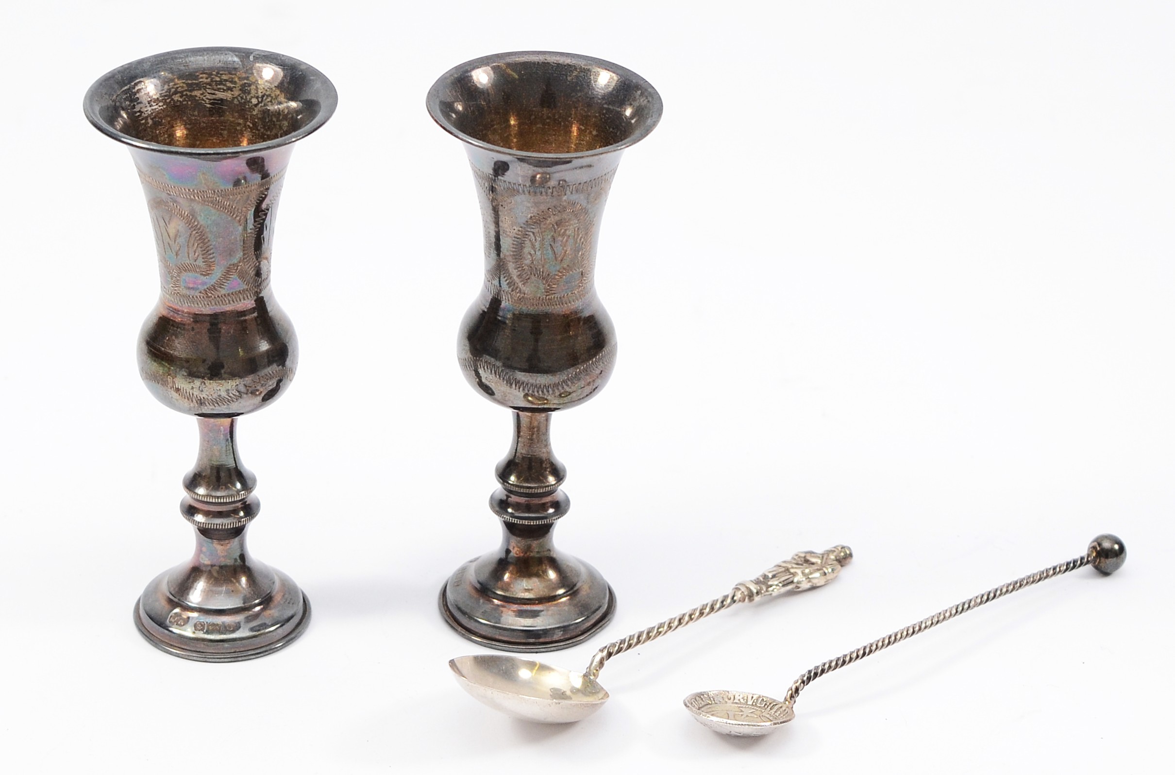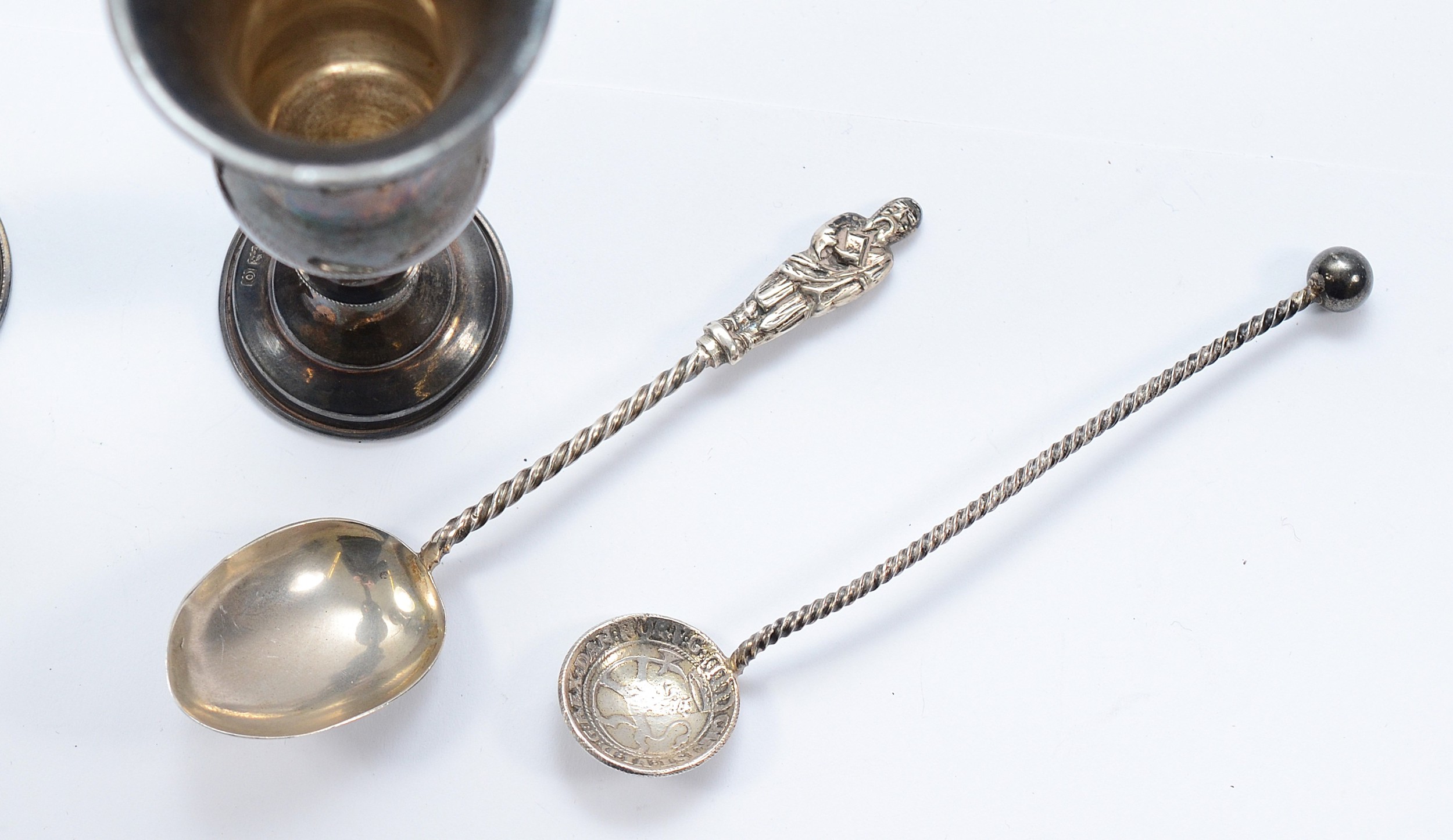 A pair of silver Kiddush cups, Birmingham 1913, 11cm tall, together with a silver apostle spoon, Birmingham 1896, and a Danish skilling coin spoon, with twisted handle. 72gm