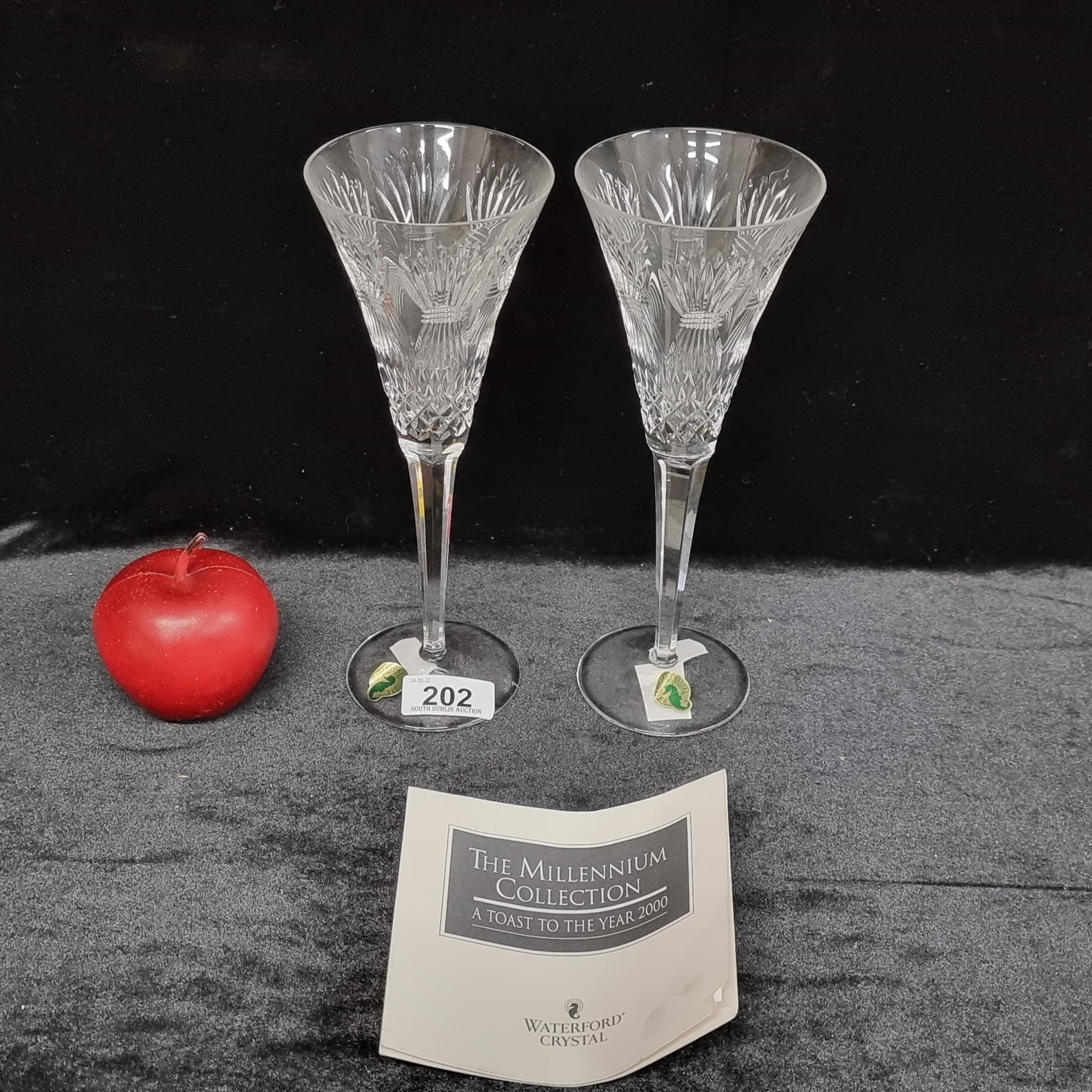 A pair of toasting champagne flutes by Waterford Crystal in the prosperity pattern for the Millennium collection. Very pretty examples with hexagonal stems.