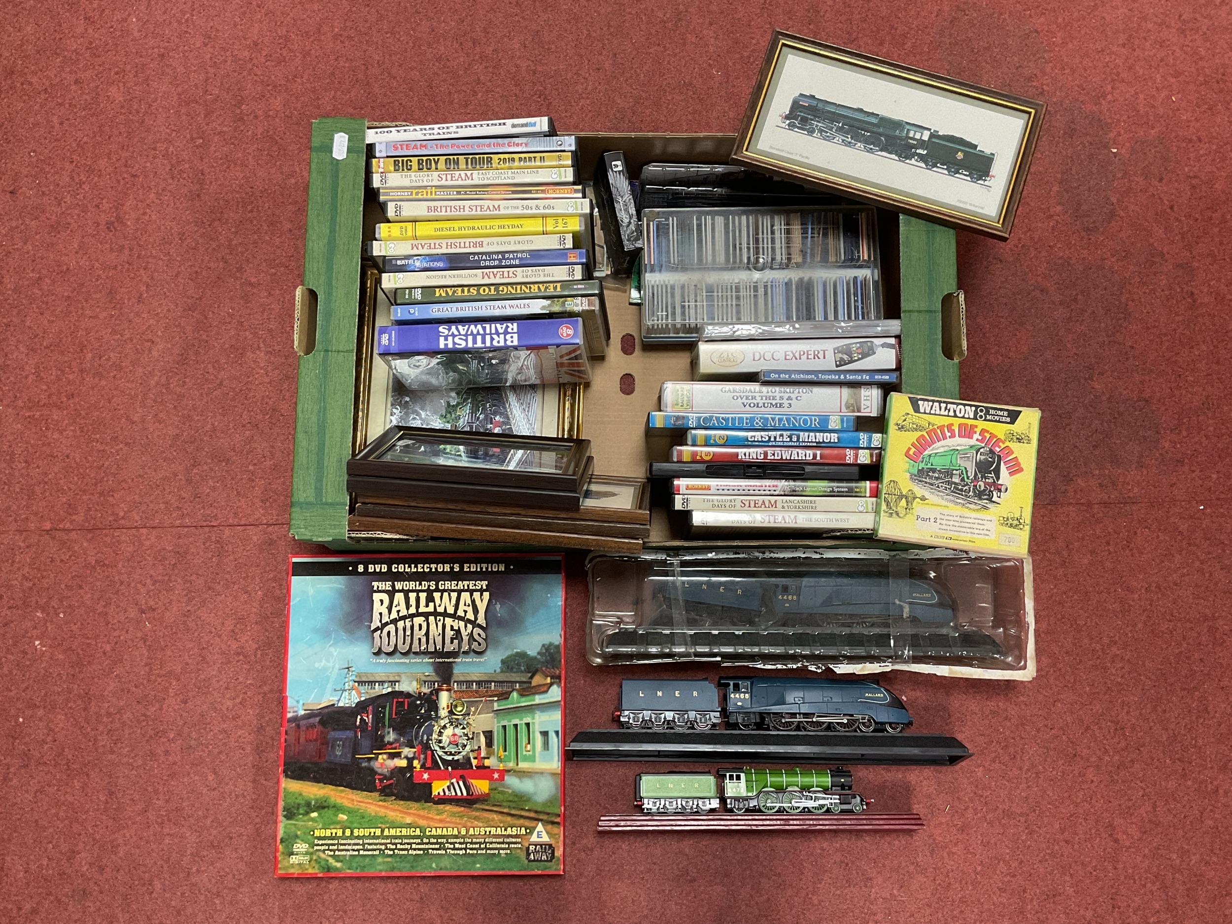 A Collection of Railway Themed DVD's, Photographic Slides, Framed Prints, Static Model Display Locomotives, etc.