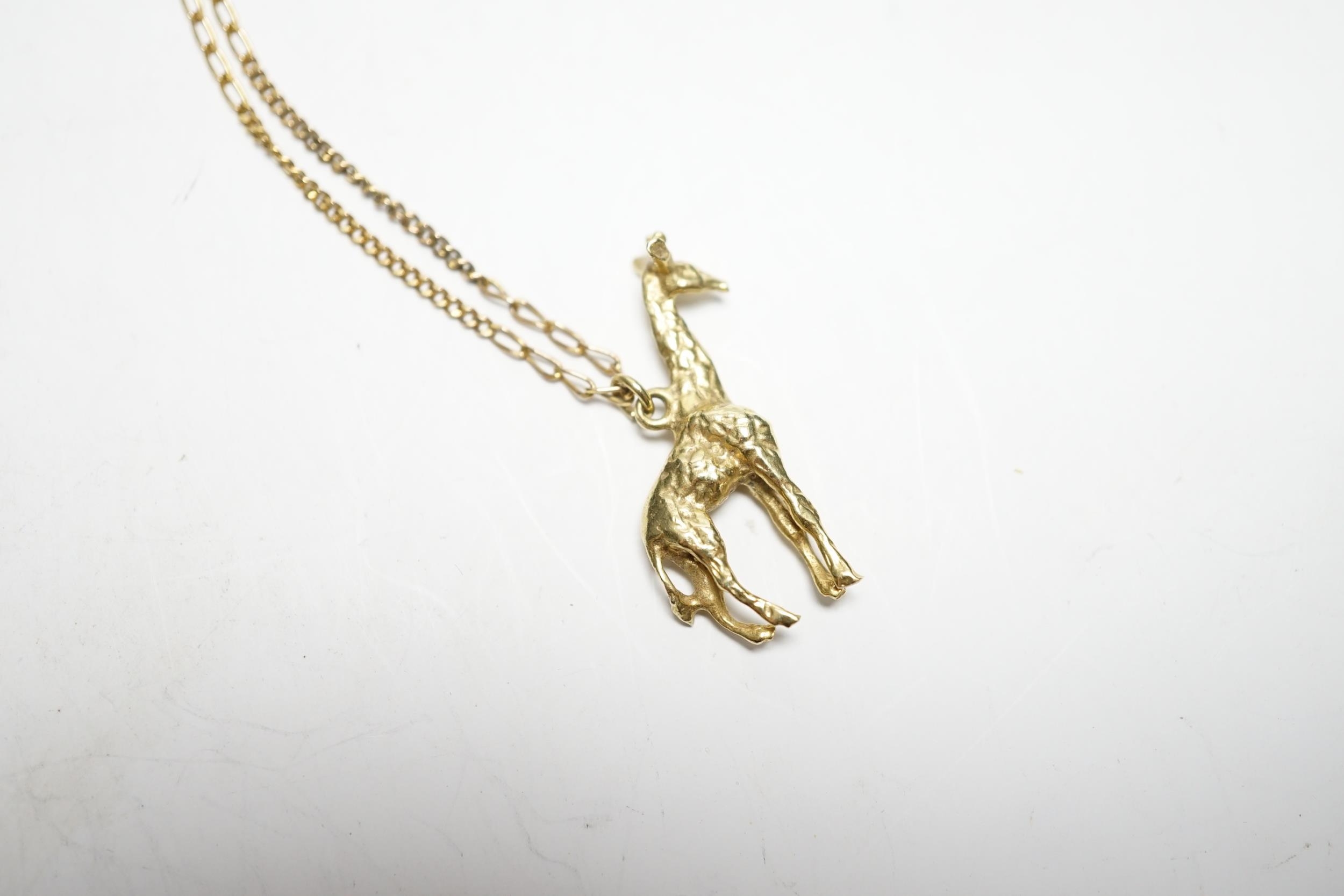 A South African yellow metal giraffe pendant, 30mm, on a 9k chain, gross weight 7.4 grams.