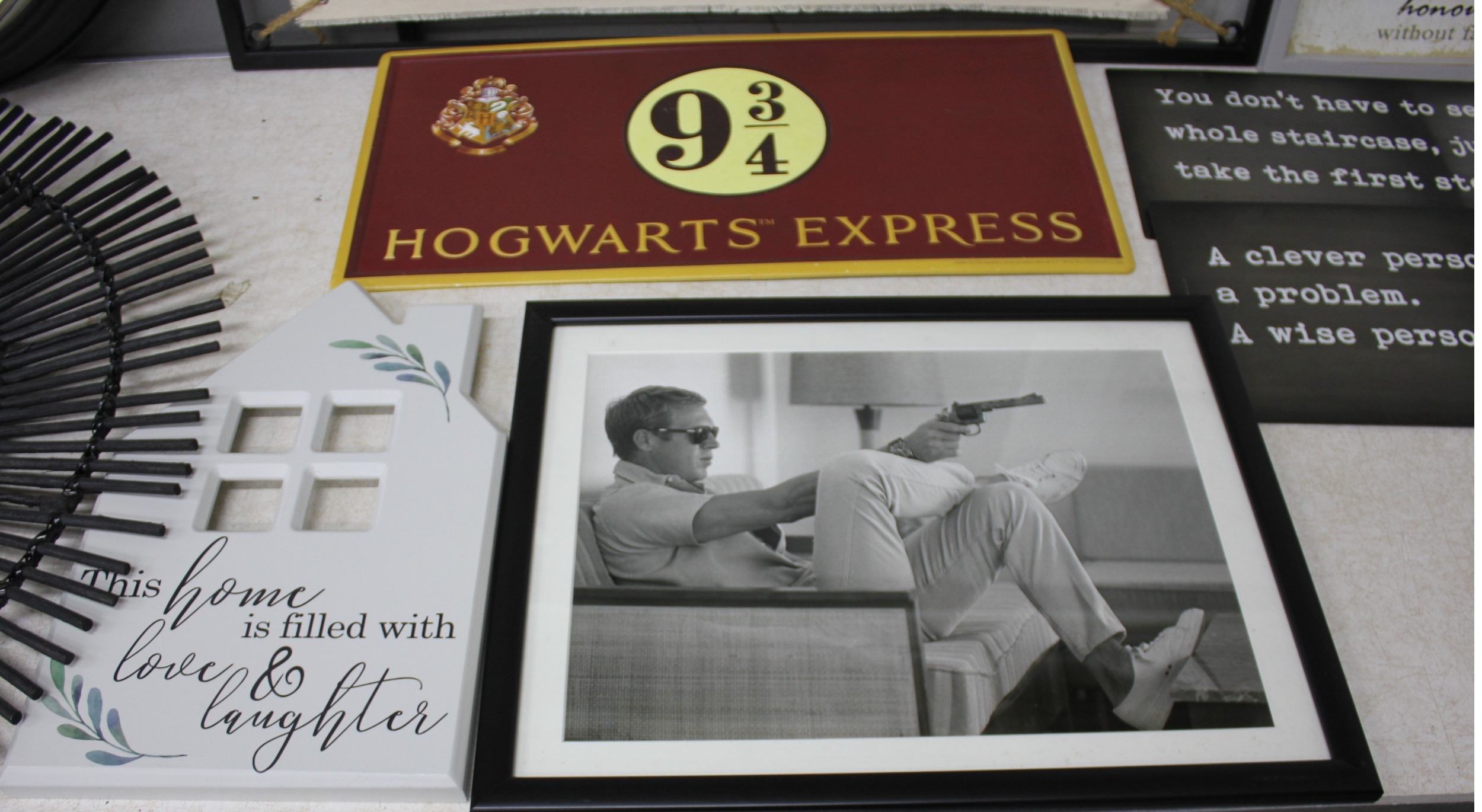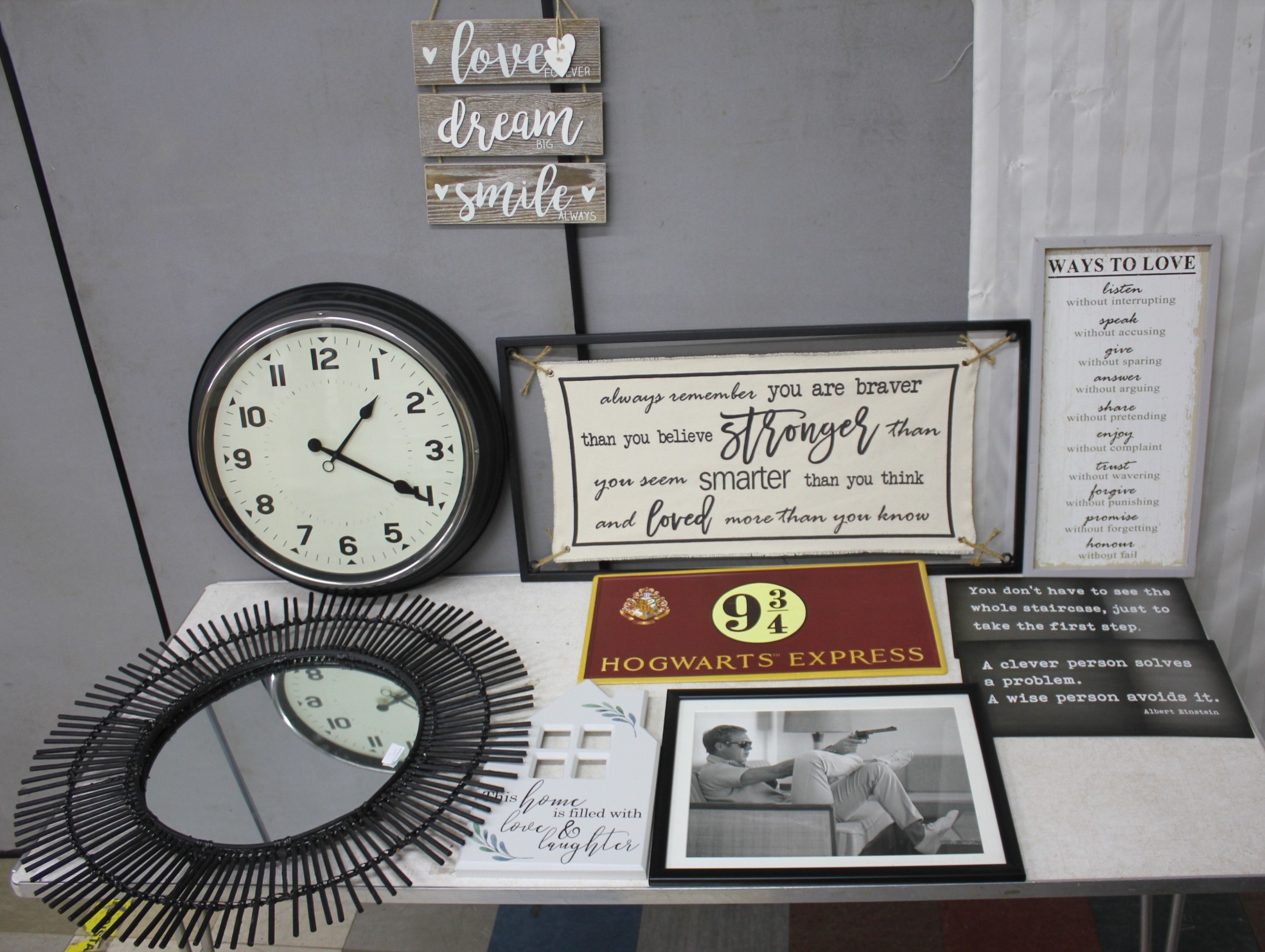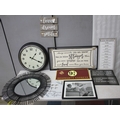 LARGE WALL CLOCK, MIRROR & VARIOUS PICTURES & PLAQUES