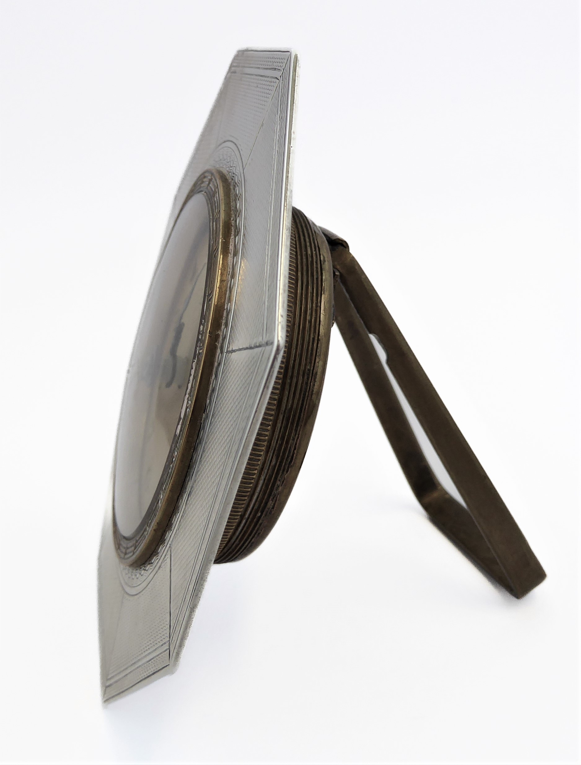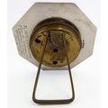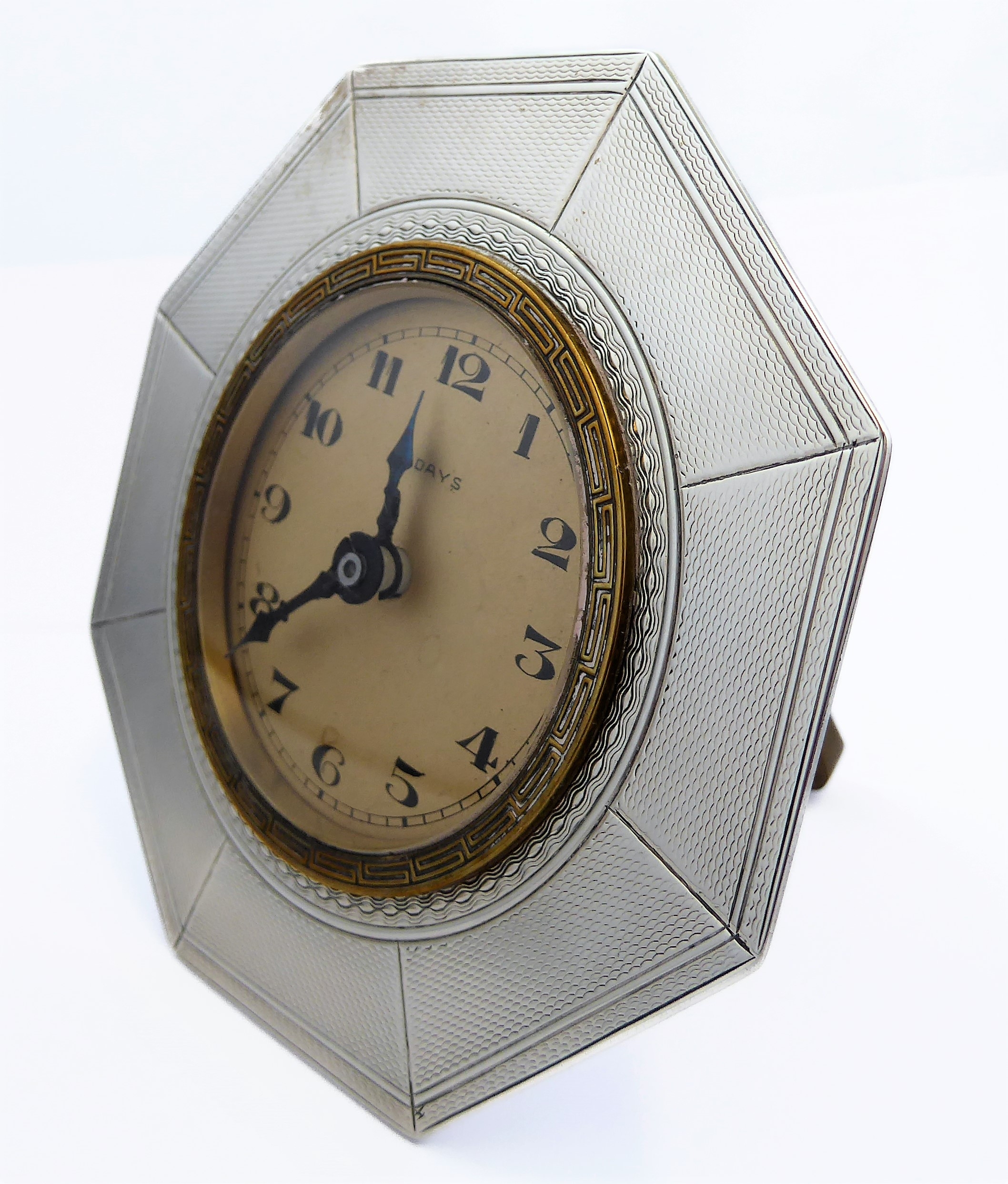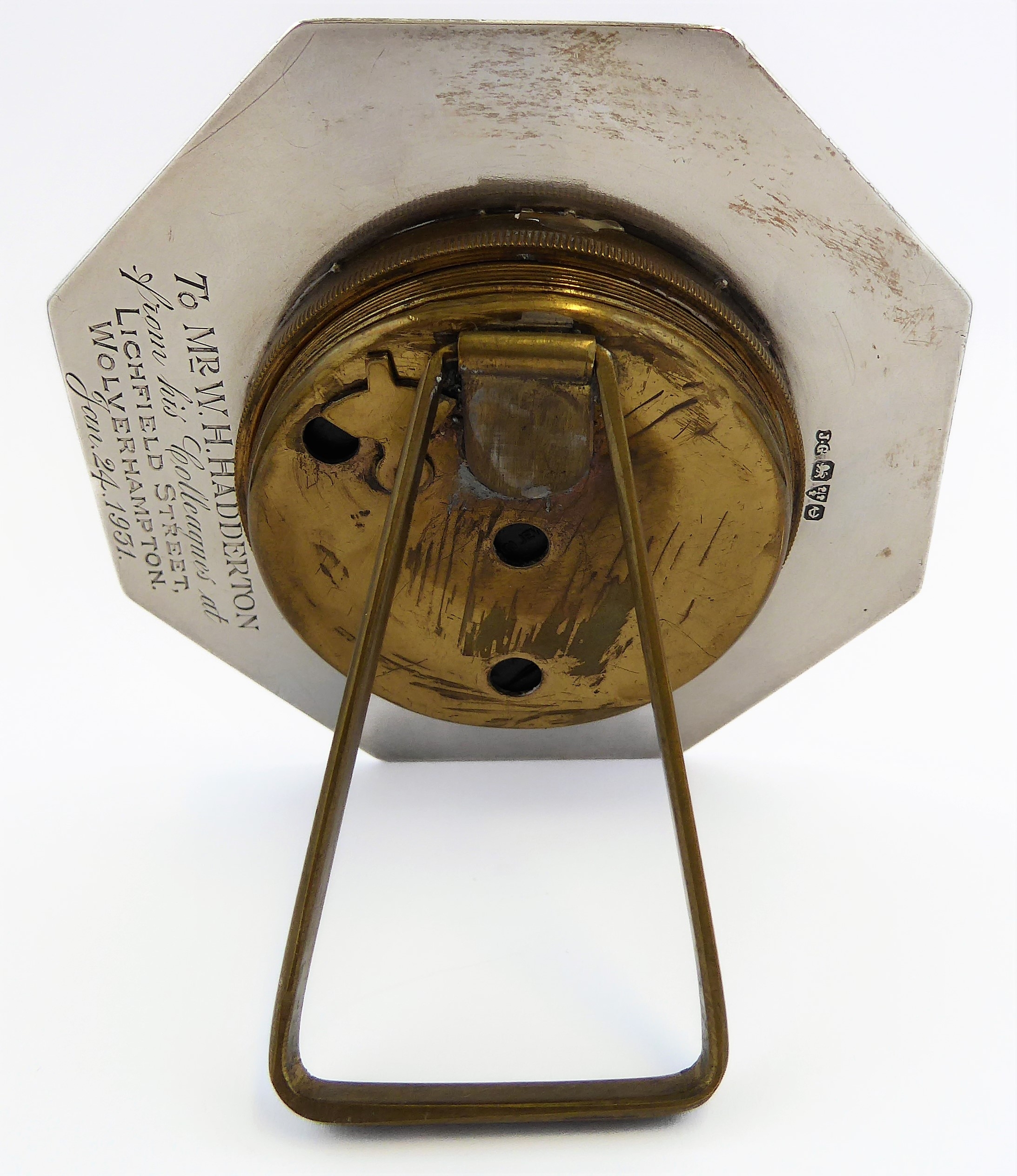 *** DESCRIPTION REVISED *** An eight-day bedside-style clock: octagonal hallmarked silver frame; beige dial with Arabic numerals and easel-style stand. The back of the frame with maker's mark JG (Chester 1928) and 1931 engraved inscription. (9 cm high).