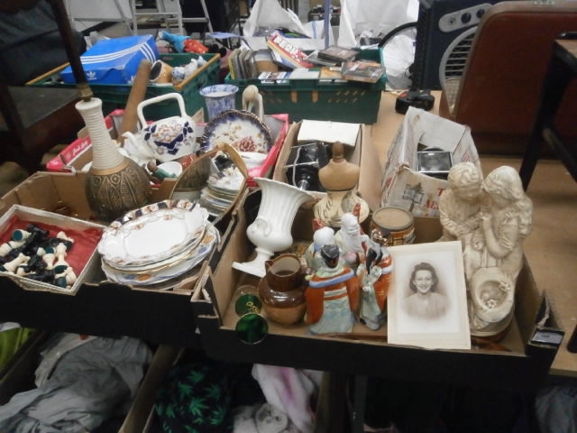 Four boxes inc oriental figurines, assorted pottery, chess pieces, candle lanterns, etc
