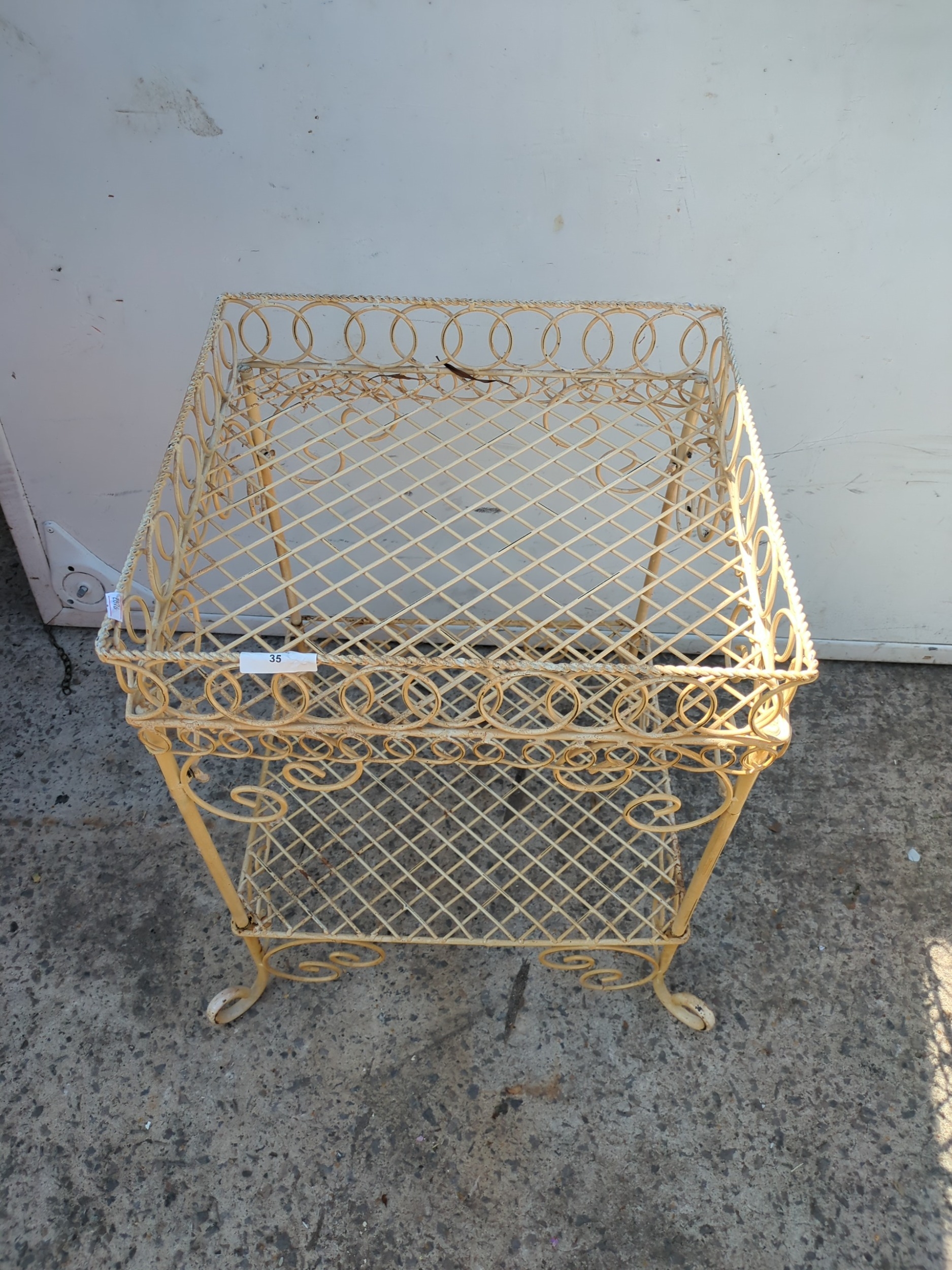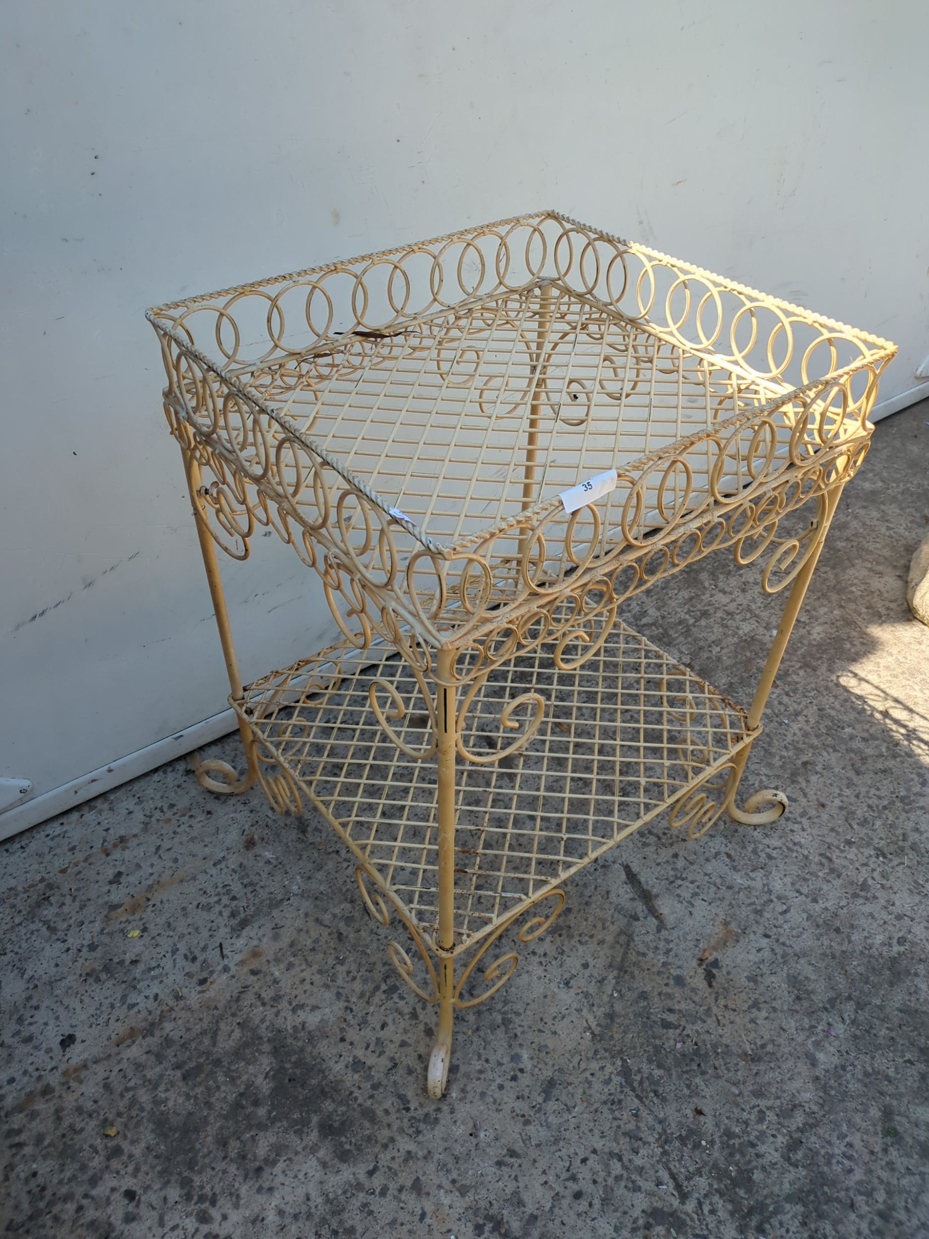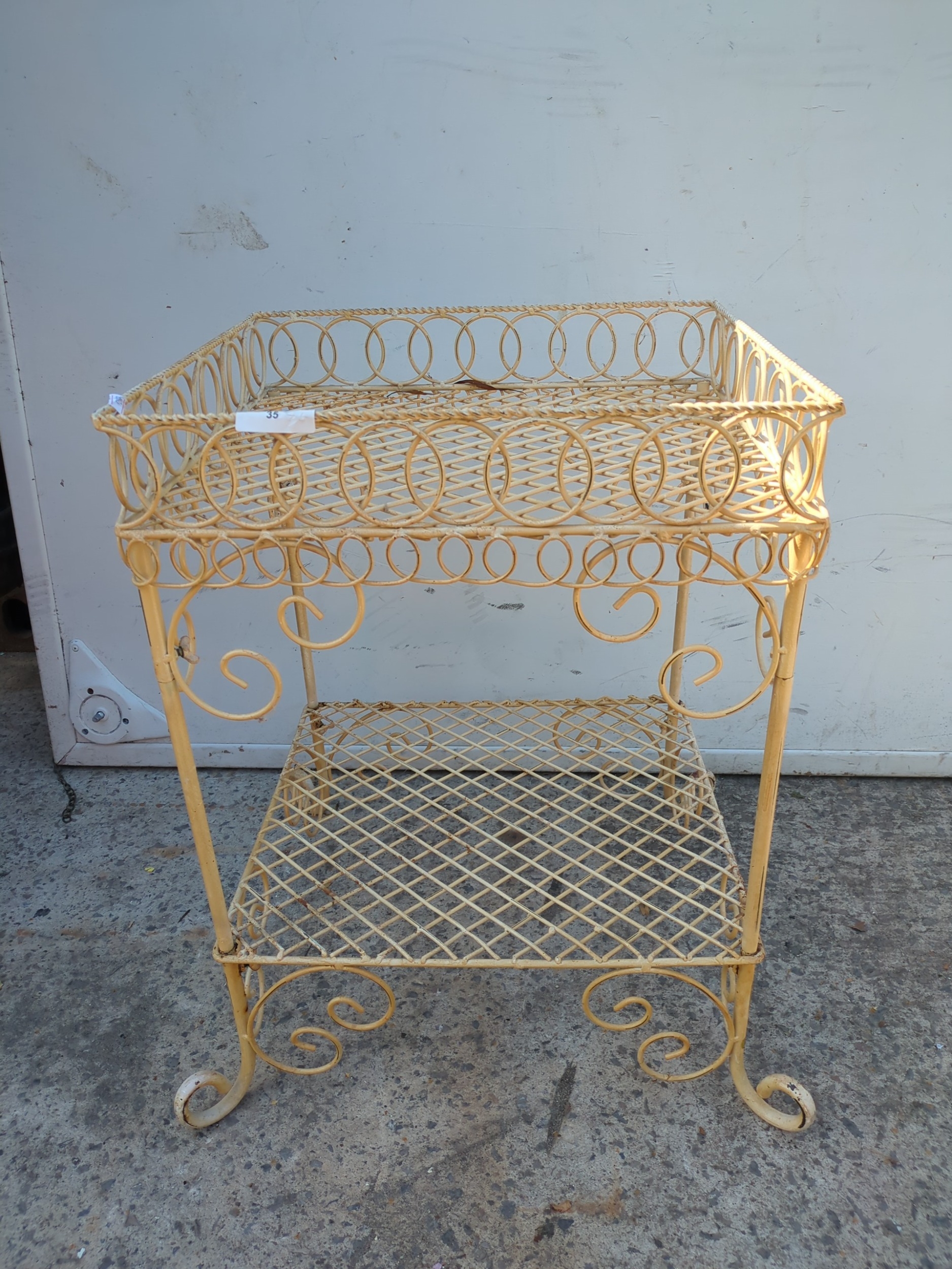 A wrought iron wheeled trolley