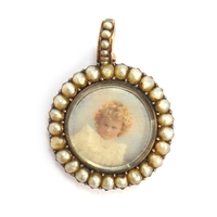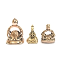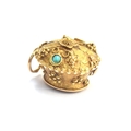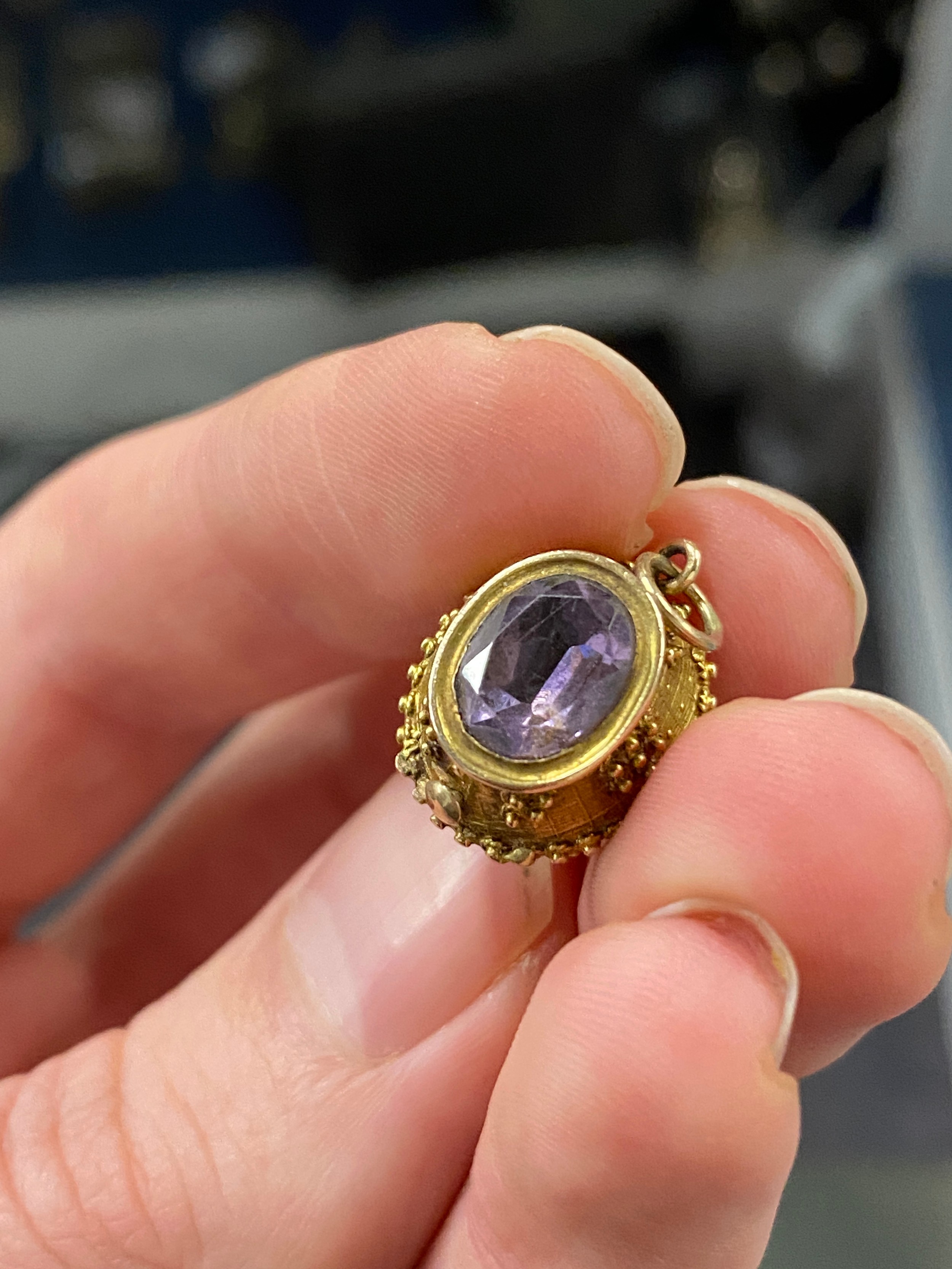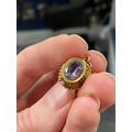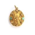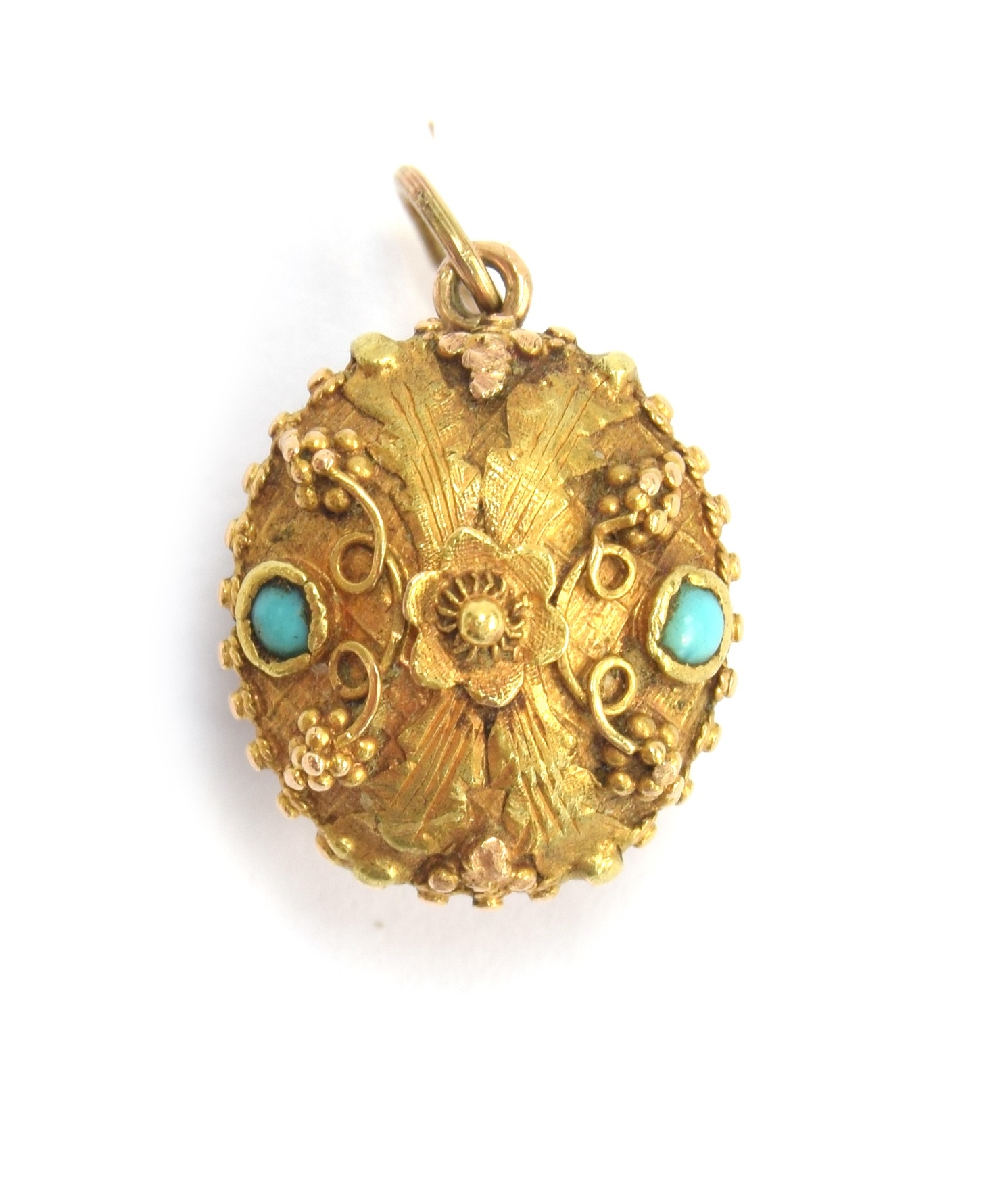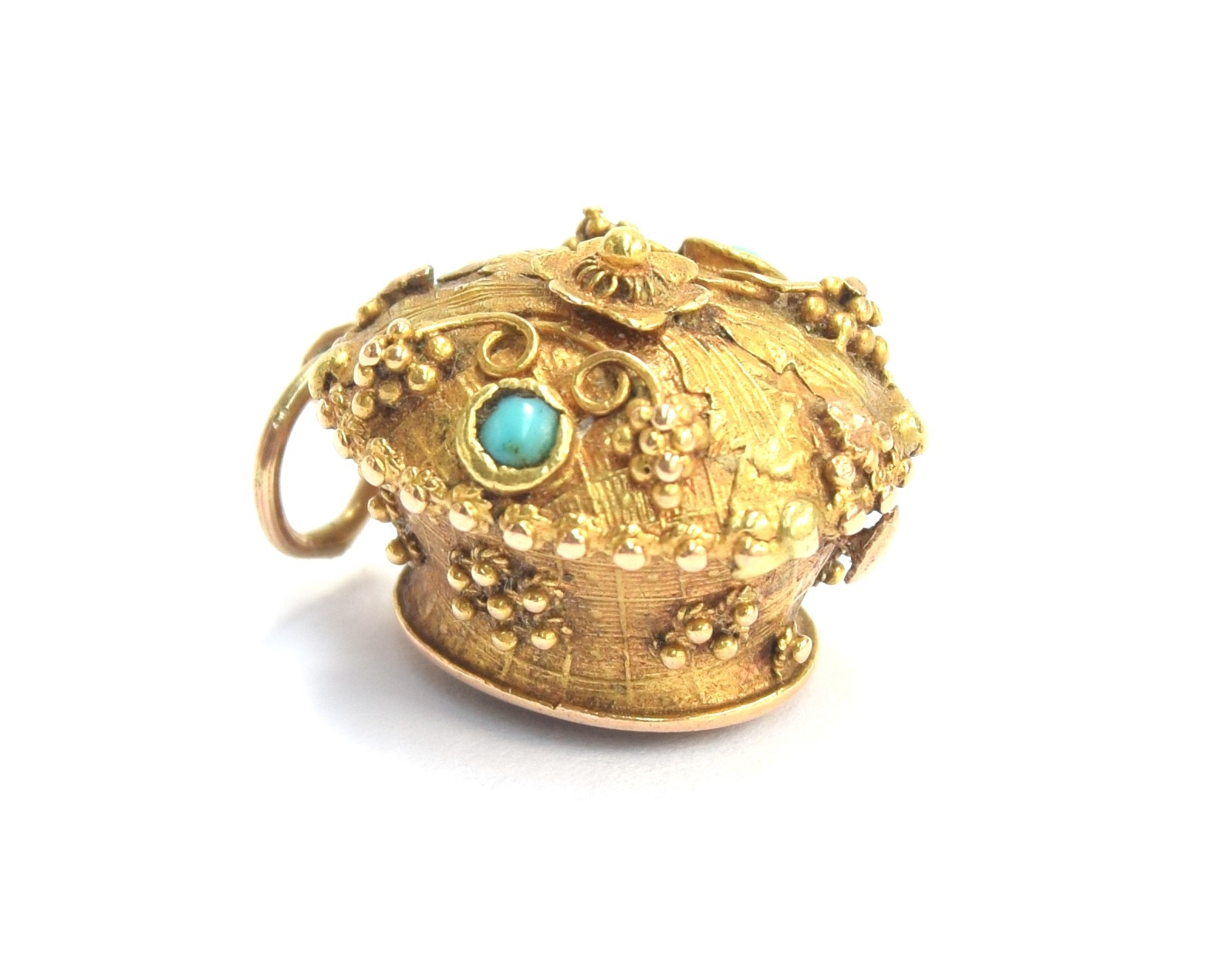 A small 19th century gold pendant of flower basket form with cannetille detail, set with turquoise cabochons, with a foil backed amethyst base, 1.5cm long excluding bail, 2.4g