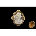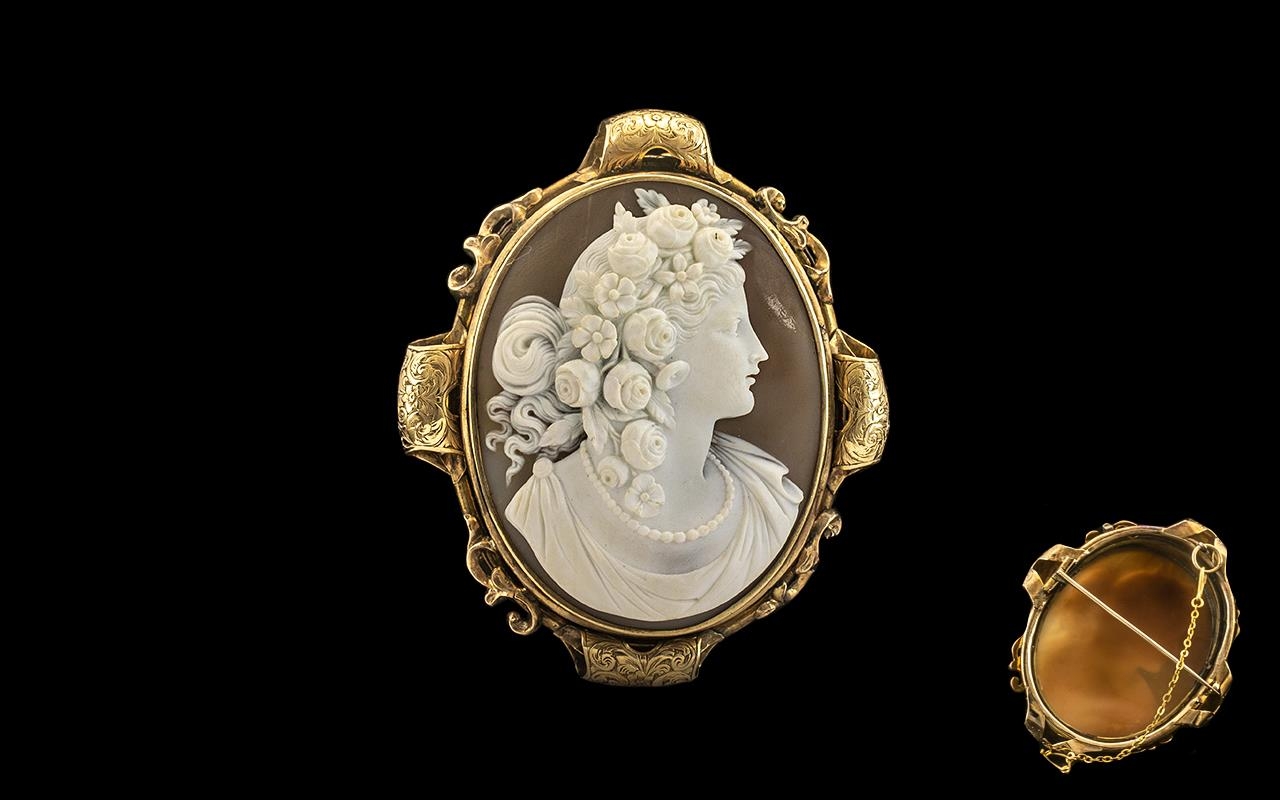 Victorian Italian Shell Cameo Brooch of fine quality depicting a maiden facing right, set in an unmarked 9ct gold mount with chased and scroll decoration. Measures 66 x 56 mm. Complete with safety chain.