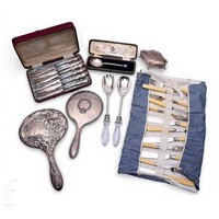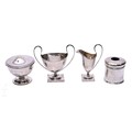 An Edward VII silver twin handled sweetmeat bowl, T H Hazlewood & Co, Birmingham 1909, of ovoid footed form, with high loop handles and raised on square base, height 12.5cm, a pedestal cream jug, a hair tidy and a powder jar, the domed hinged cover with fitted mirror, weighable silver, 8.72ozt. (4)