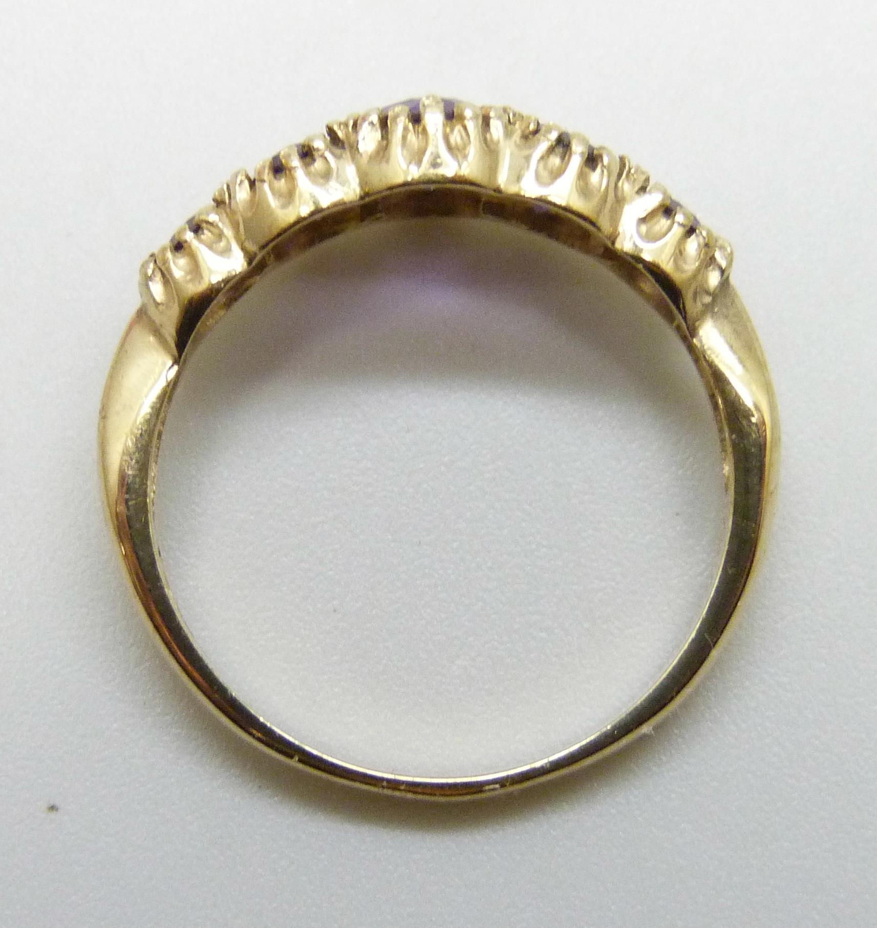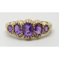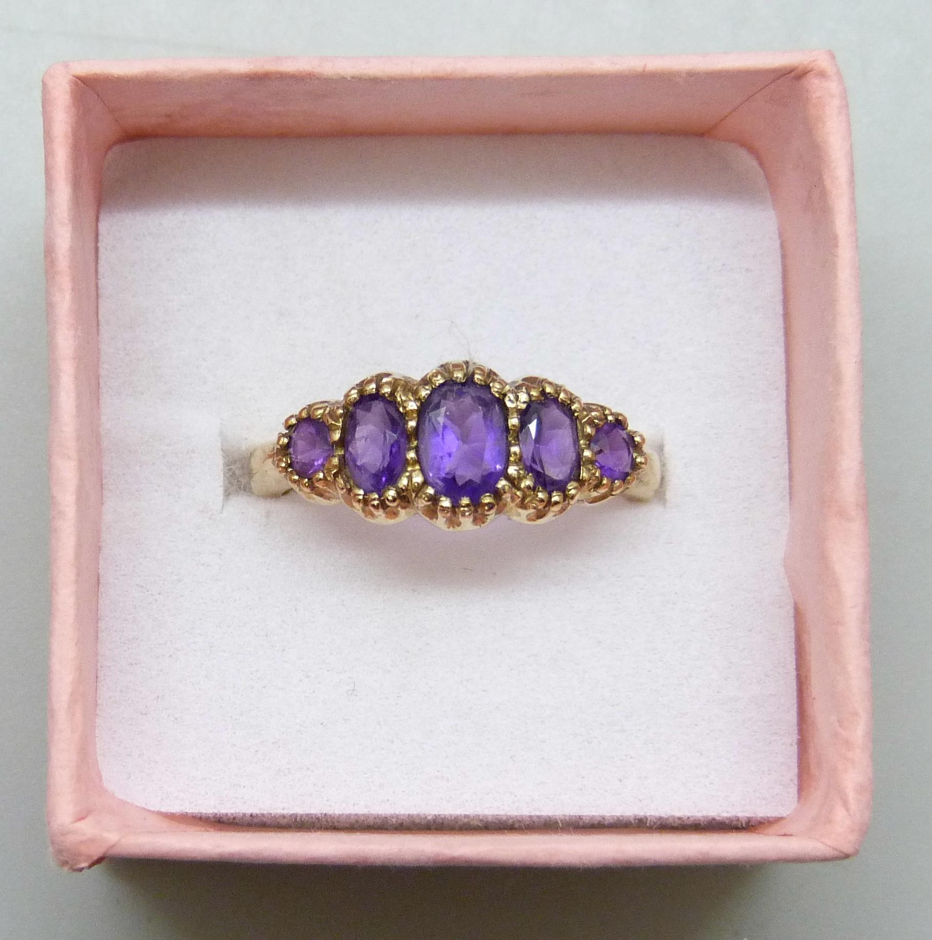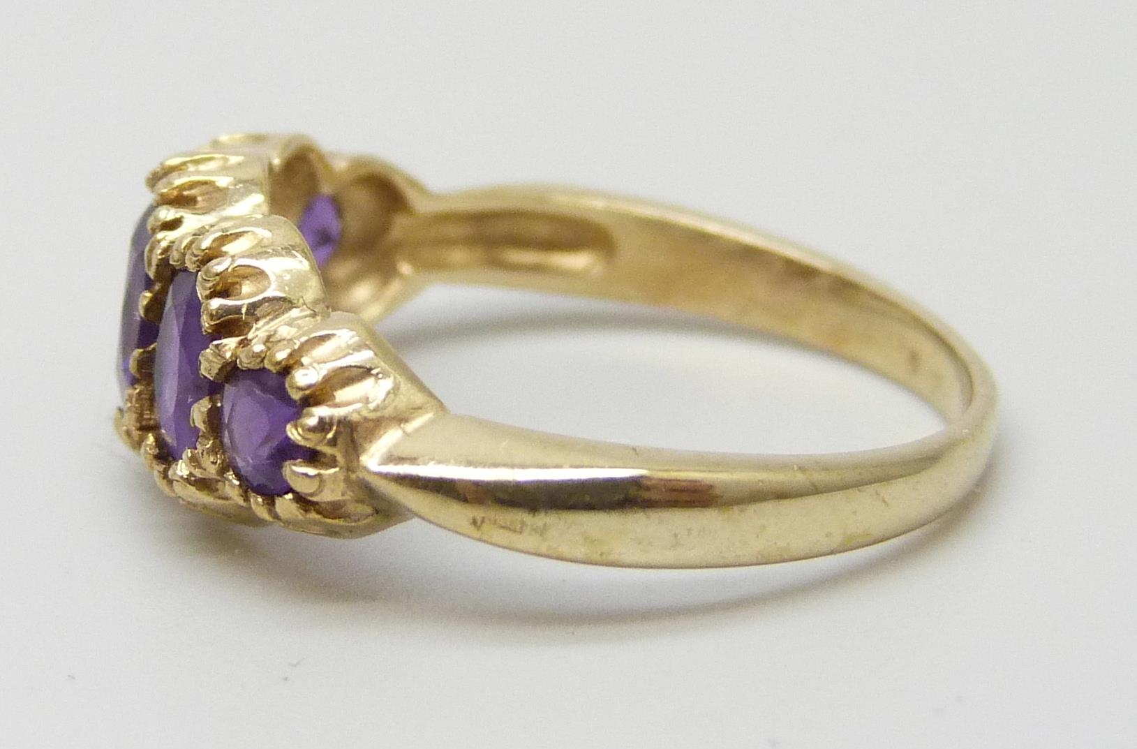 A 9ct gold five stone amethyst ring, 2.2g, N