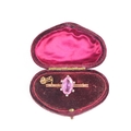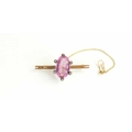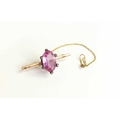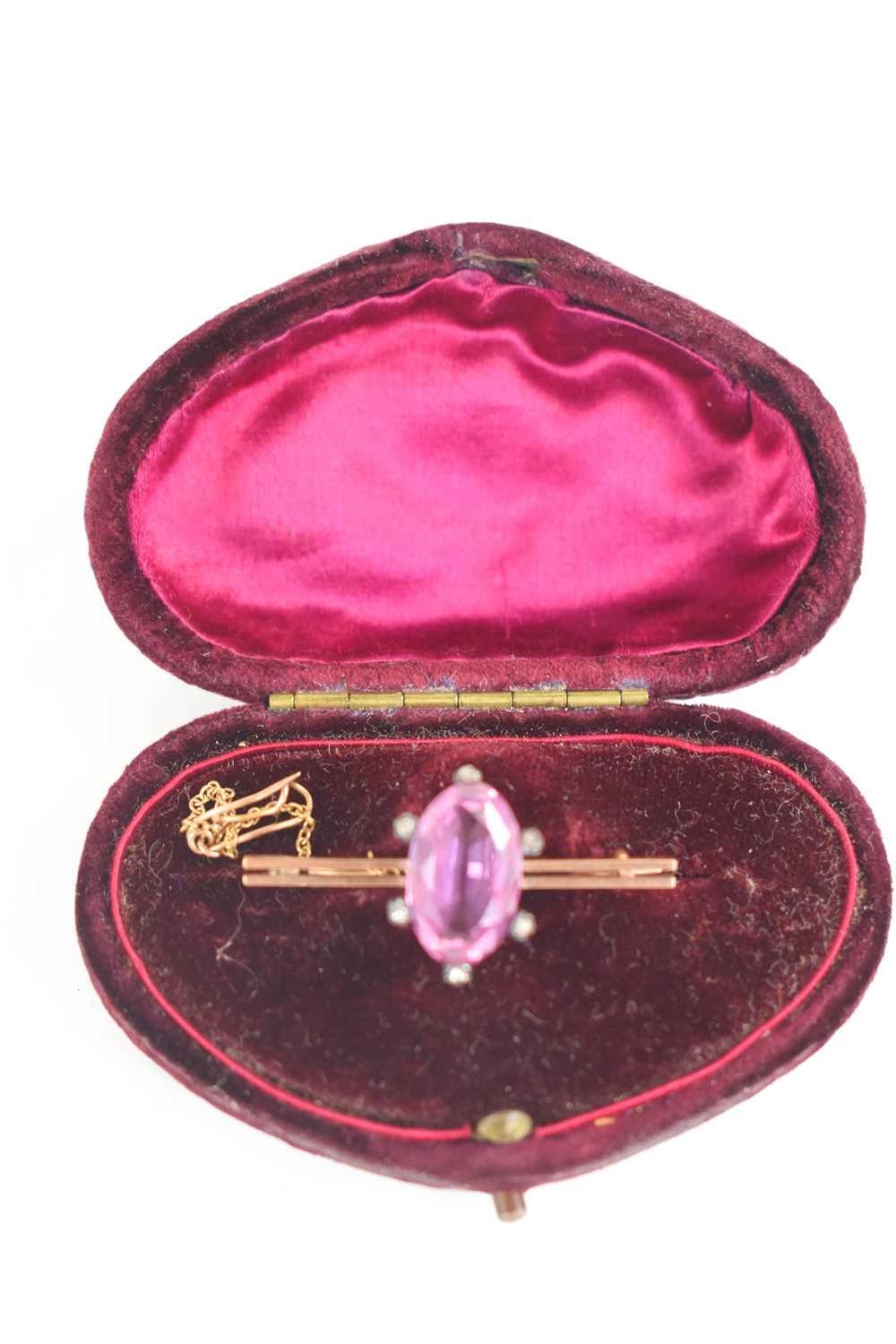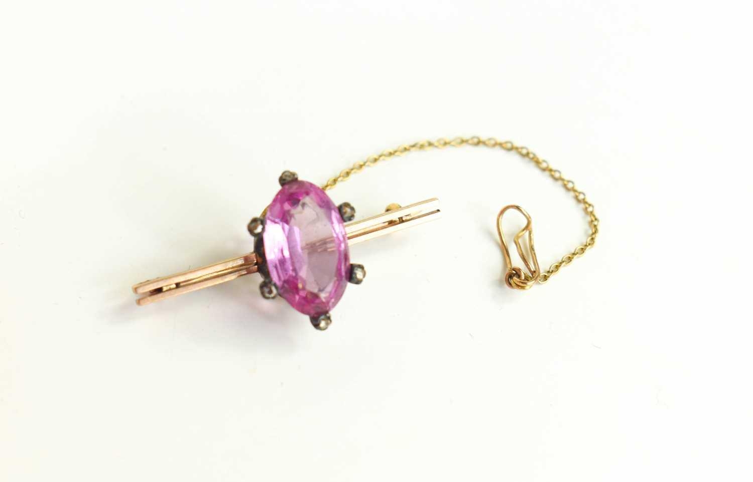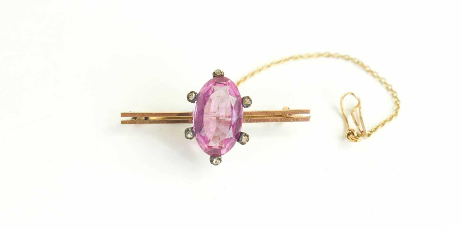 A 9ct gold, pink stone, possibly topaz and old cut diamond brooch, the coronet setting likely Georgian from an earlier ring, set with central marquise cut stone of approximately 9 by 15mm, surrounded by six small old cut diamonds, on later bar brooch, total weight 3.36g.