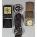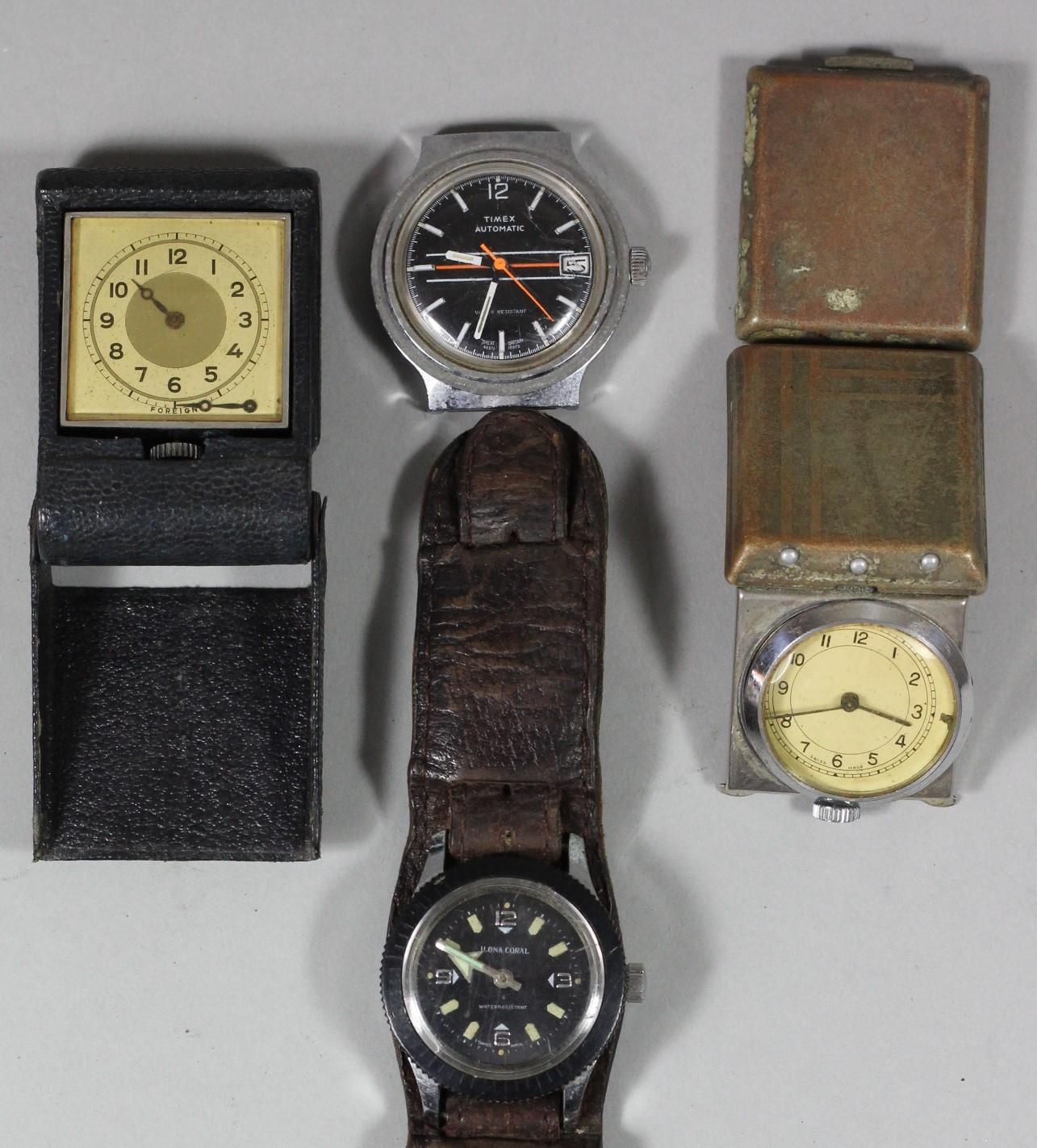 An Ilona Coral stainless steel wristwatch, a Timex automatic wristwatch, two travelling watches and a green box stamped rolex.