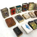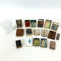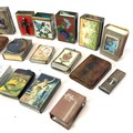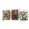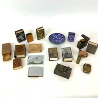 Collection of matchbox cases including cloisonné, faux tortoise shell, mother of pearl and a silver cigar cutter.