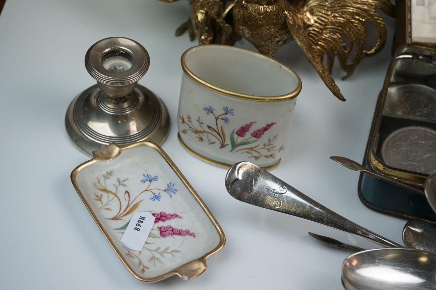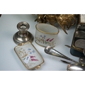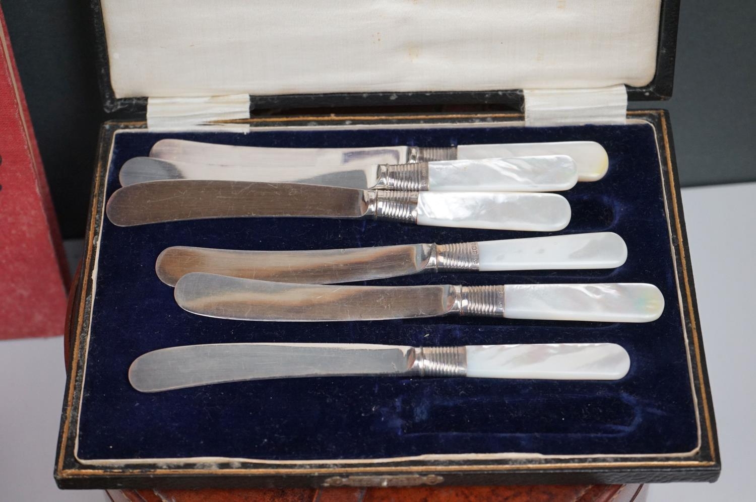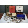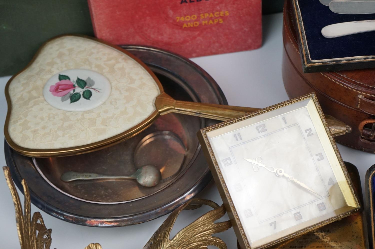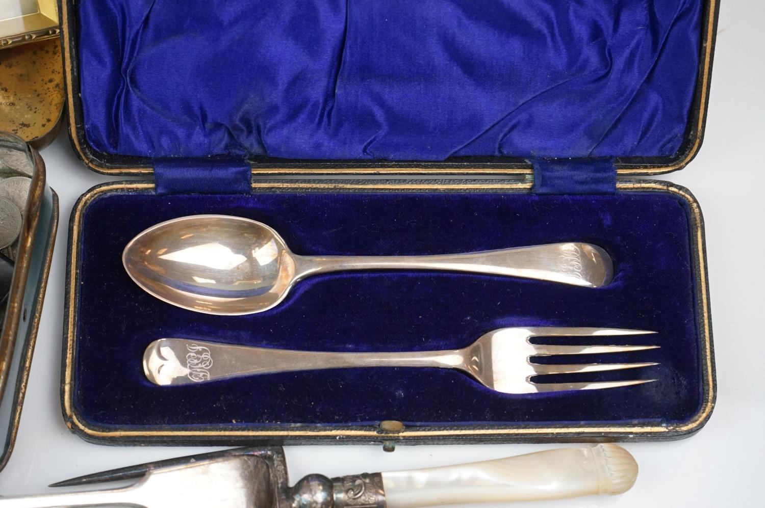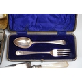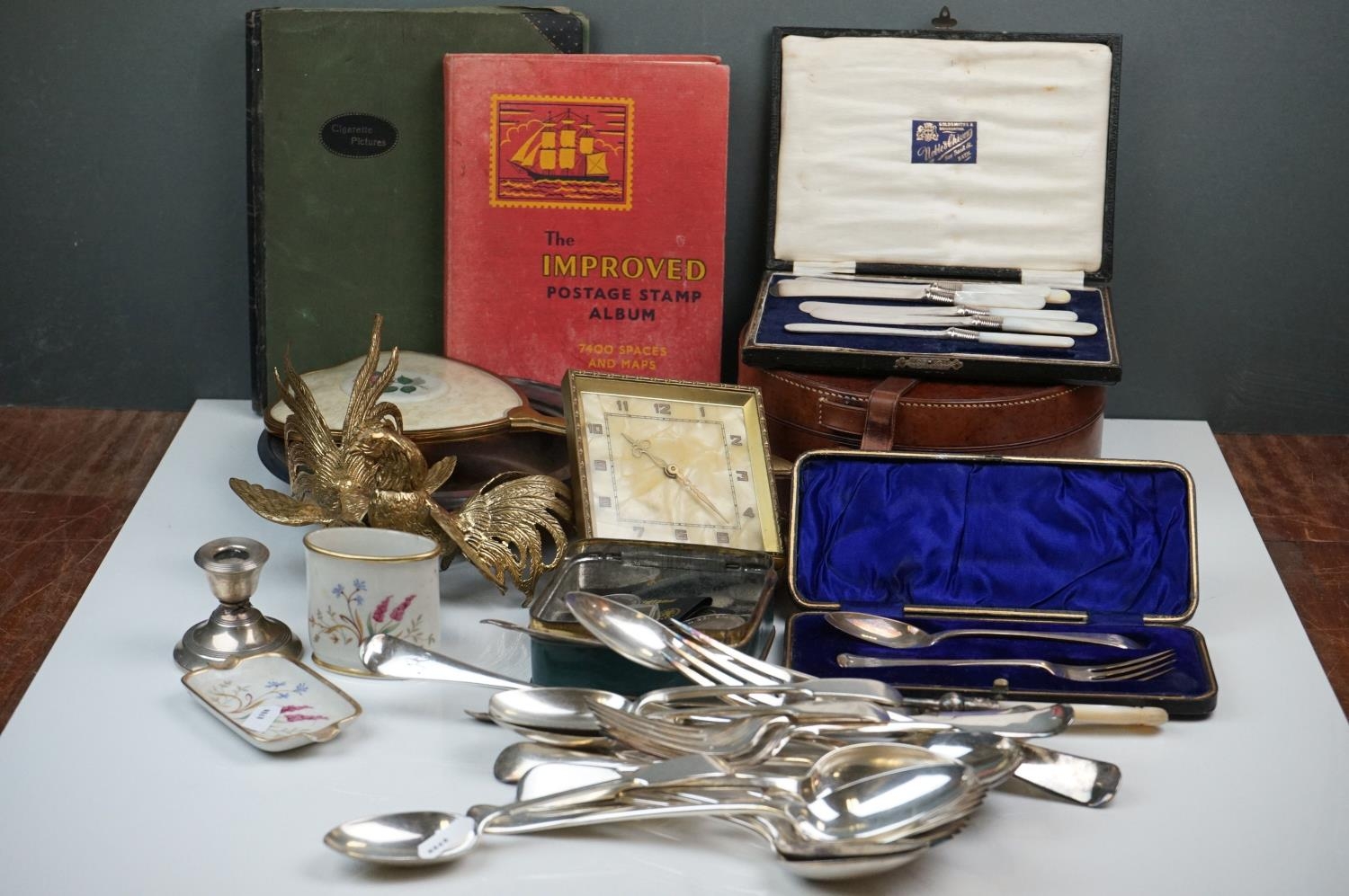A box of mixed collectables to include a hallmarked silver candlestick, a cased hallmarked silver fork and spoon set, silver plated cutlery, leather collar box and a quantity of stamps and cigarette cards.